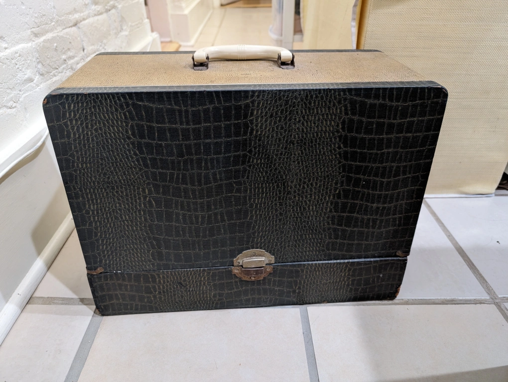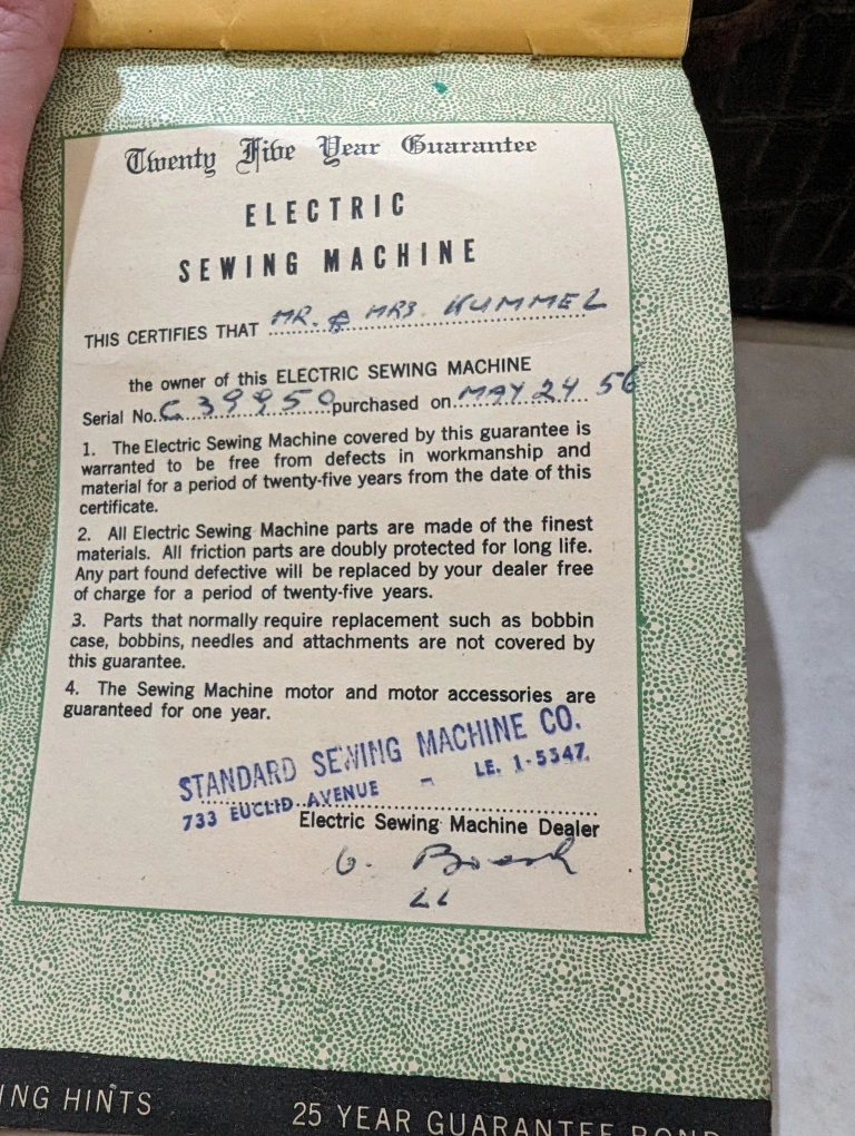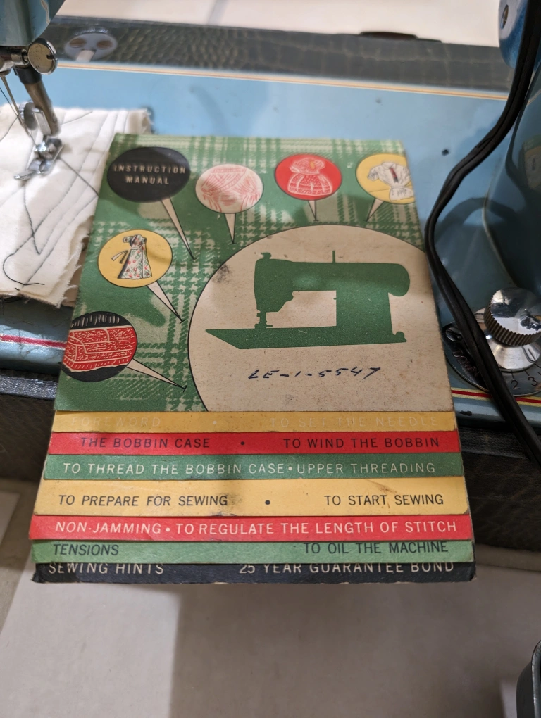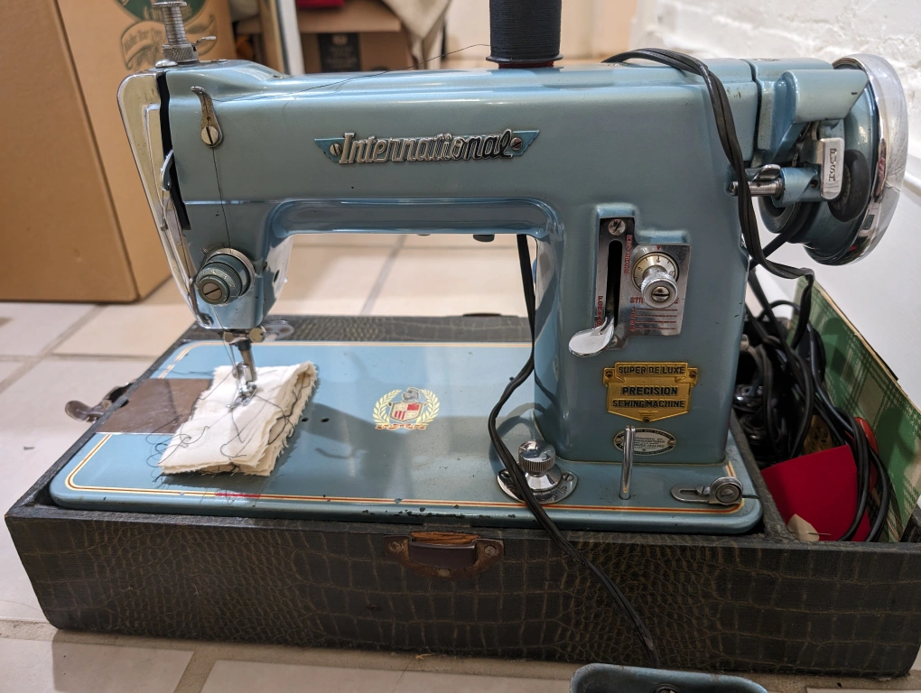 HEAVY. all metal 1956 international straight stitch sewing machine. beautiful blue colour. contains original instructions and record of original purchase from 1956. made in Canada. great piece of history. the foot pedal needs some work as there is a hole (pictured). I think copper tape would do the trick.