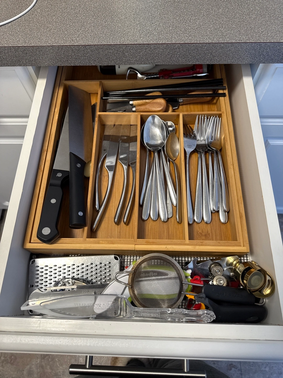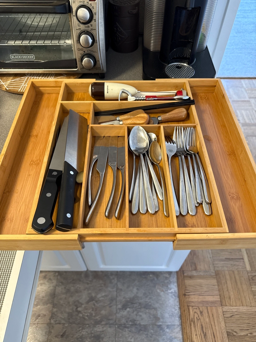 Bamboo utensil tray. Fits neatly into a drawer or can be widened for larger drawer. Includes compartments for knives, forks, spoons, and other kitchen tools. Great for organizing your kitchen.