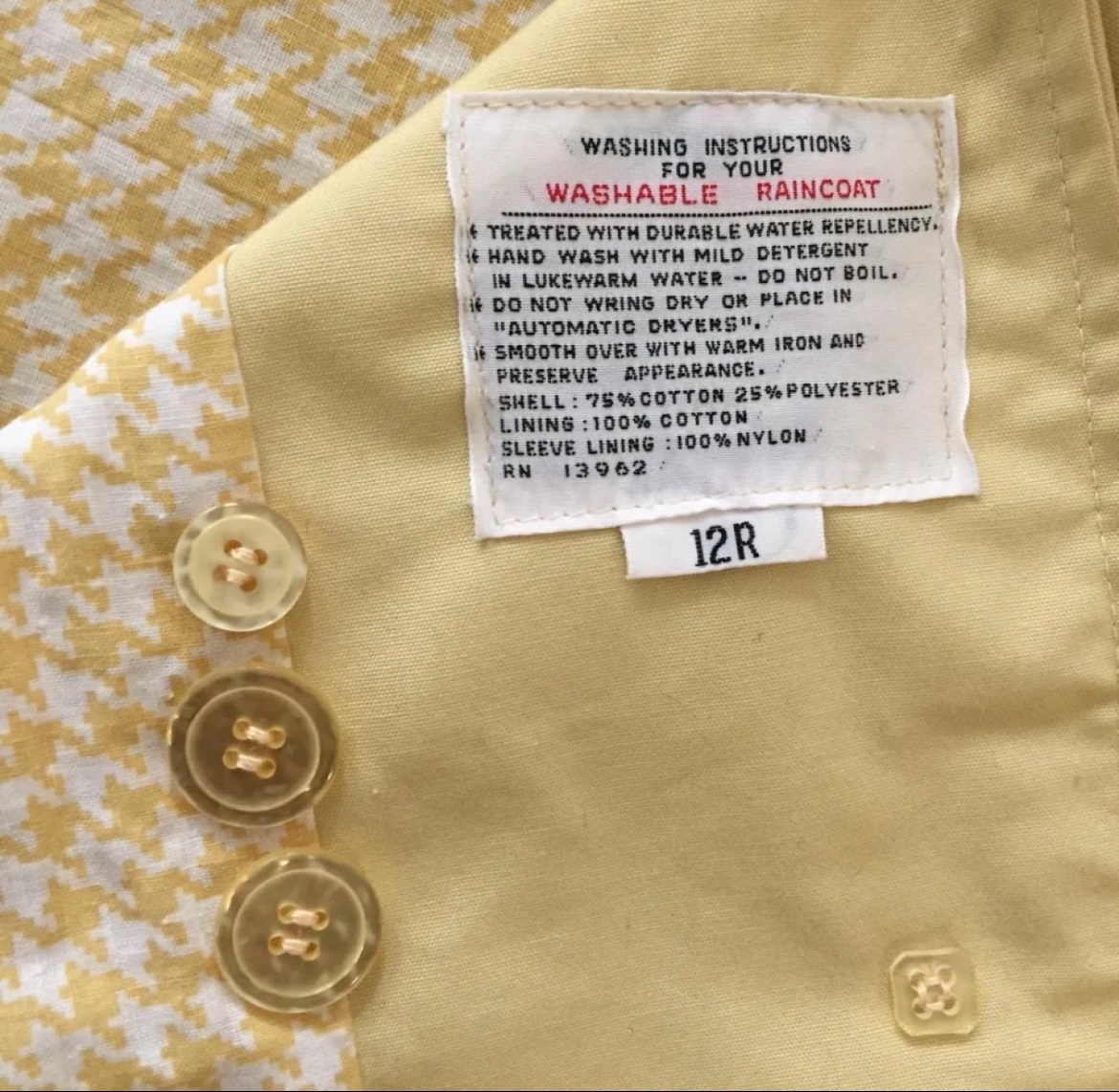 Vintage raincoat in near mint condition. Size 12R, and would fit a M-XL based on how loose you want the fit to be. The original seller mentioned a few small stains (I've included pics of all of them), but I really had to look to find them. Second picture is closest to the real colour. I believe I paid ~$100 for this