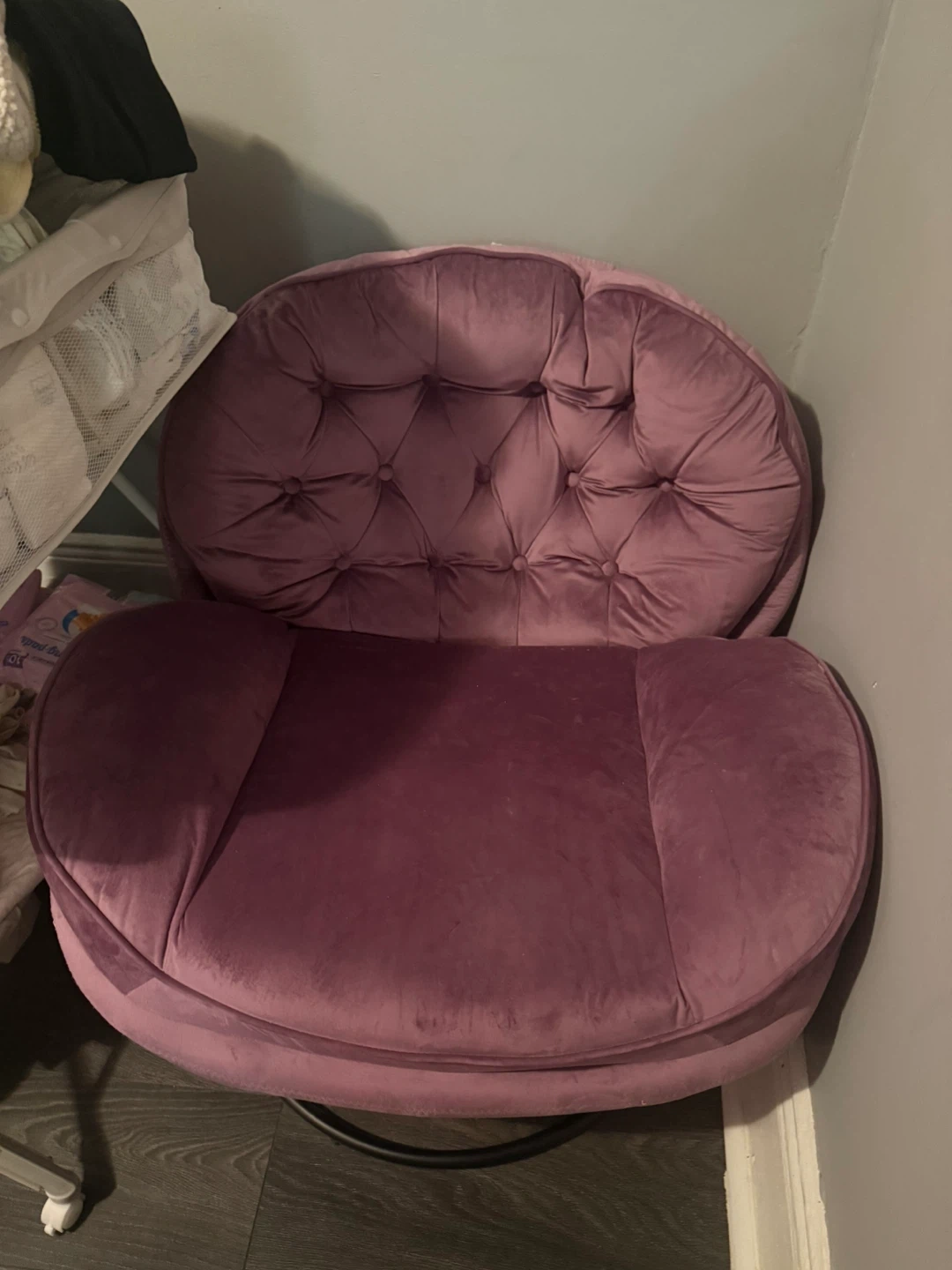 This accent chair features plush velvet upholstery with button tufting on the back. Its rounded shape offers a comfortable and stylish seating option. It's a lovely addition to a nursery or living space!