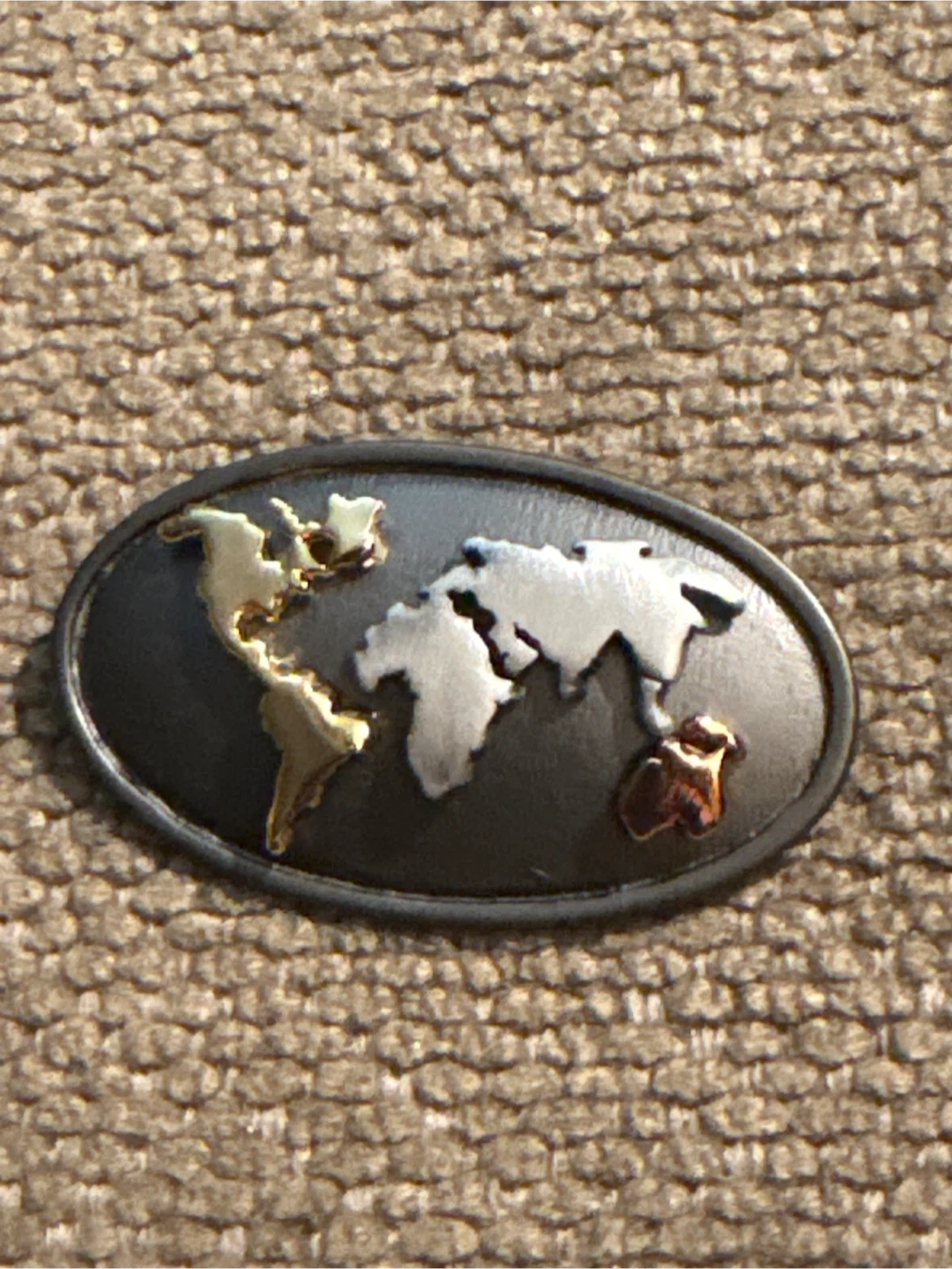 π Oval brooch with a world map design. Features gold, silver, and copper-toned continents against a dark background. It has a pin backing for attachment.