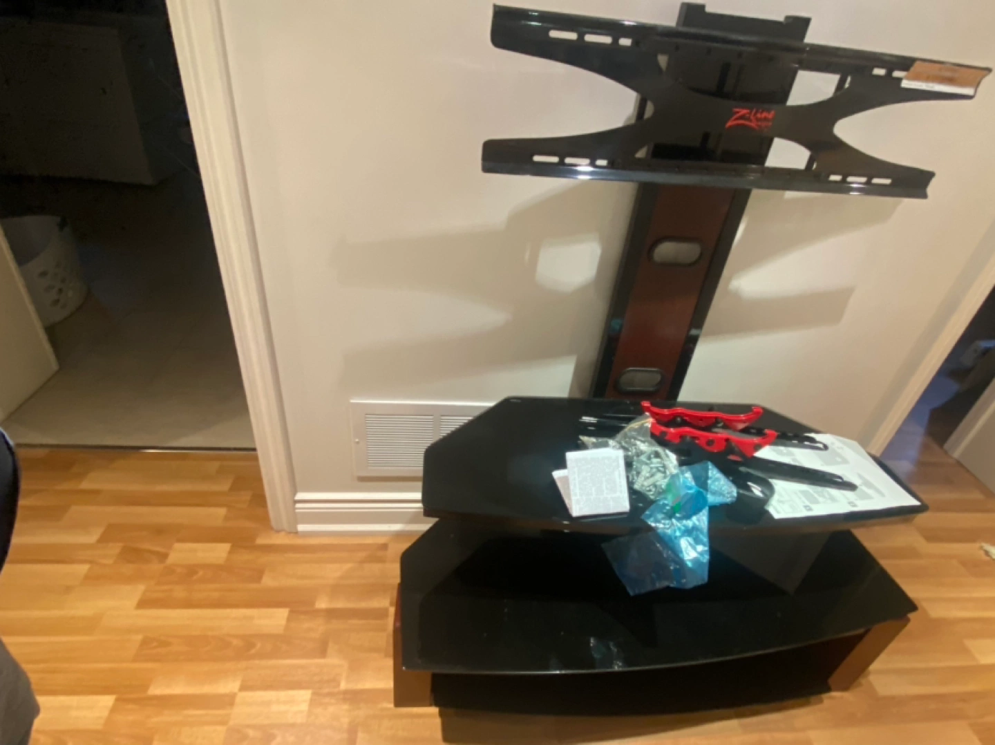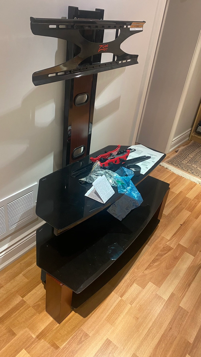 Purchased at Best Buy about 10-12 years ago. Assembled it and used it for large screen tv and high end stereo eqpt. Adjustable tv height and tilt.