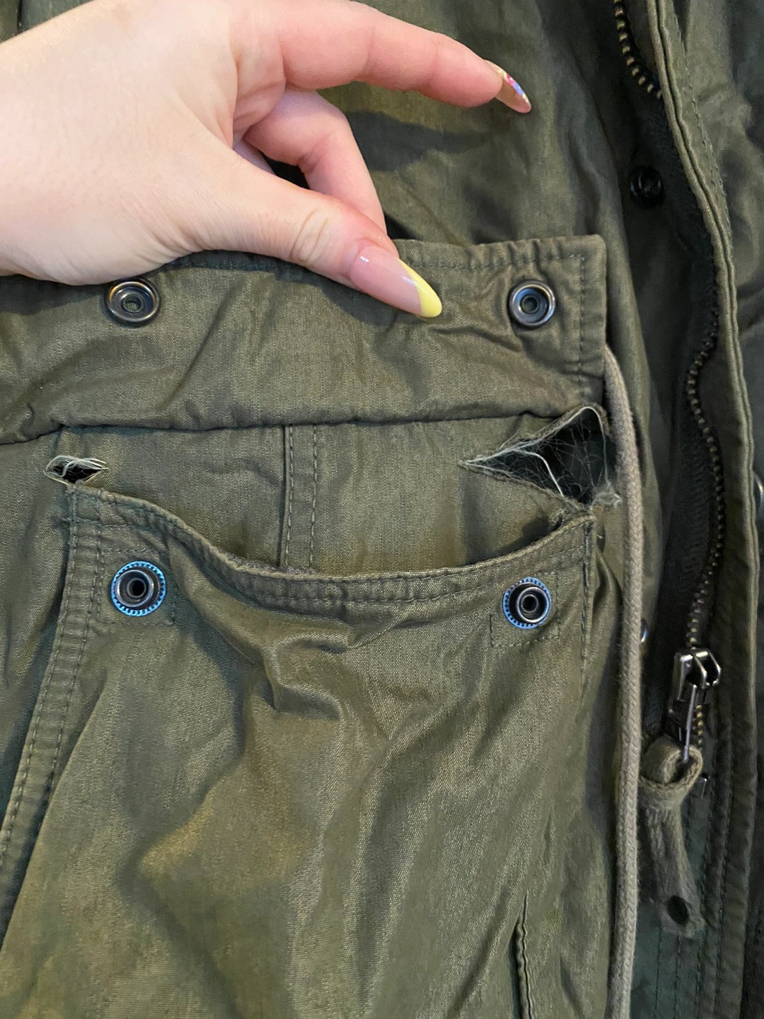 Please see rips on the pockets, other than that it’s really good for layering and the wind.
