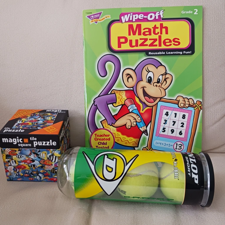 Three items available: Magic Square Puzzle (all 36 pieces included + instructions) 3 Dunlop tennis balls Wipe-Off Math Puzzled Grade 2 book