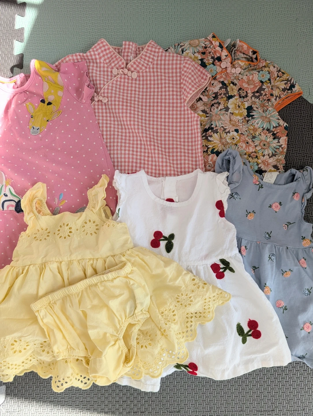 Collection of 6 baby girl dresses, most in EUC. Pink Baby Boden dress has a small stain shown in the second photo. Bottom 3 dresses are 6-12 months, top 3 are for 12-18 months. All for $10.