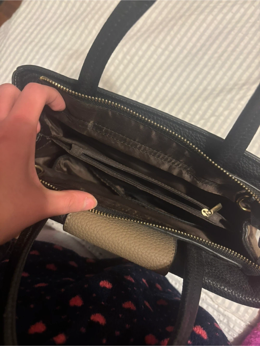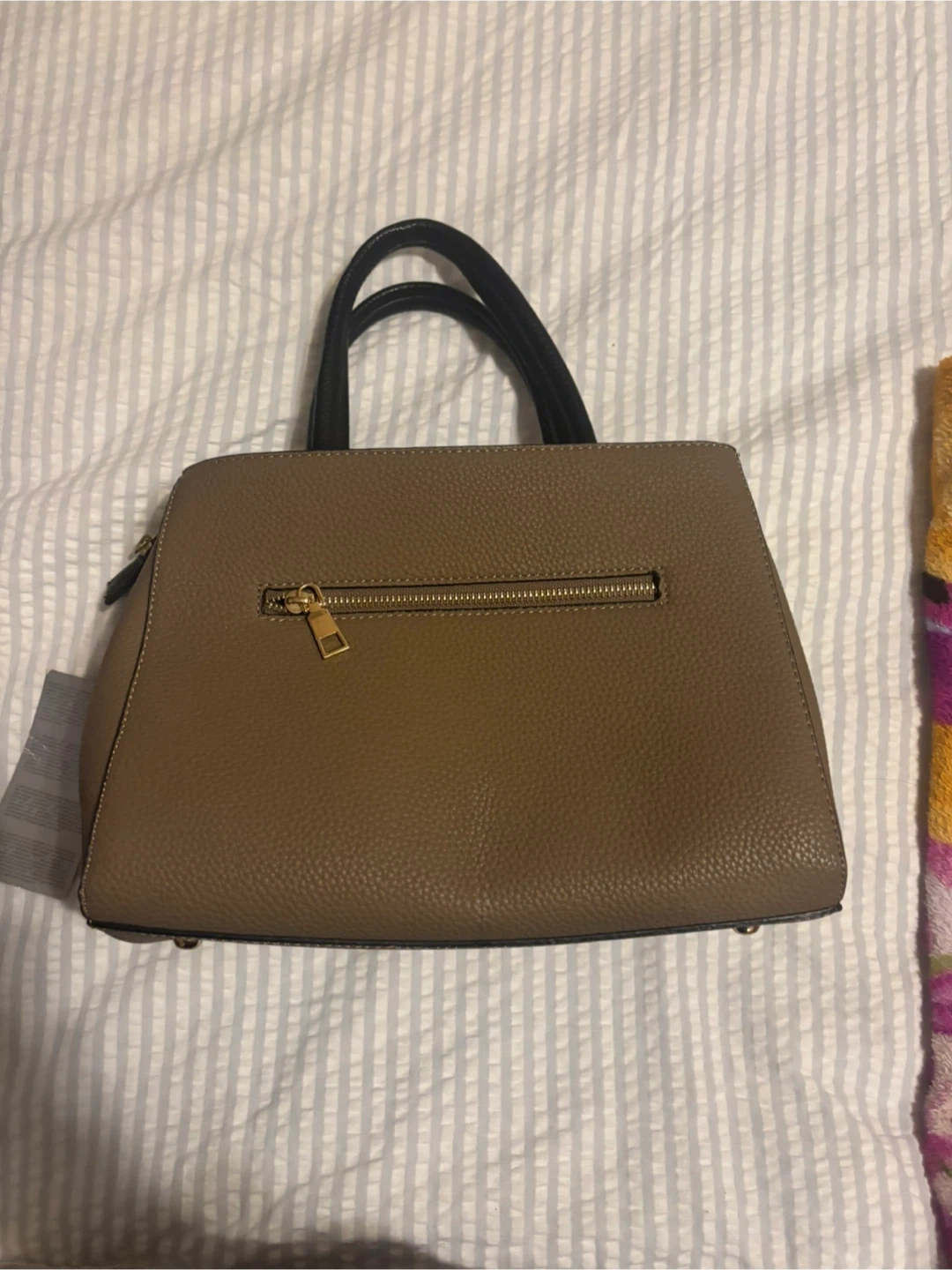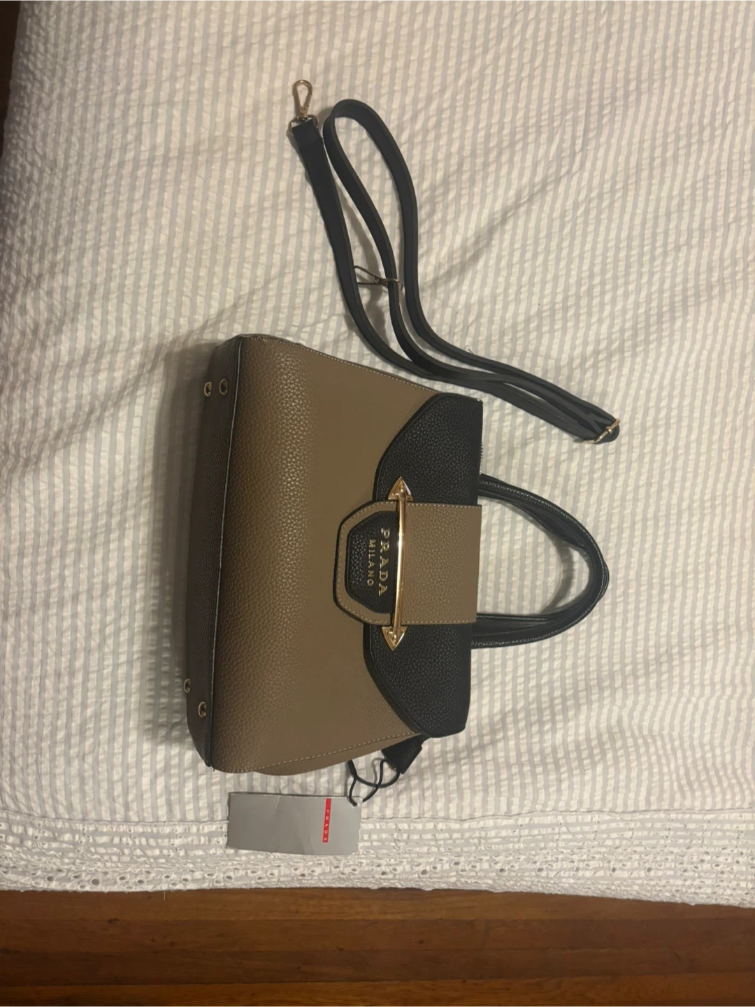 This is a Prada Milano handbag in beige and black. It has some wear on the corners, but is otherwise in good condition.