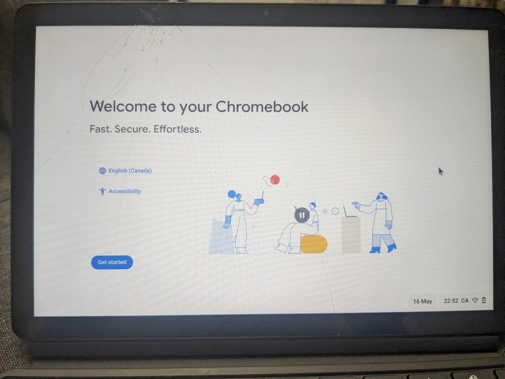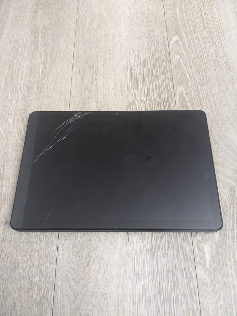 The screen crack is not visible when the screen is ON. Great battery life. USB C type charger not included.