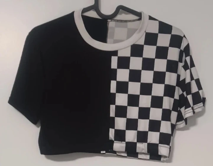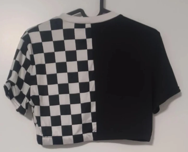 Rad-cycled from a body-suit, this cute crop top features a half-checkered and half-black pattern. With an elastic waist band you can wear on its own or layered it's perfect to add bit of edge to your wardrobe!
