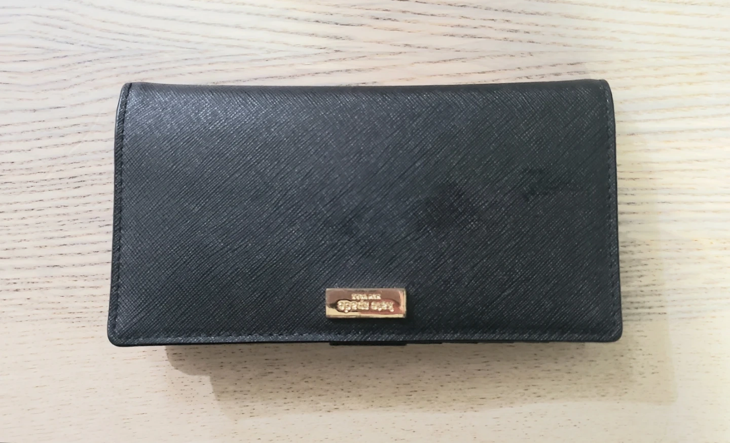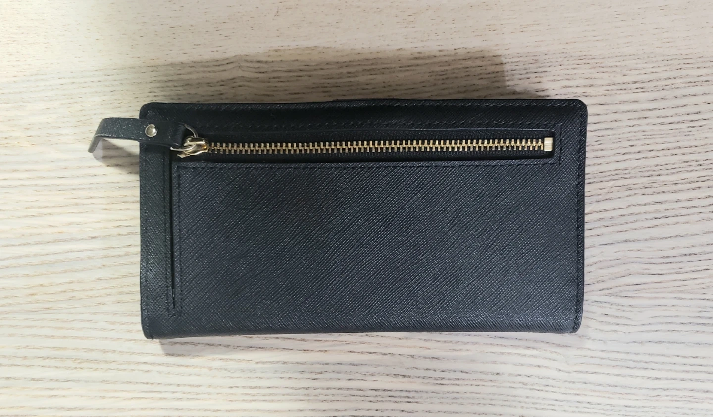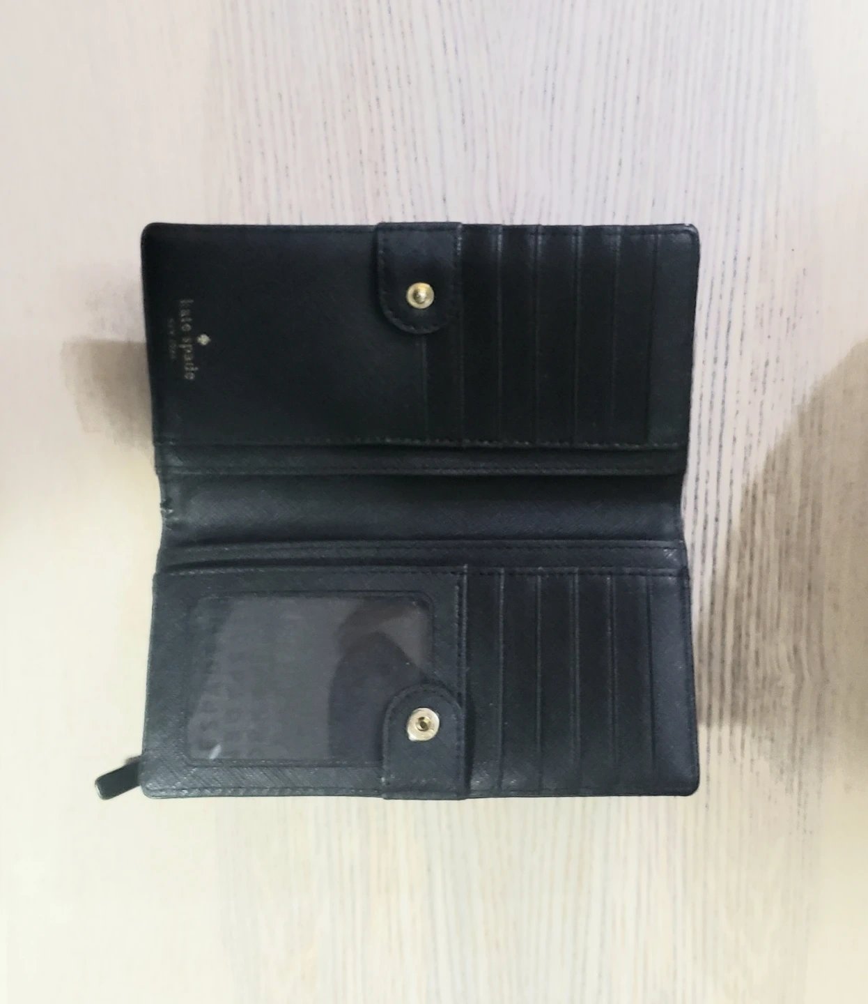 Kate Spade wallet in black saffiano leather. It has multiple card slots and a zippered coin pocket. A clear ID window is also included.