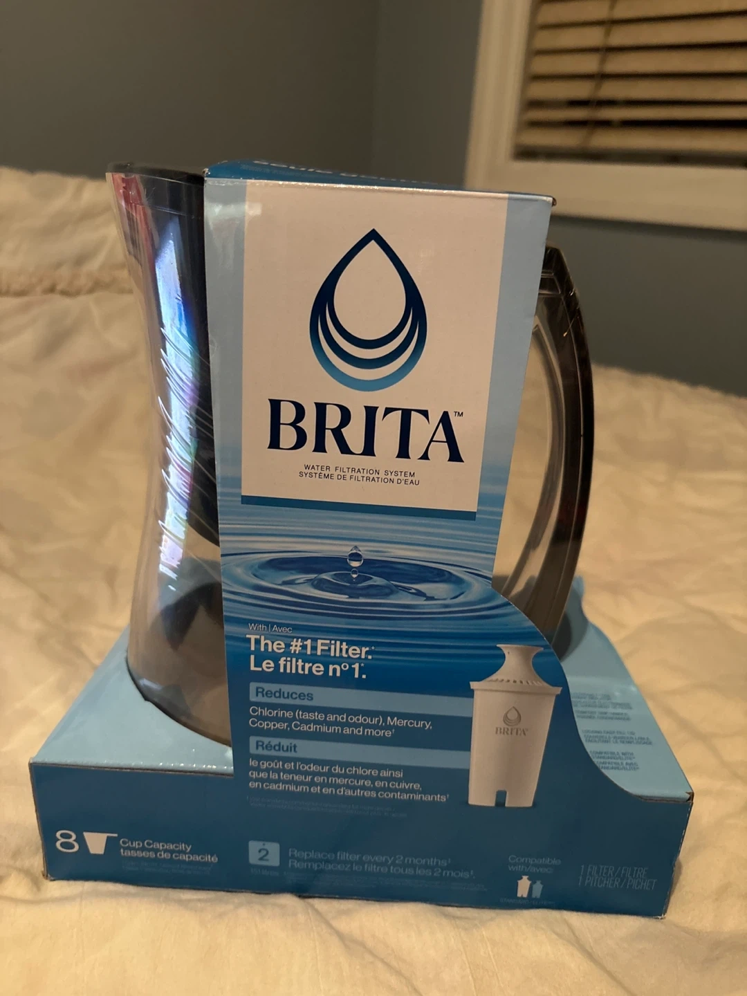 Brita water filtration system pitcher. It reduces chlorine (taste and odour), mercury, copper, cadmium, and more. The cup capacity is 8, and filters should be replaced every 2 months. Brand new. Never opened.
