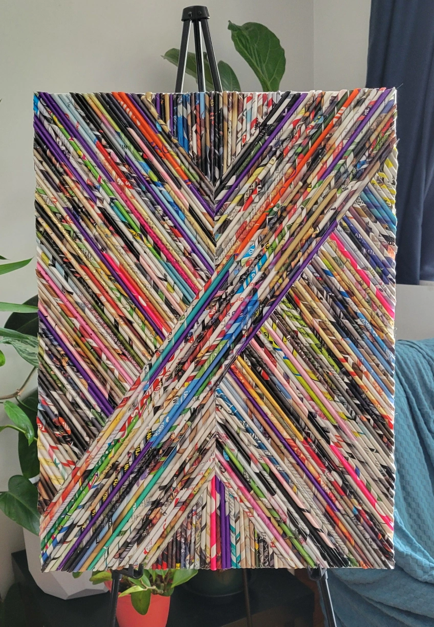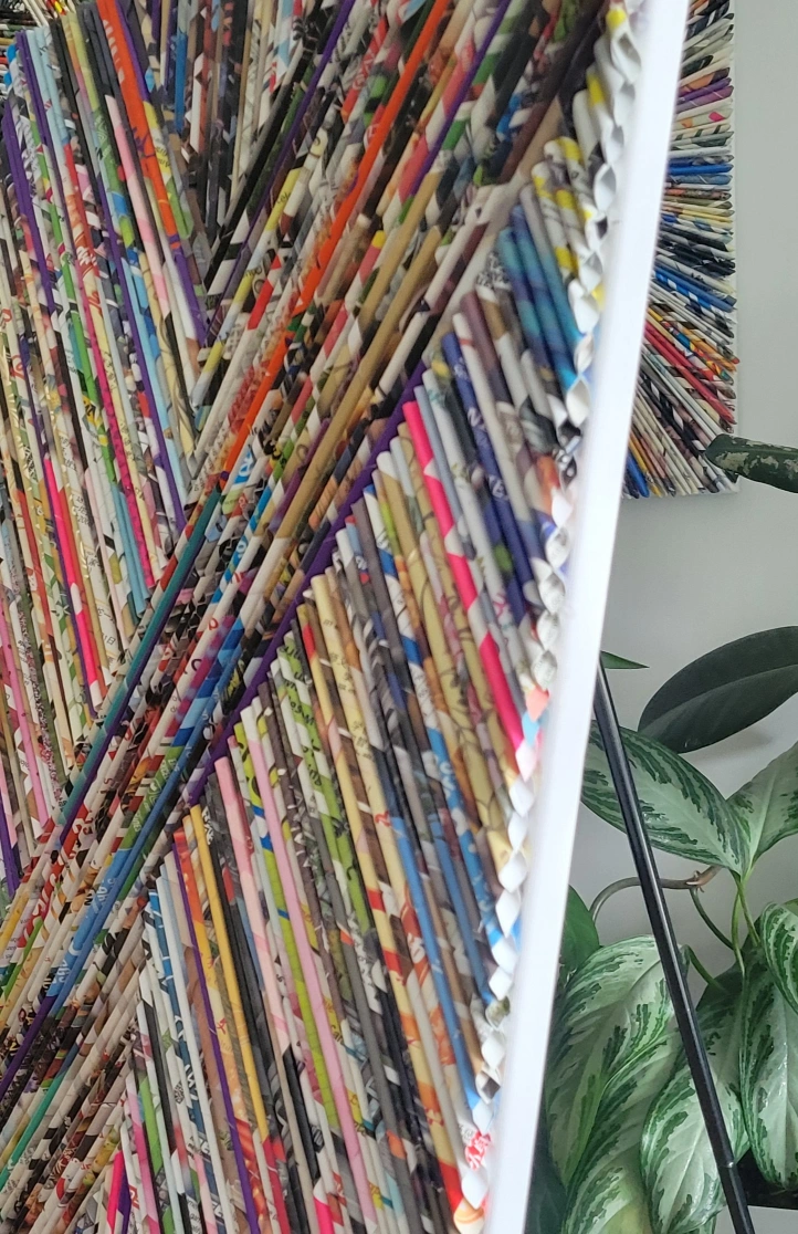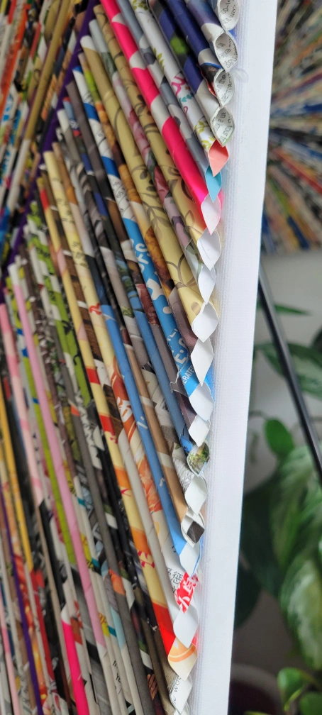 Unique wall art made from rolled magazine pages! This piece adds a pop of colour and texture to any room. It's a one-of-a-kind creation that's sure to be a conversation starter.