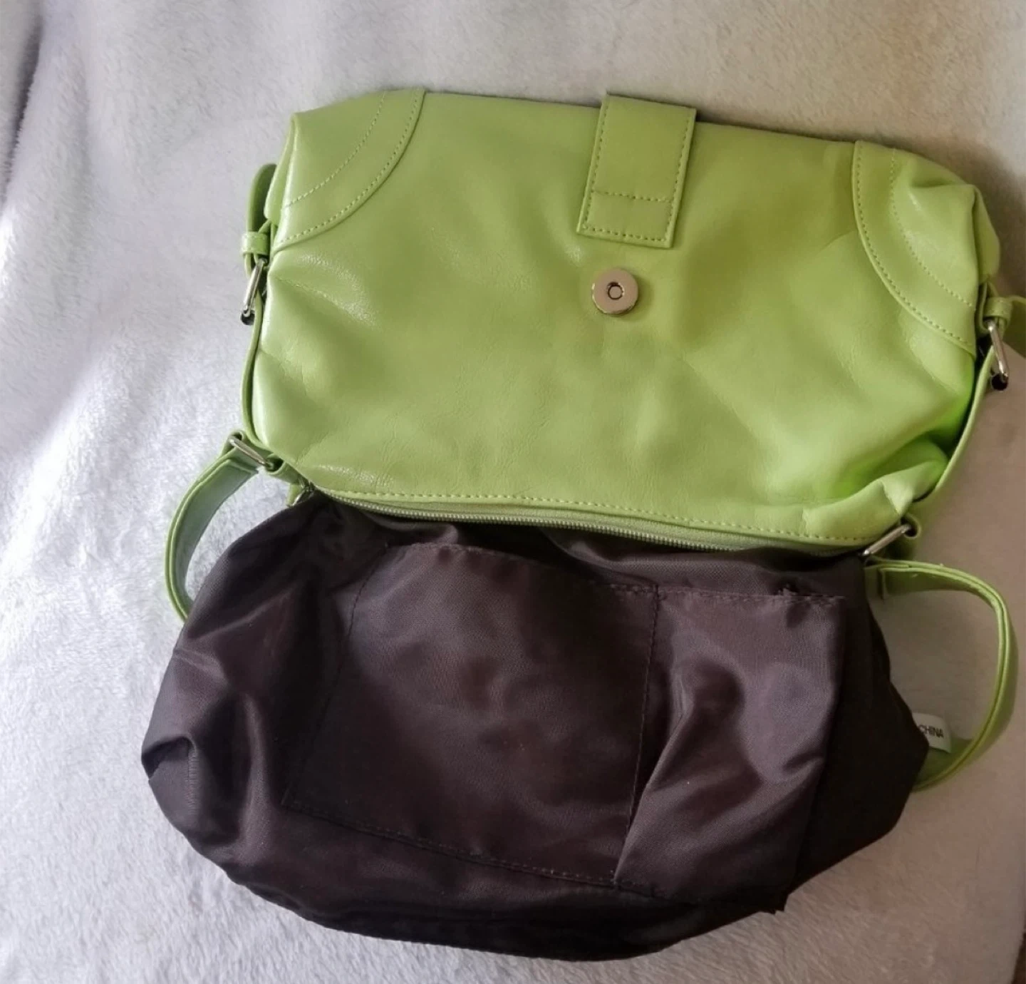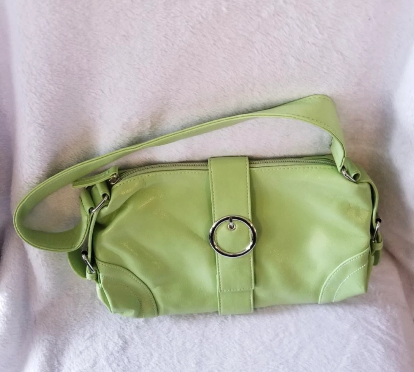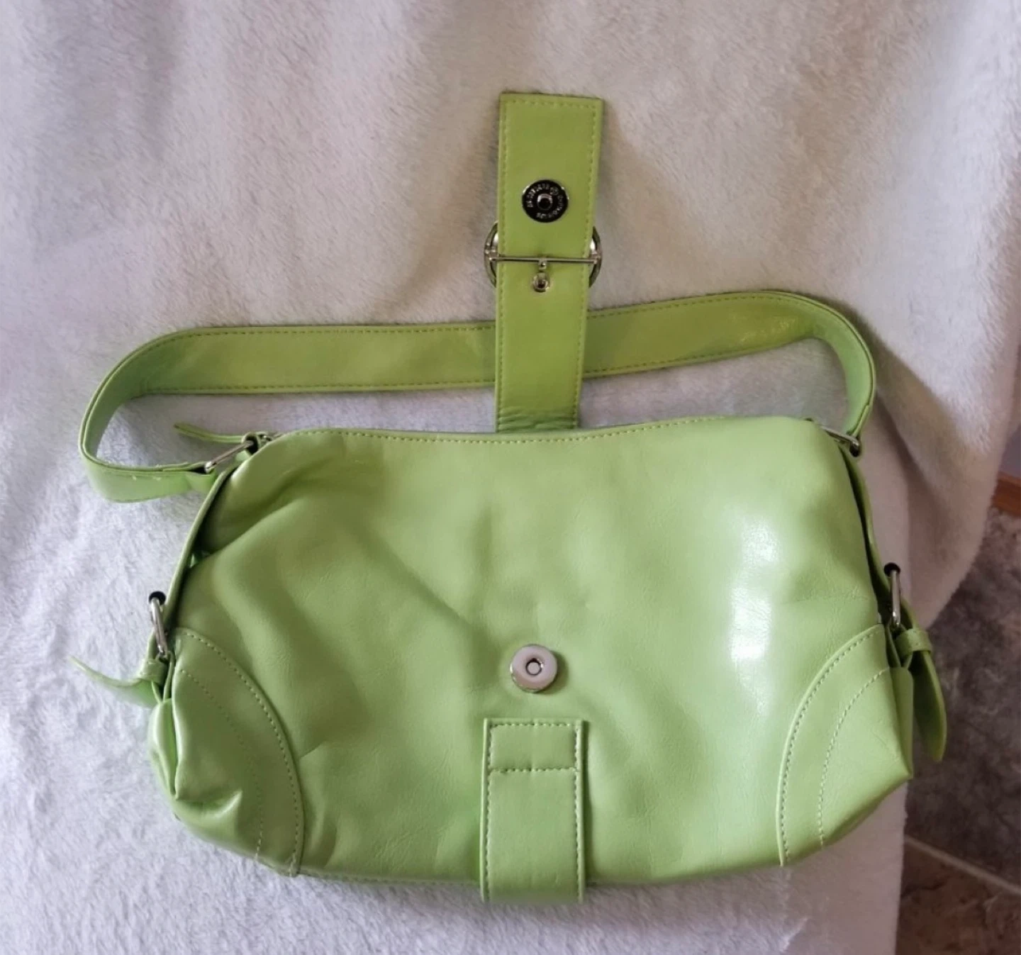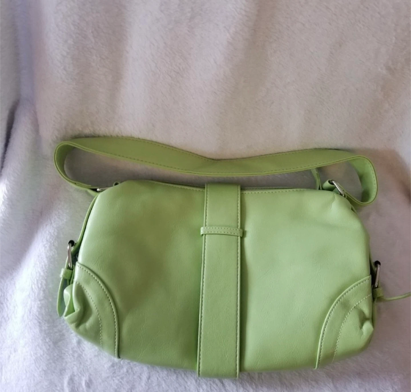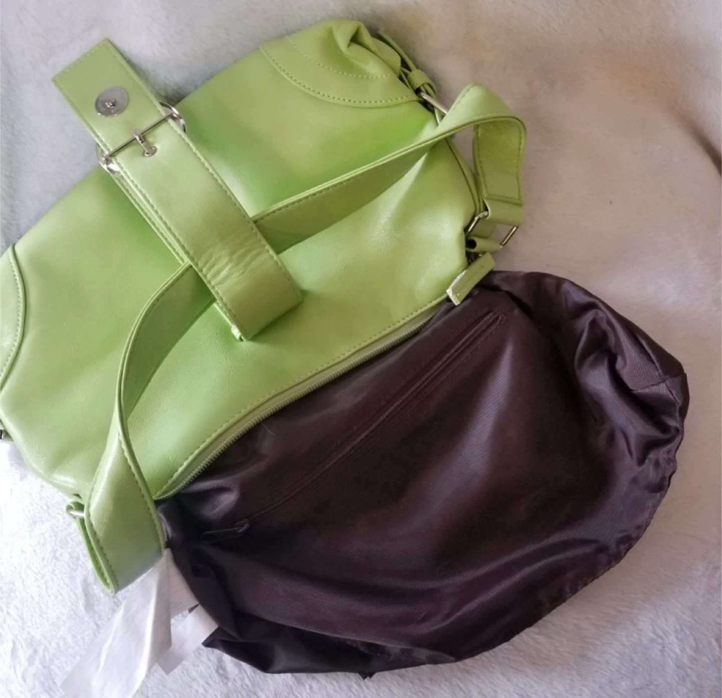 Neon lime green faux vegan leather with brown interior. Silver hardware. Interior has one zippered pocket and two slip pockets. Summer, neon, spring, color pop,