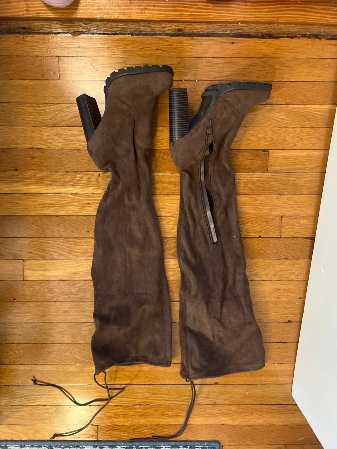 These are brown suede over-the-knee boots with a chunky heel. They feature a side zipper and decorative lacing at the back. The material appears to be faux suede.