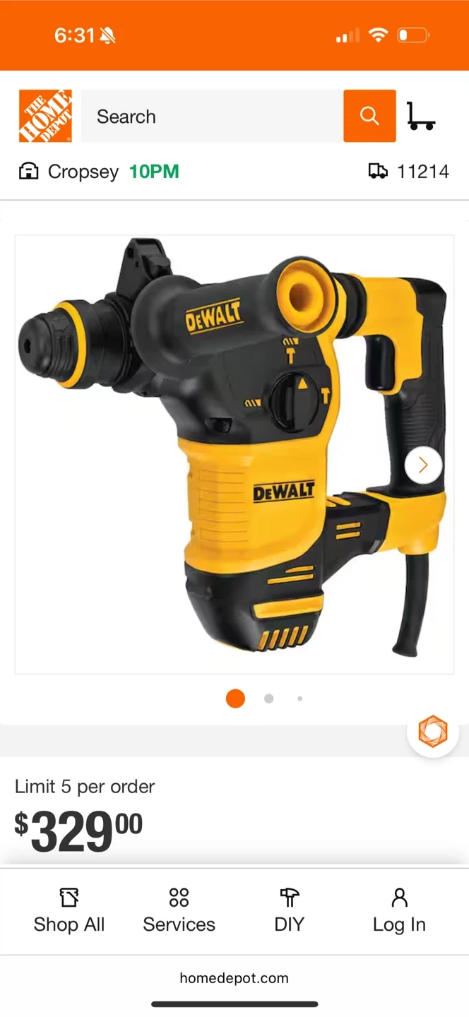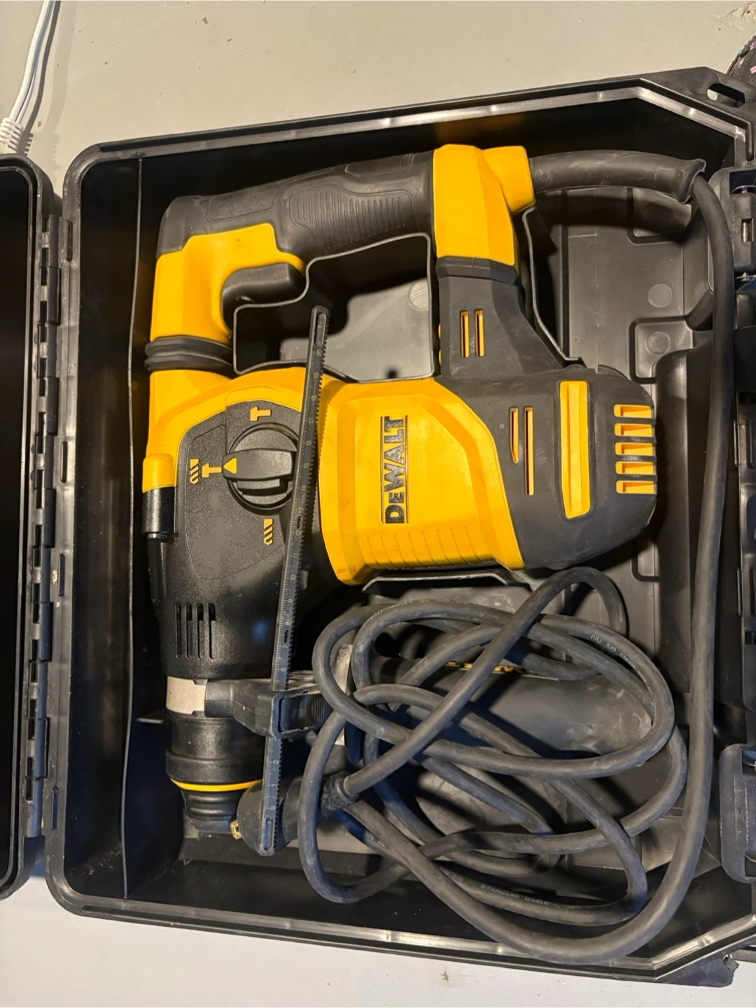 This DeWalt D25333 SDS rotary hammer drill features a durable German-engineered hammer mechanism and active vibration control. It offers 3.5 joules of impact energy for fast drilling. The drill comes with its original case. 120V AC, 60Hz power.