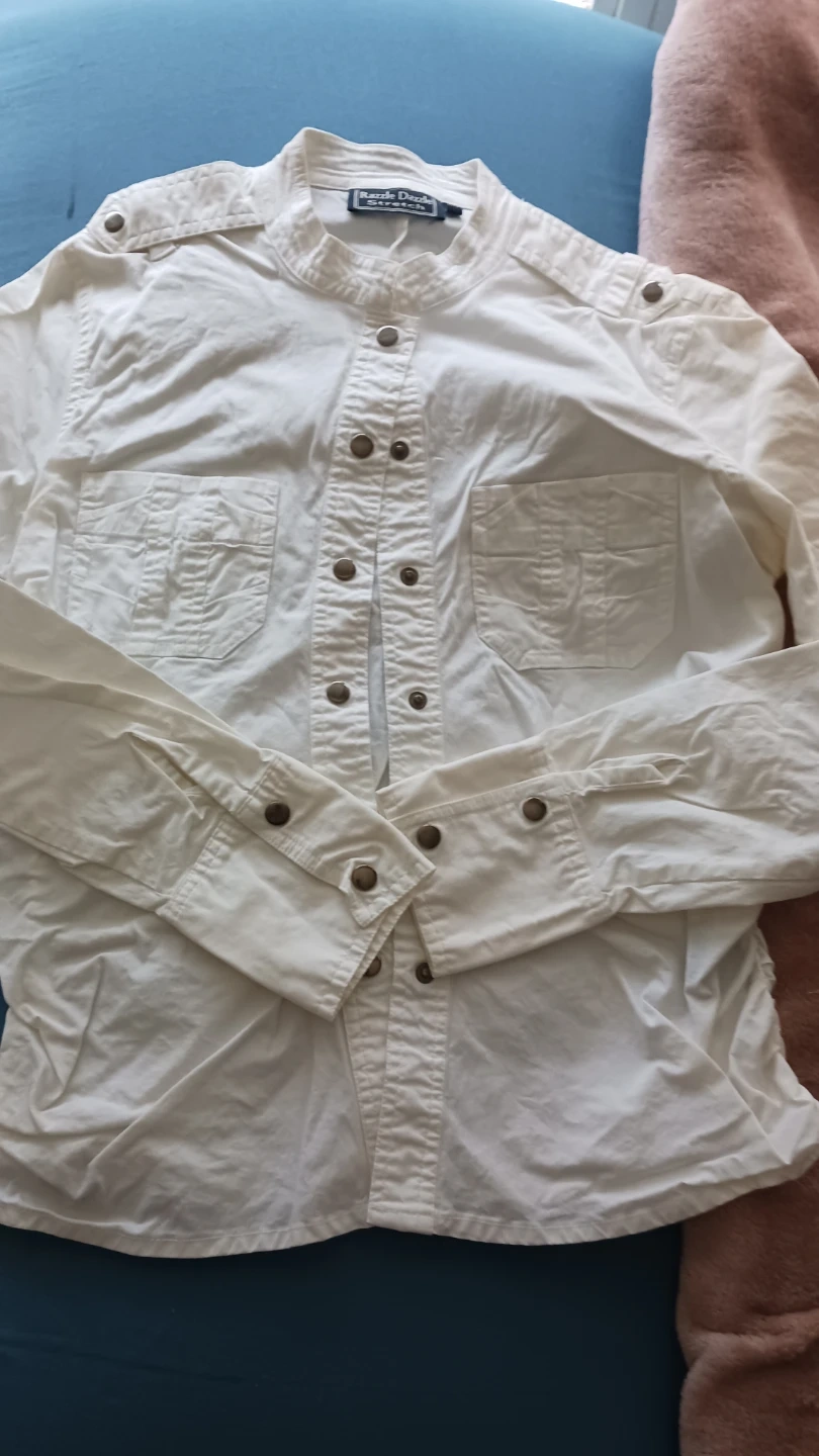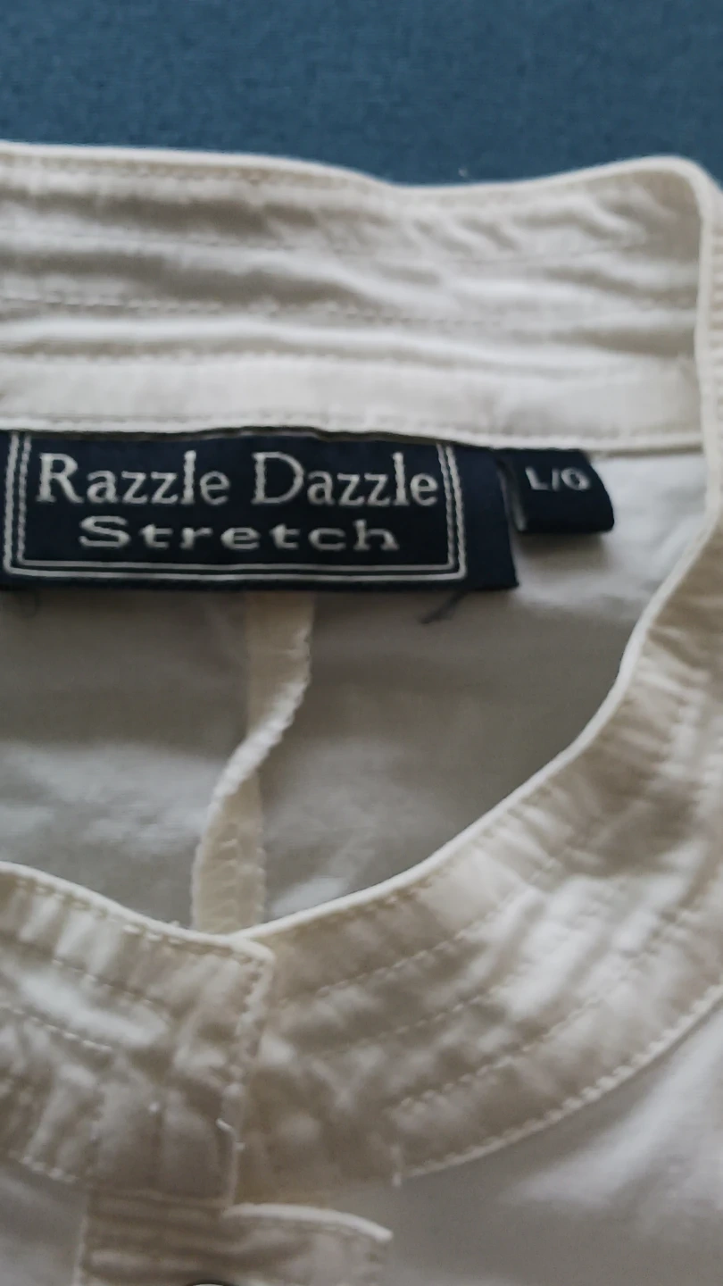This Razzle Dazzle white shirt features a stretch fabric for comfort. It has a button-up front and dual chest pockets.This shirt mimics a motorcycle jacket, very cool. This shirt is great for casual wear or dressing up!