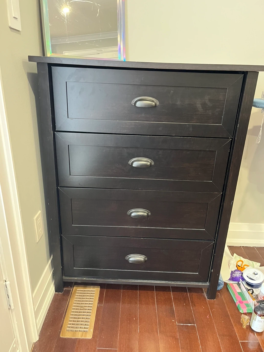 This is a black wood dresser with four drawers. It features metal cup handles on each drawer. Great for storing clothes or other household items.