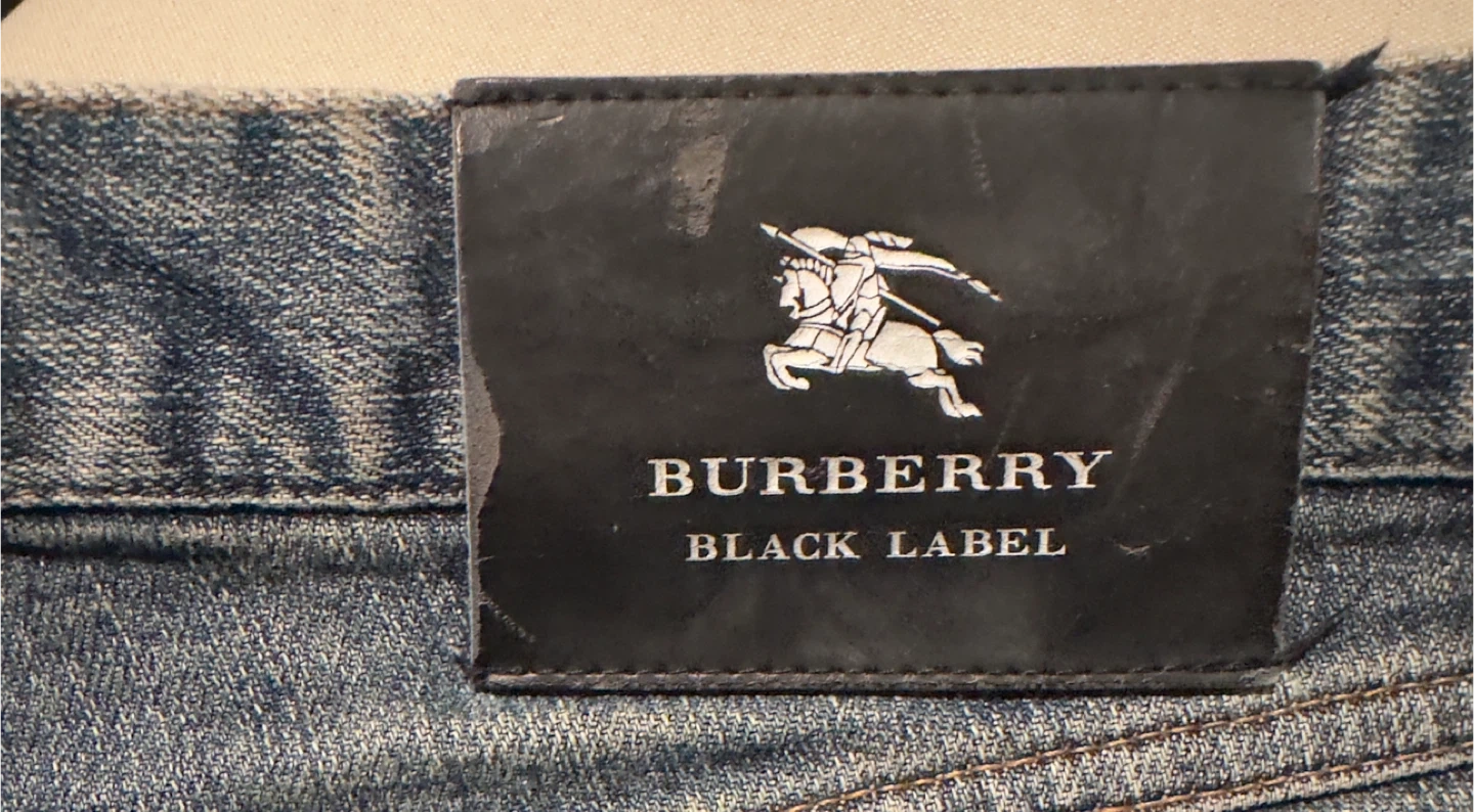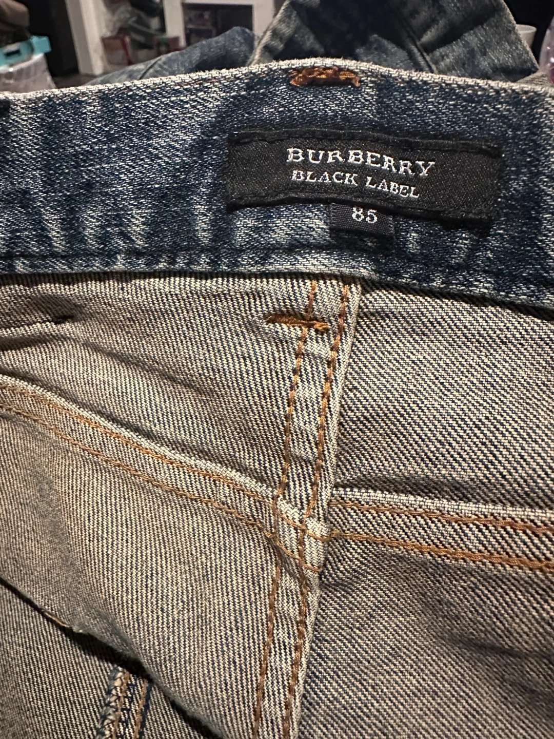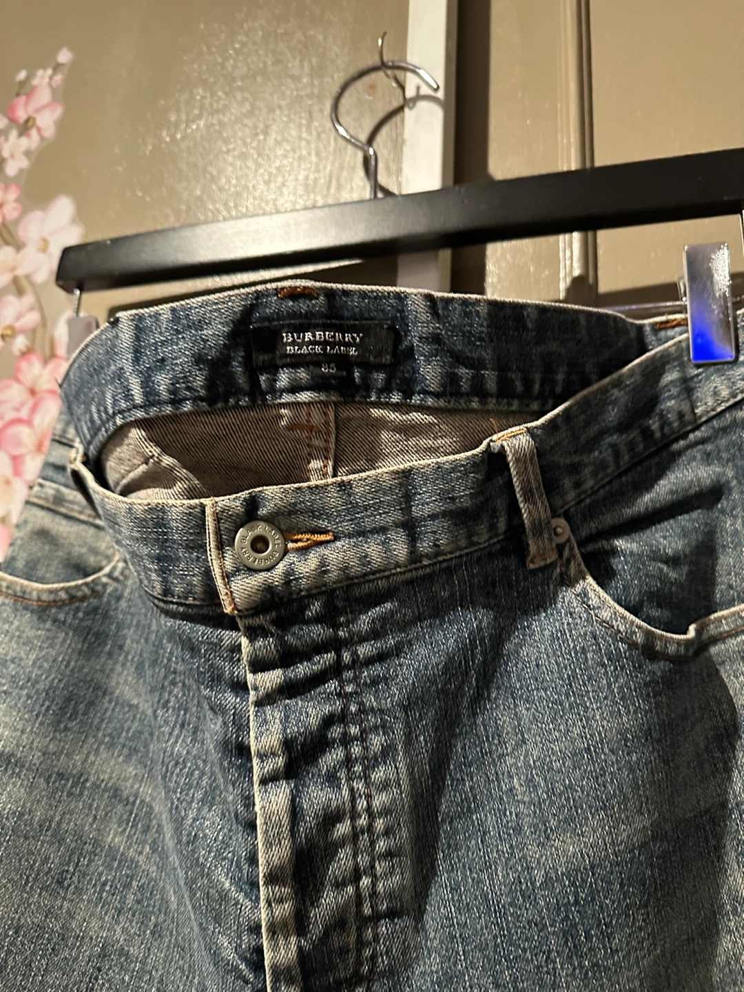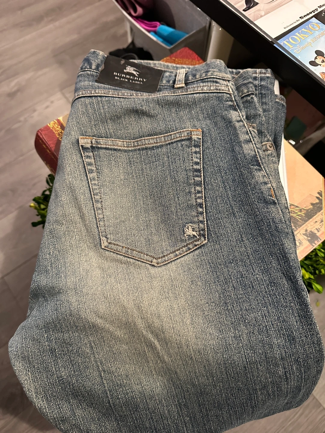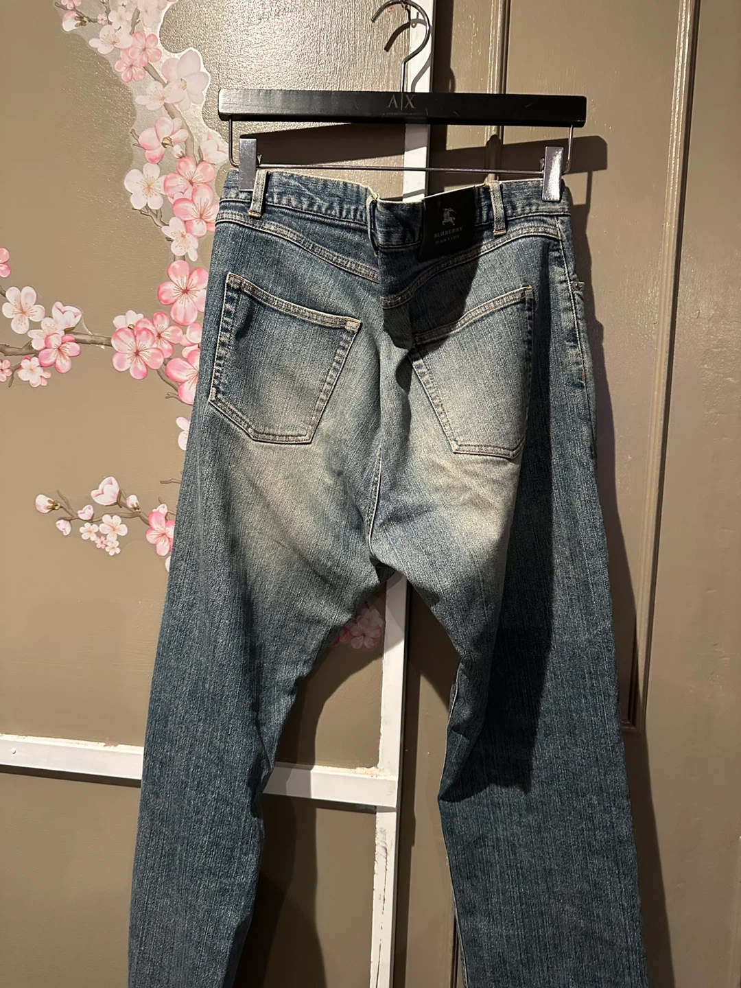 Classic blue wash jeans from Burberry Black Label. Features a distressed look with a rip on the left thigh.