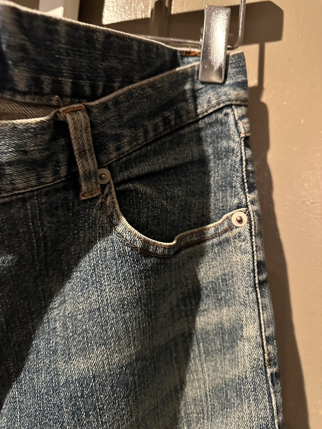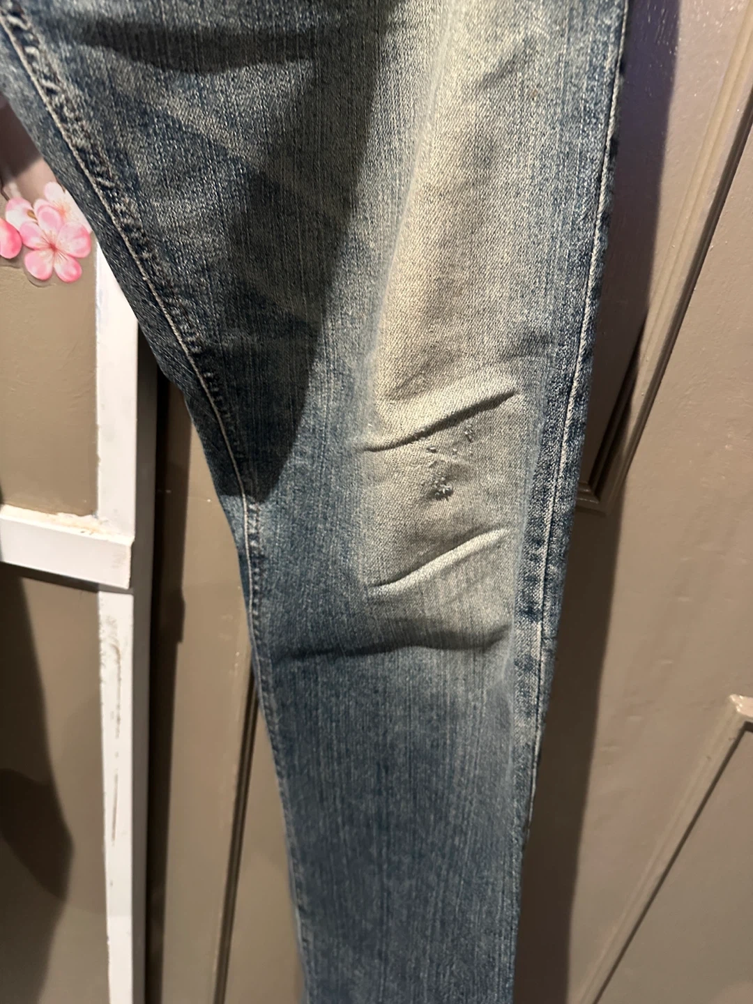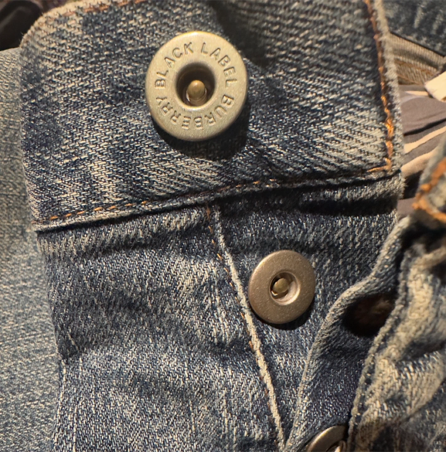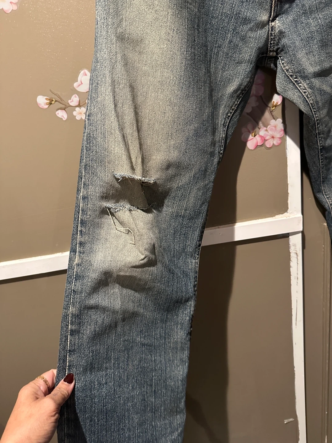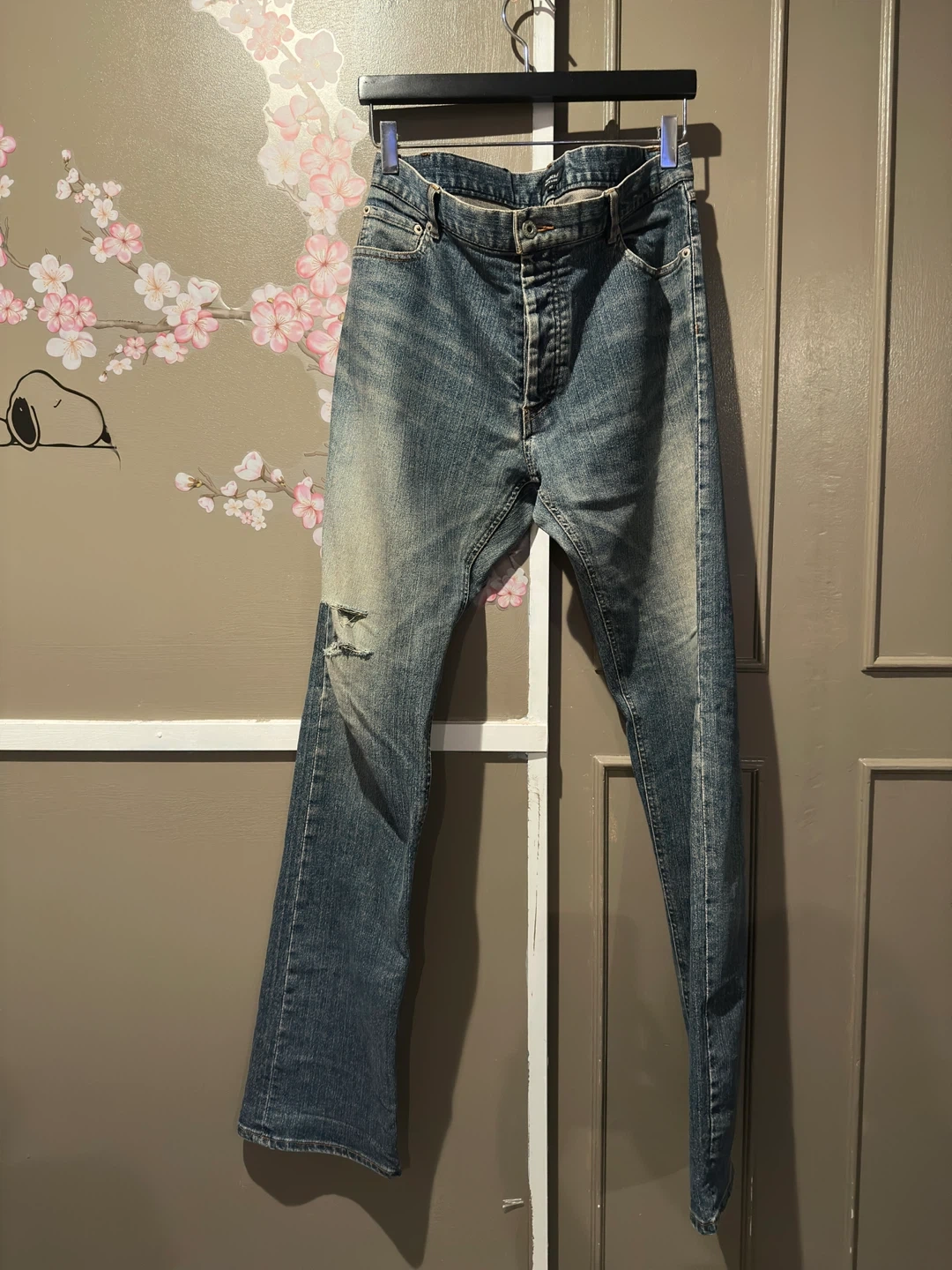 Classic blue wash jeans from Burberry Black Label. Features a distressed look with a rip on the left thigh.