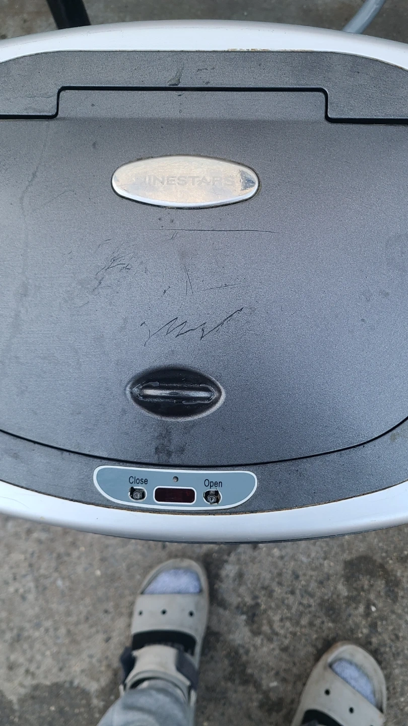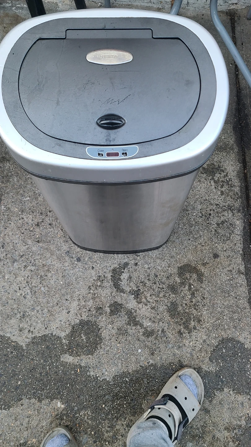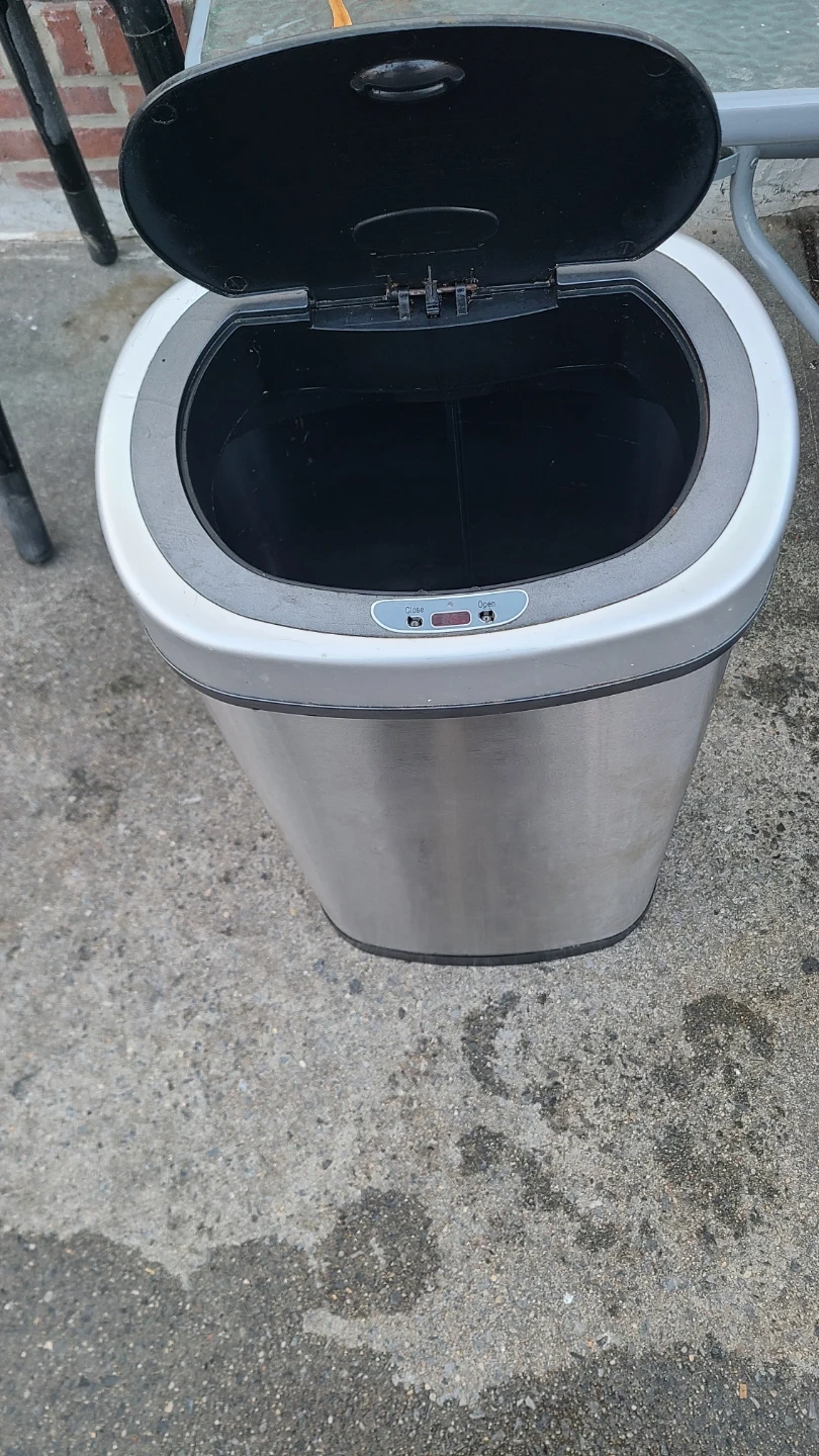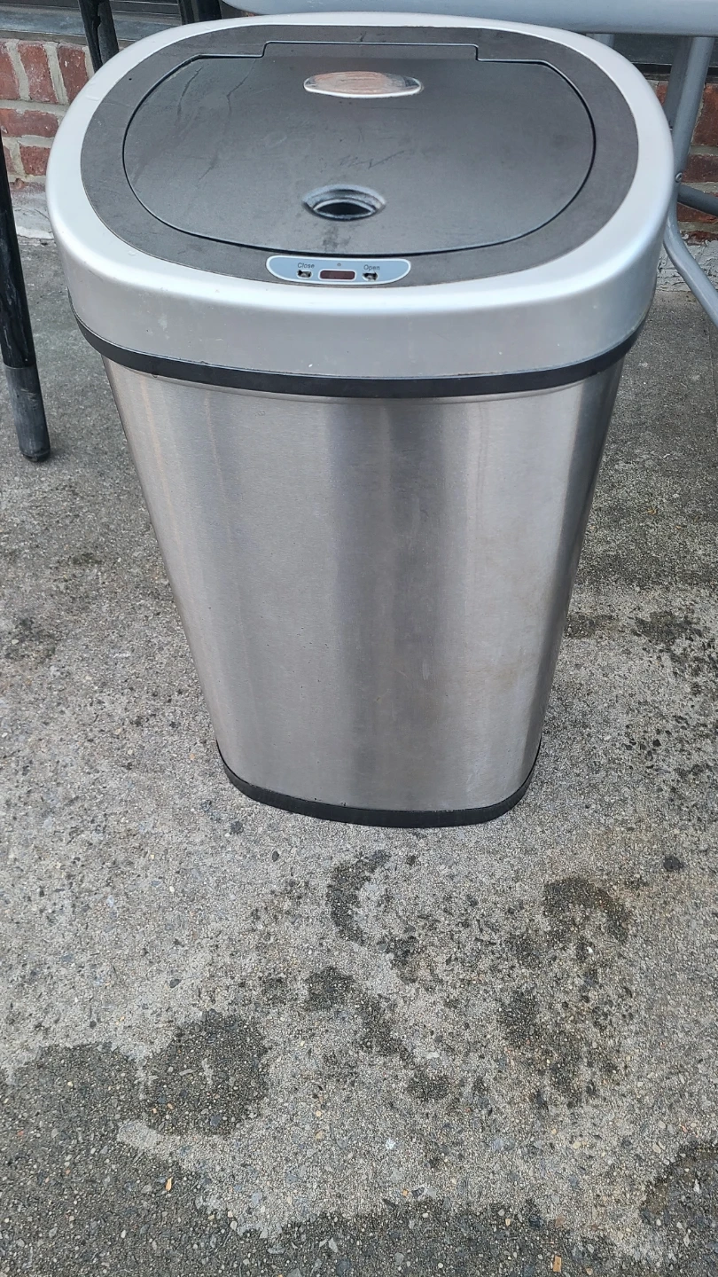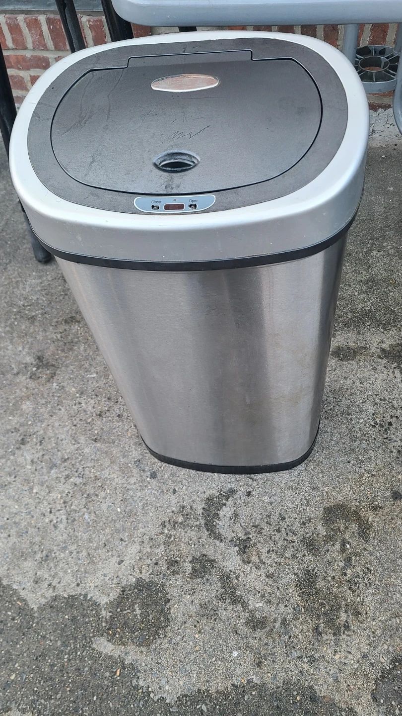 NINESTARS automatic touchless trash can. Stainless steel construction. Motion sensor lid opens hands-free.