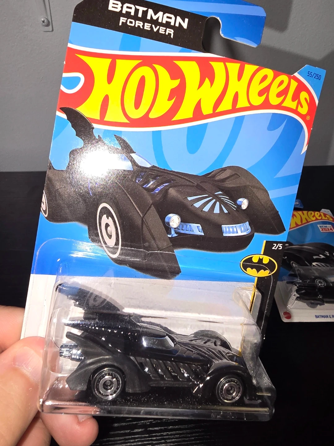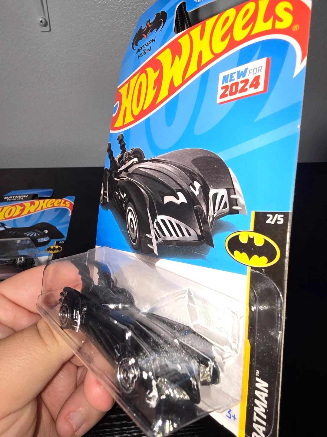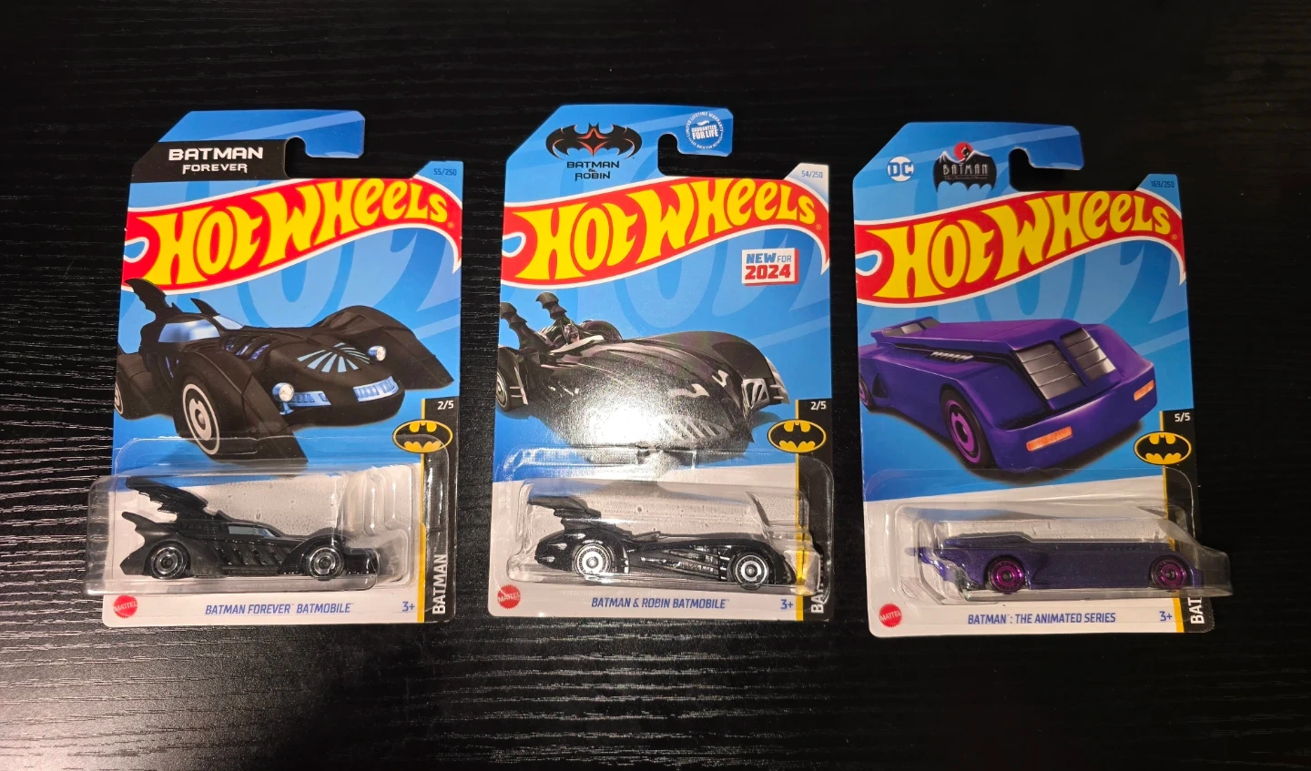 Three Hot Wheels Batman Batmobile die-cast cars. Includes the Batmobile from Batman Forever, Batman & Robin, and Batman: The Animated Series. Each is 1:64 scale and comes in original packaging.