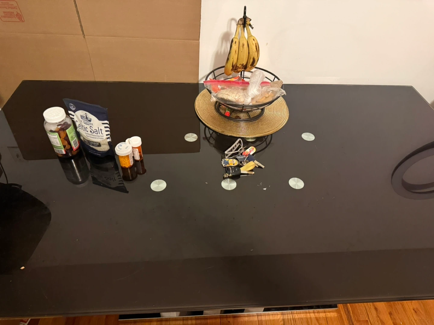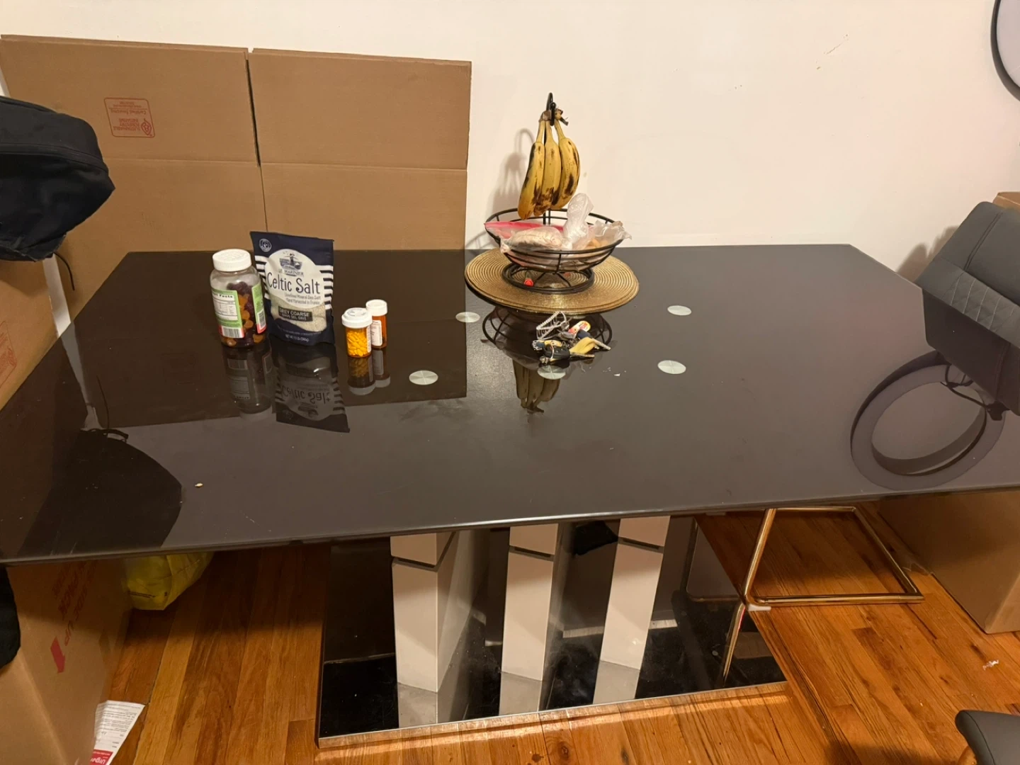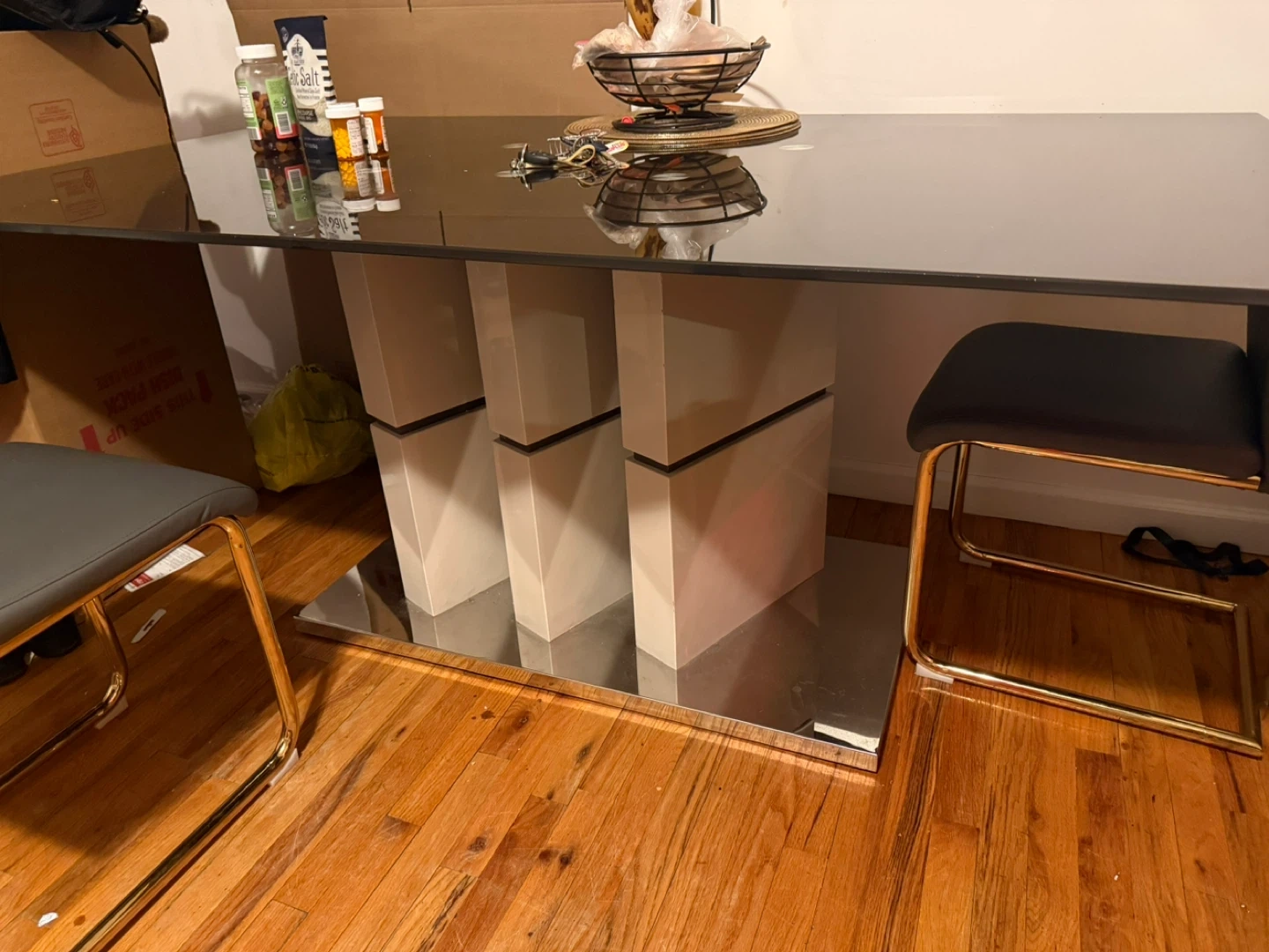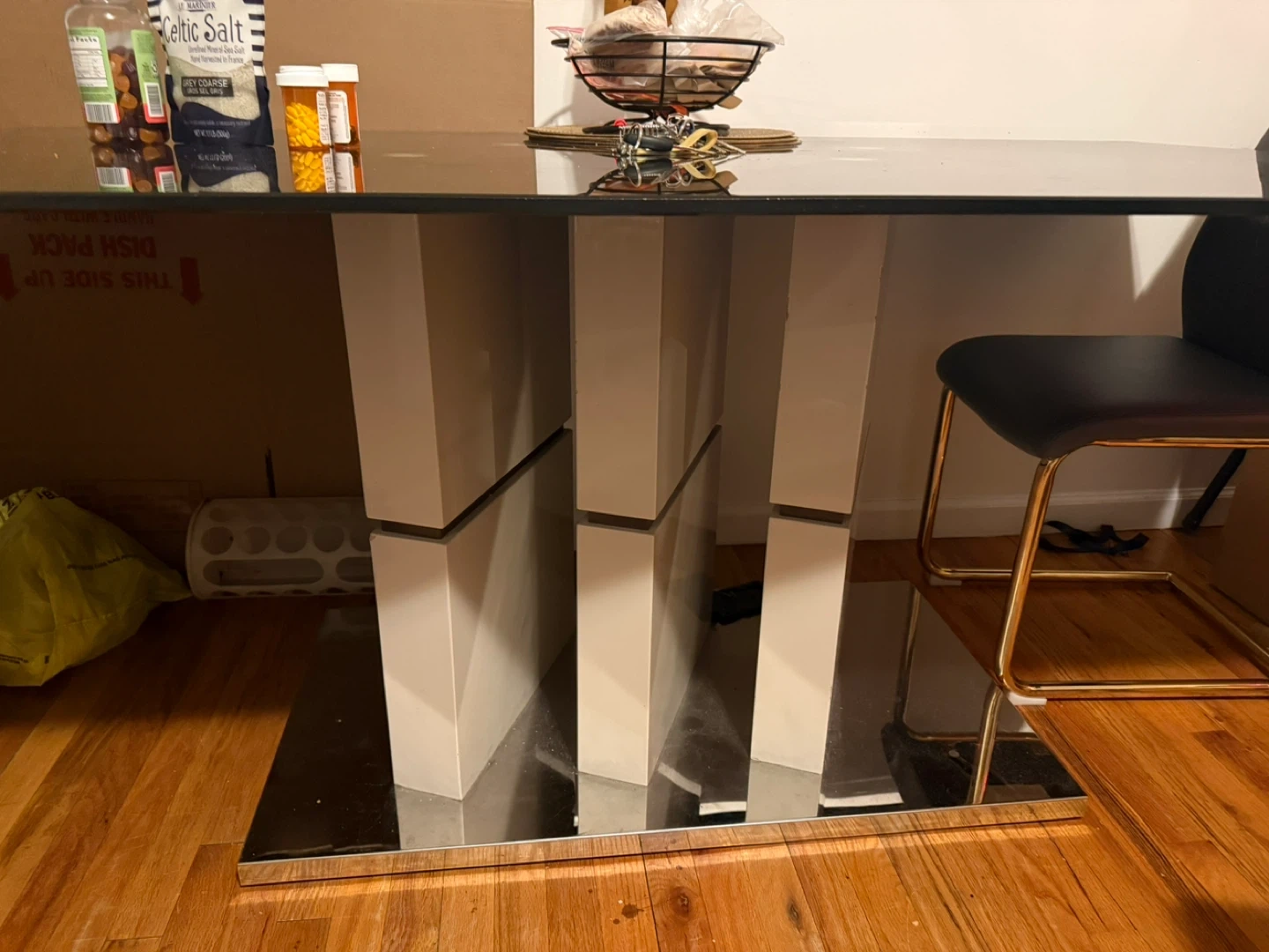 This dining table features a sleek black glass top and a unique modern base with white and chrome accents. It's a stylish centerpiece for any dining area. The glass surface is durable and easy to clean. It's a great size for family meals or entertaining guests!