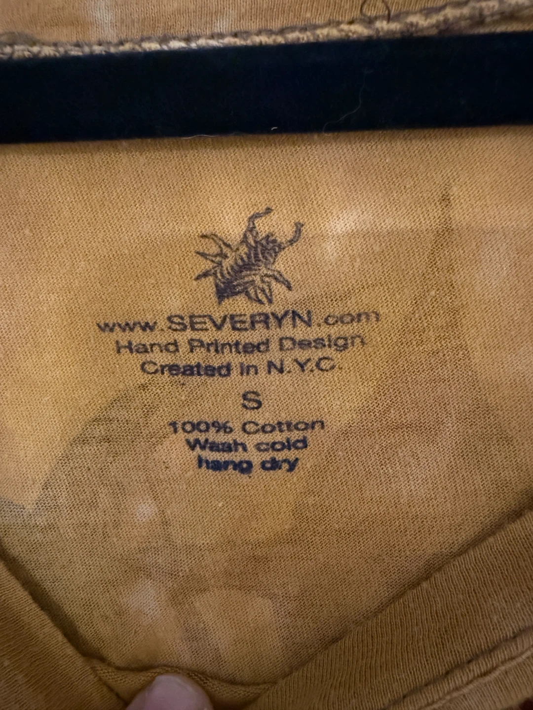 Selling a Severyn long sleeve shirt with a hand-printed design, created in NYC. It's a size small and made of 100% cotton. The tag says to wash cold and hang dry