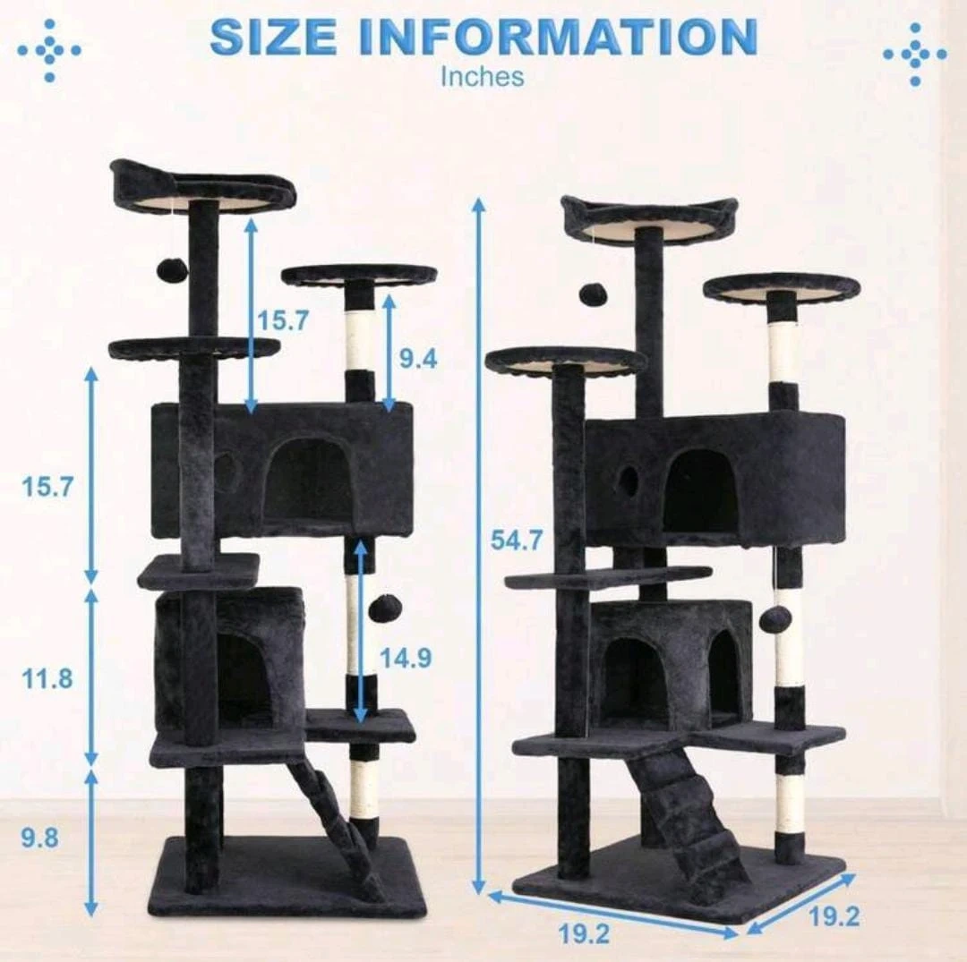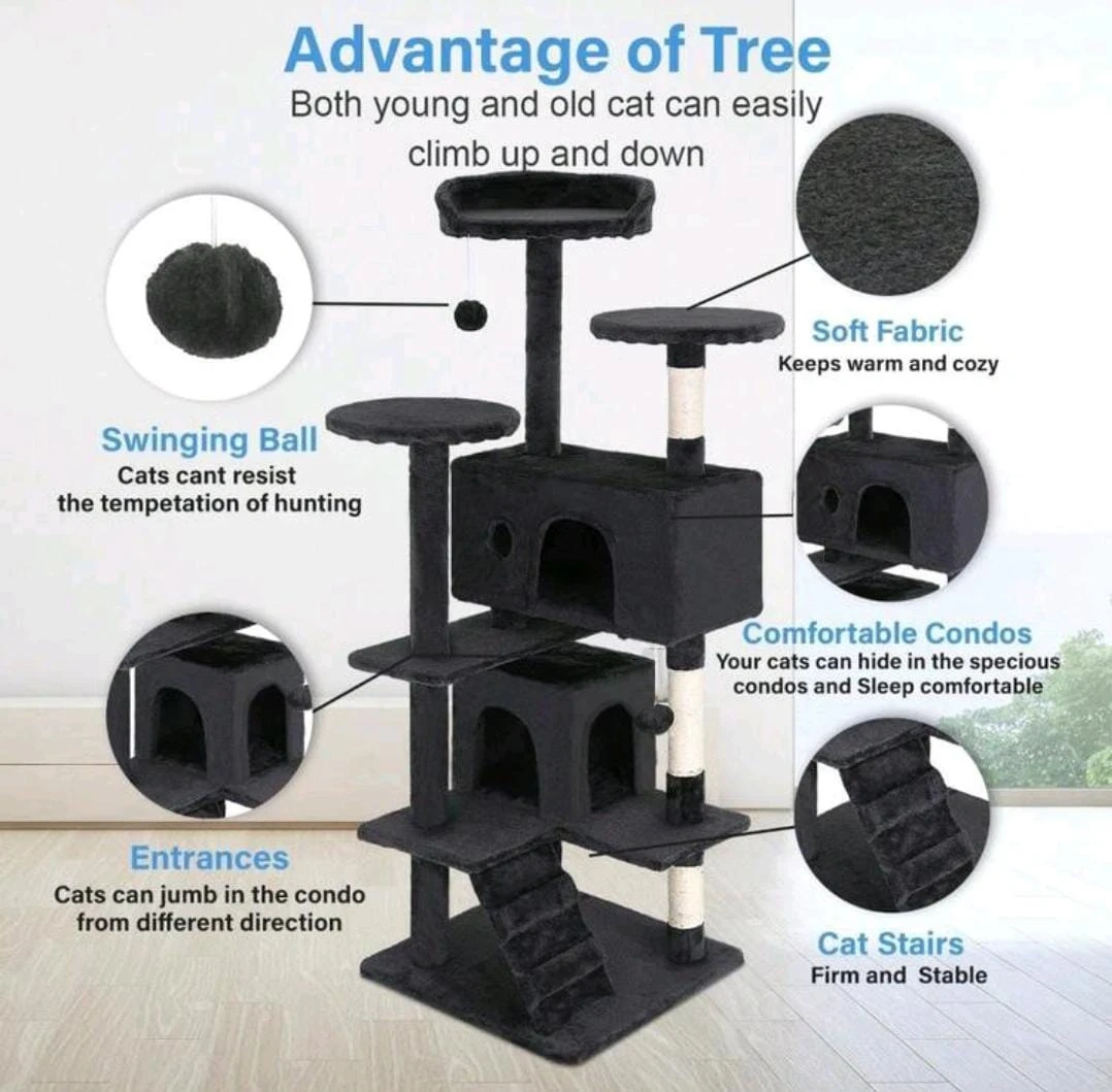 This multi-level cat tree tower offers comfortable condos andsisal scratching posts. It includes a swinging ball for entertainment and sturdy cat stairs. Soft fabric keeps your feline friends warm and cozy!