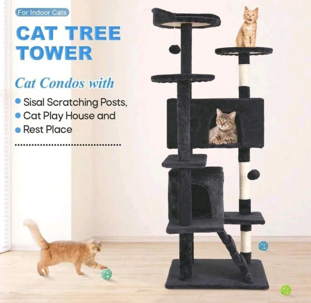 Black Cat Tree Tower Condo with Swinging Ball and Cat Stairs
