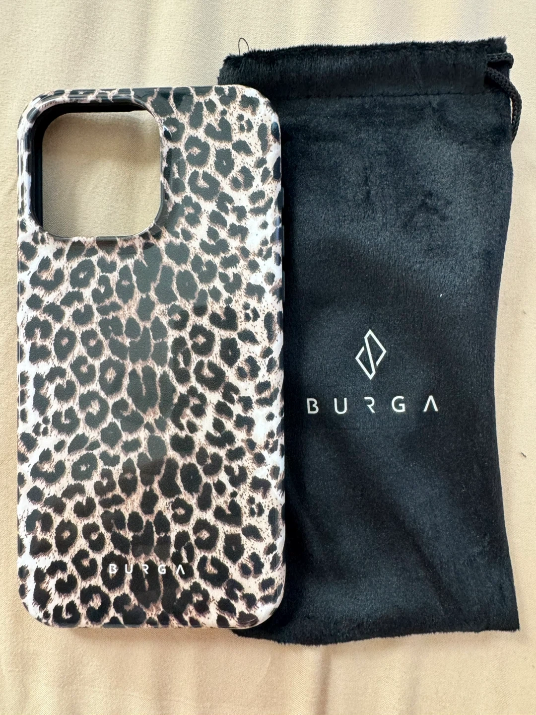 This BURGA phone case features a trendy leopard print design. It comes with a soft, black pouch for storage. Protect your phone in style! iPhone 15 Pro Max