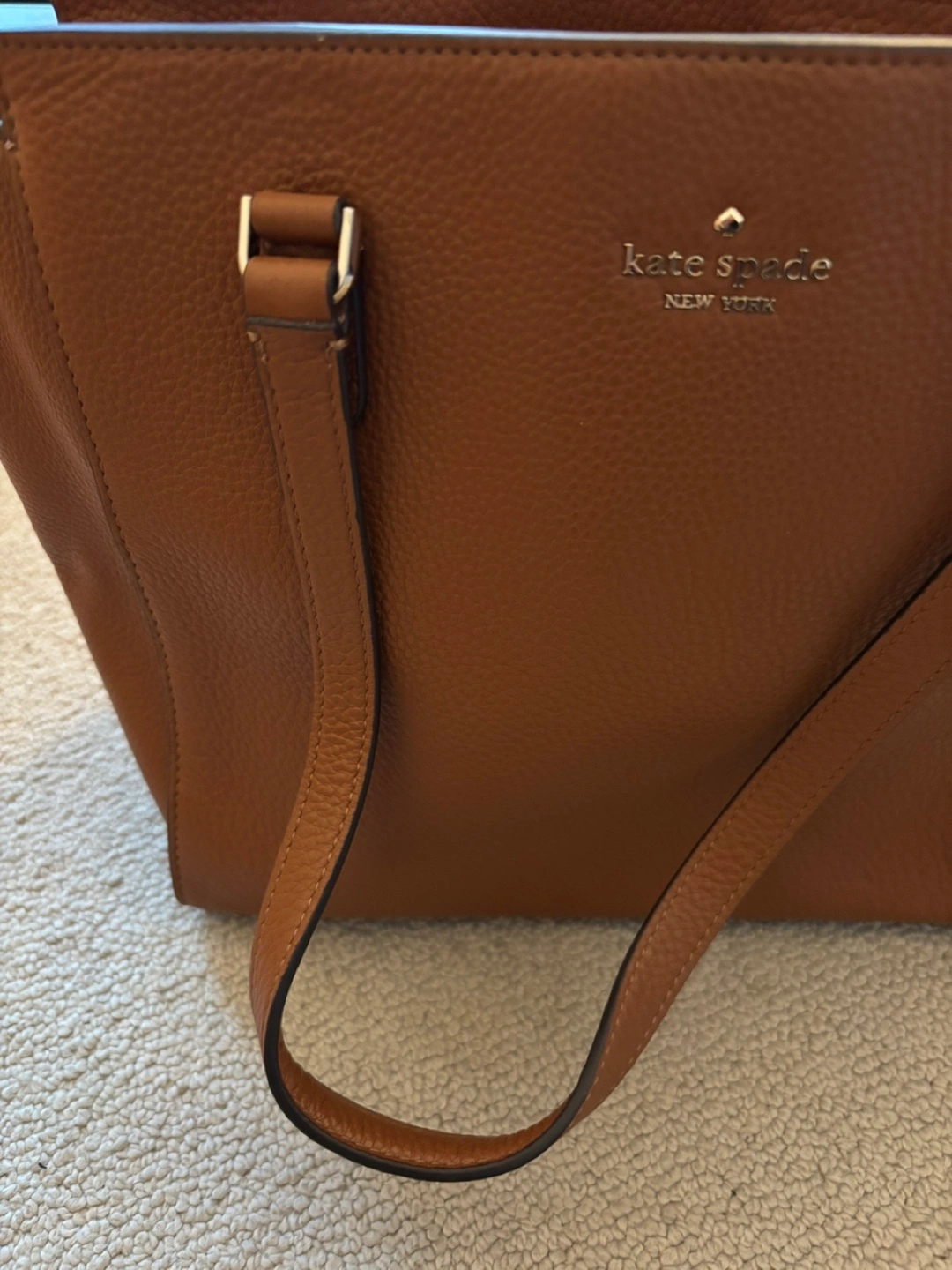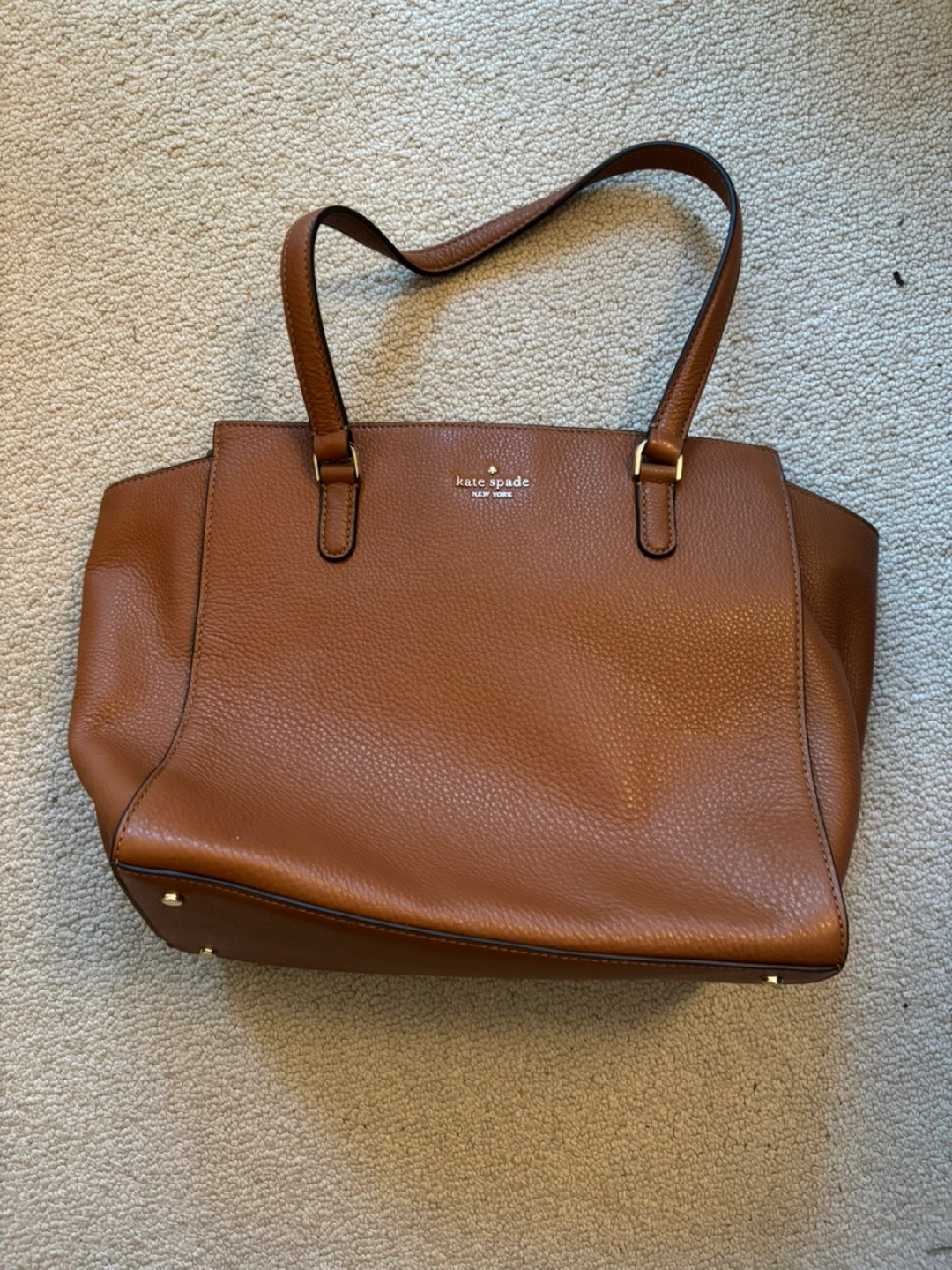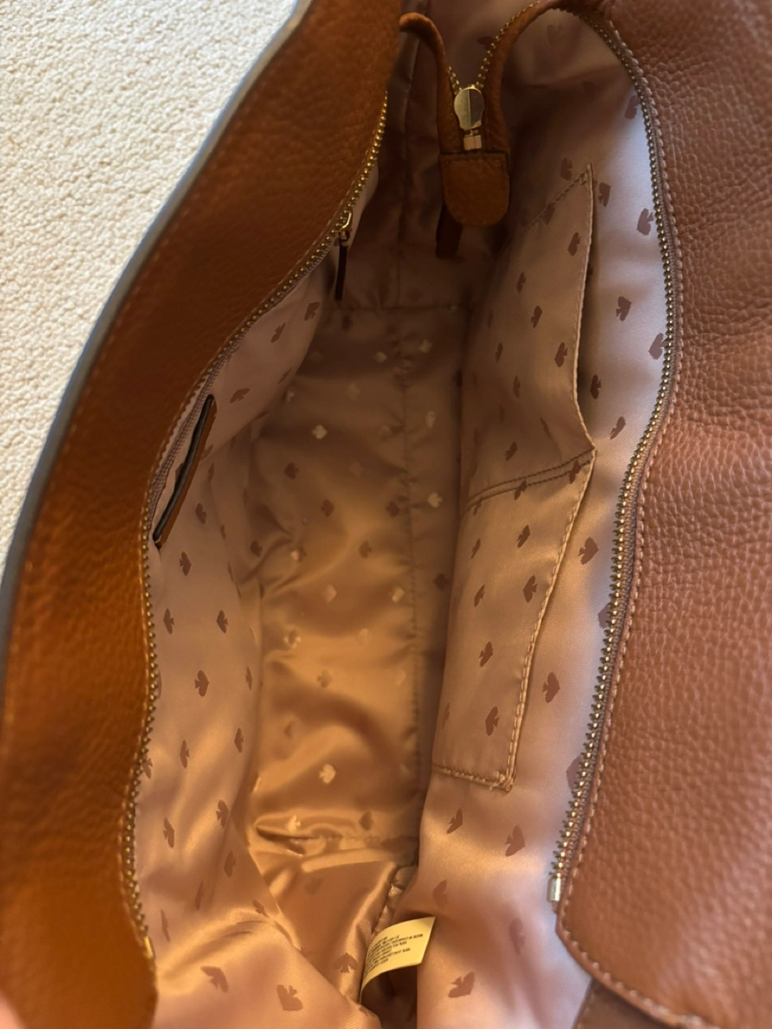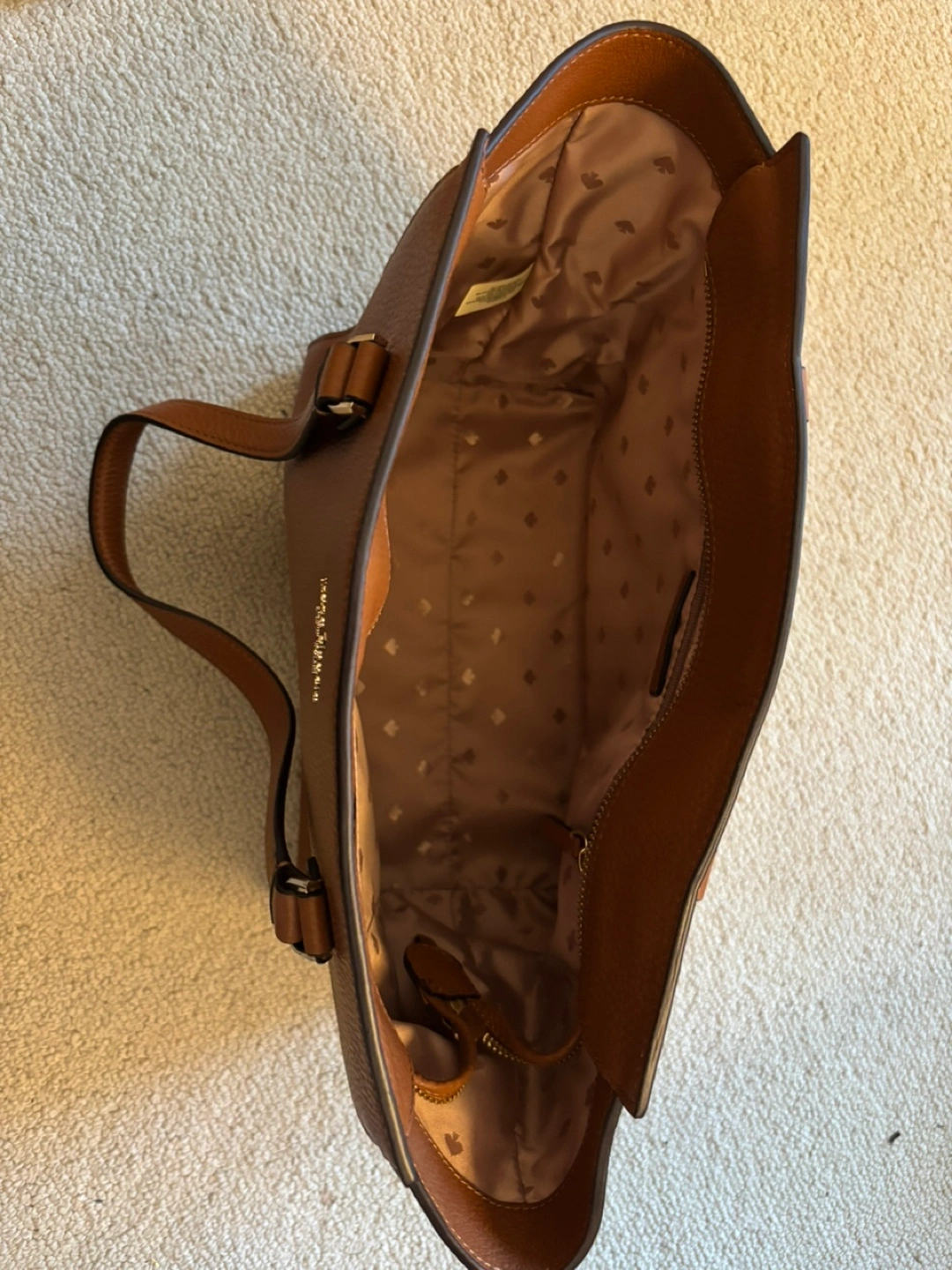 Brown leather tote bag. Features two top handles and a zip closure. Interior includes multiple pockets. Excellent for everyday use.