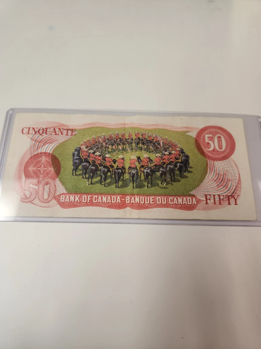 A vintage Bank of Canada fifty dollar bill. Features a portrait of Robert Borden on one side and the RCMP Musical Ride on the other. It's a great piece of Canadian history! Banknote in Great condition.