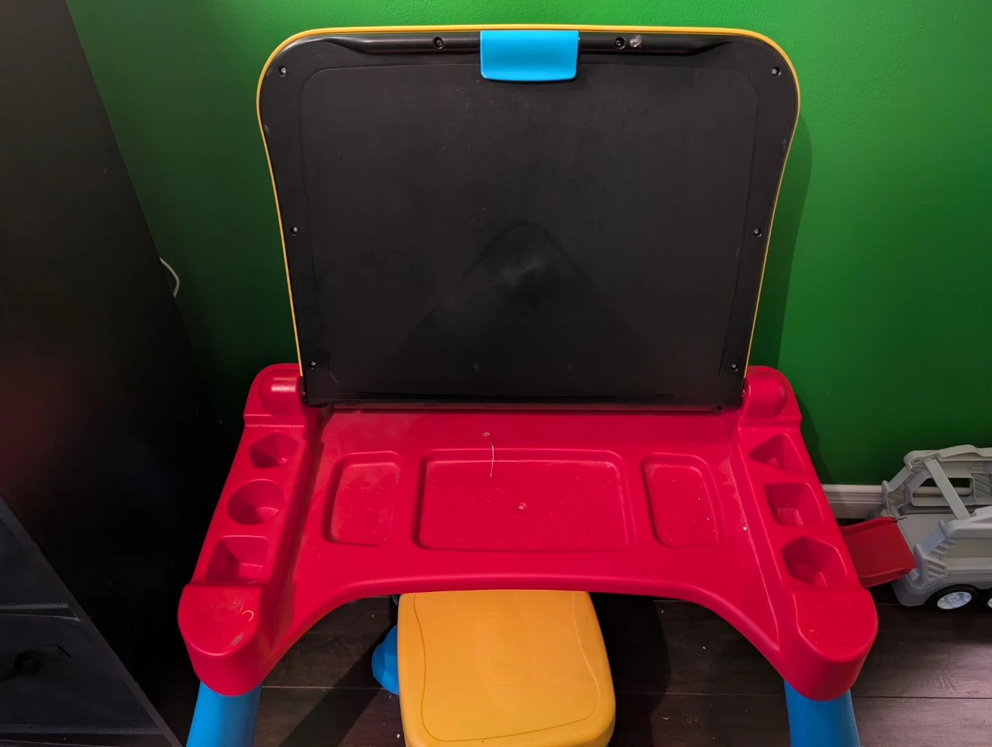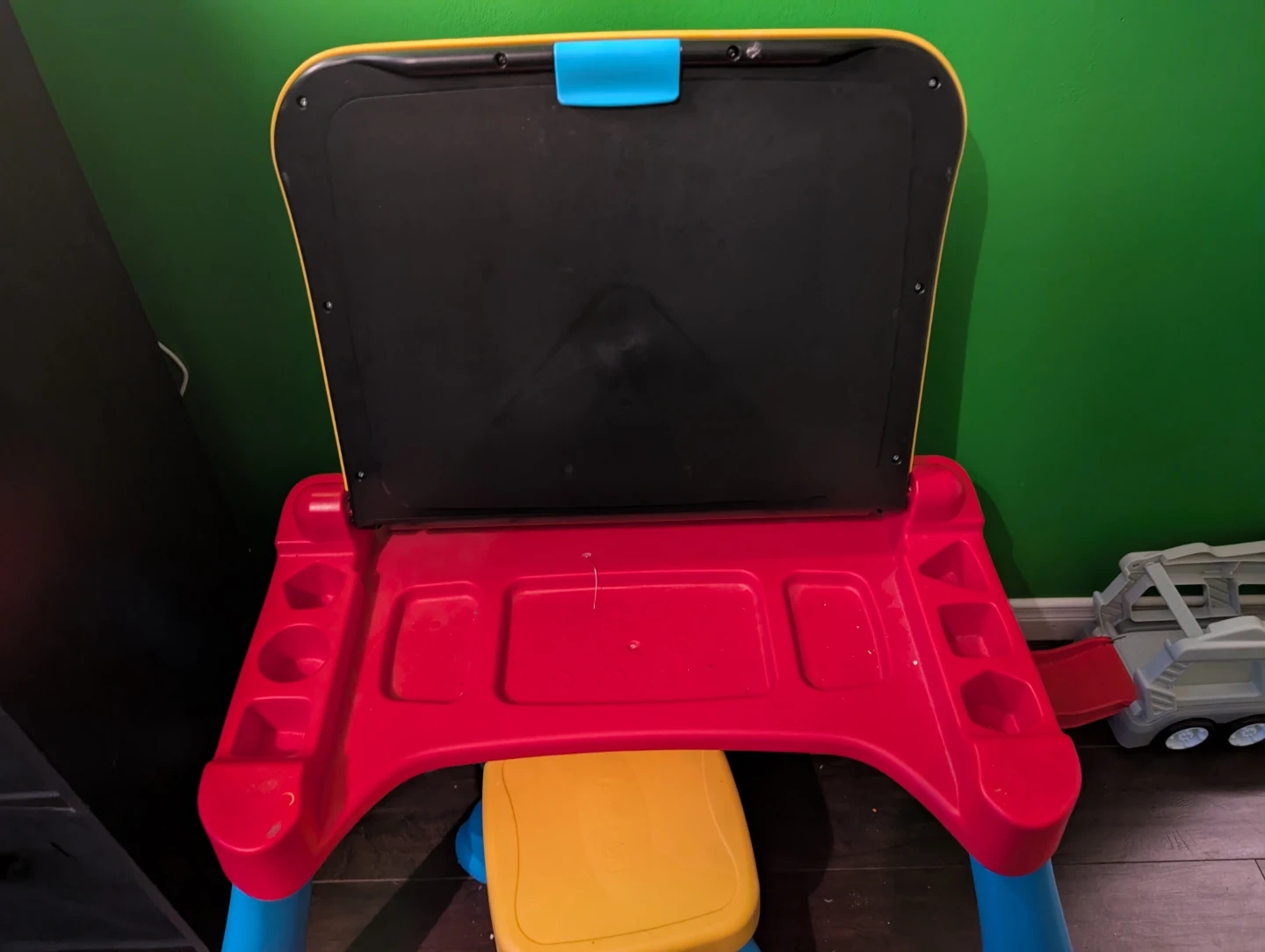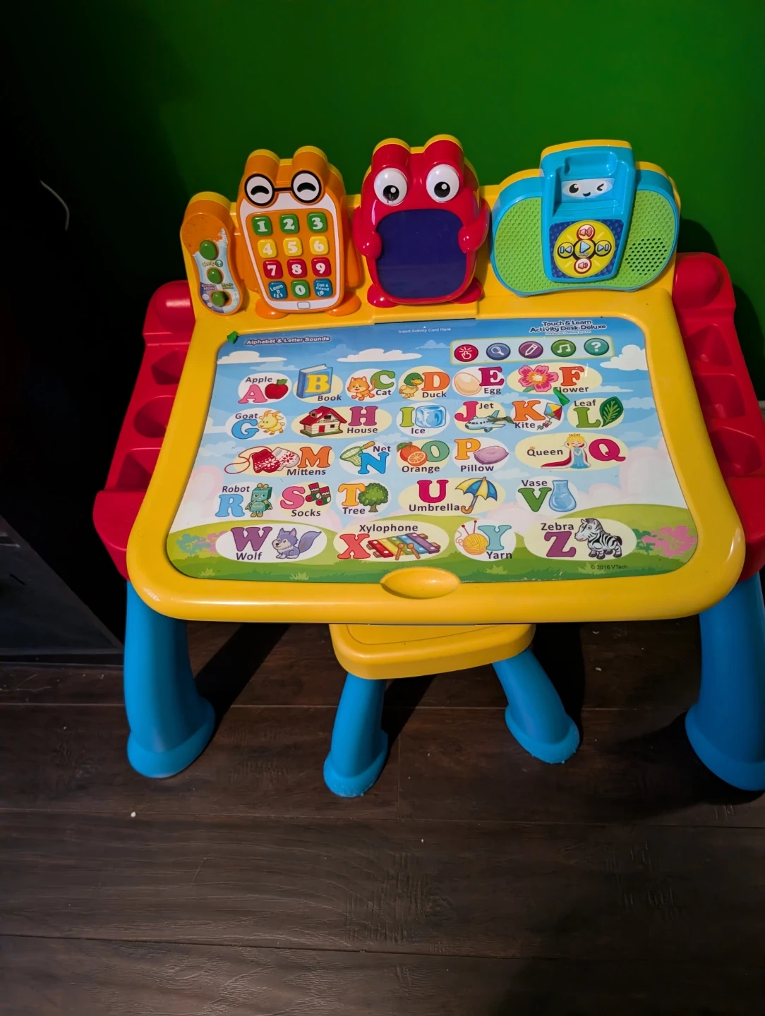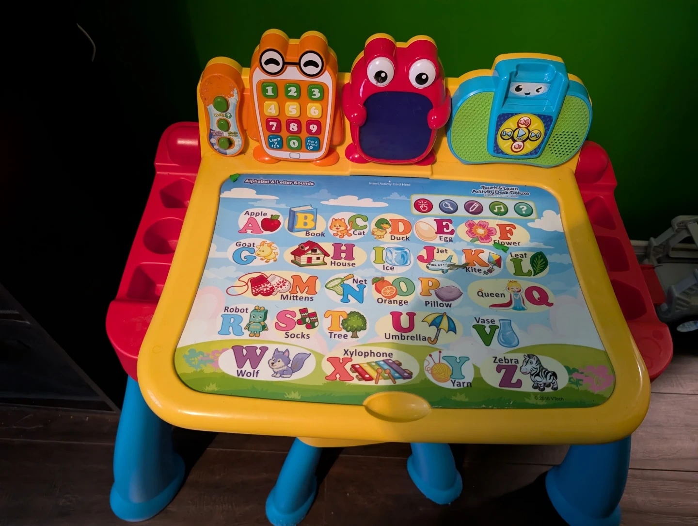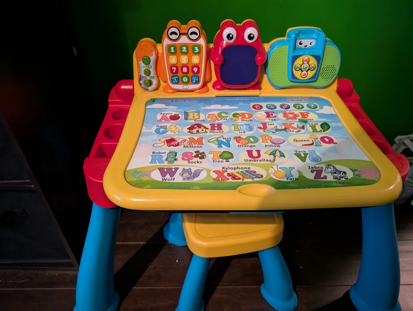 This VTech activity desk teaches letters and numbers with fun sounds and interactive elements. It features a blackboard surface on the reverse for drawing. Perfect for little learners just starting out!