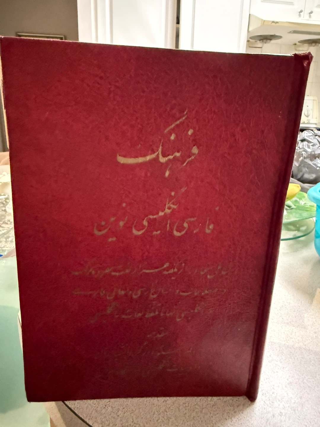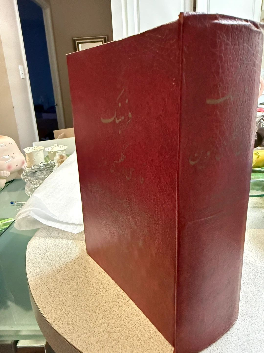Red hardback Persian to English dictionary. This comprehensive reference book is great for language learners. It's a valuable tool for understanding Farsi and English vocabulary.