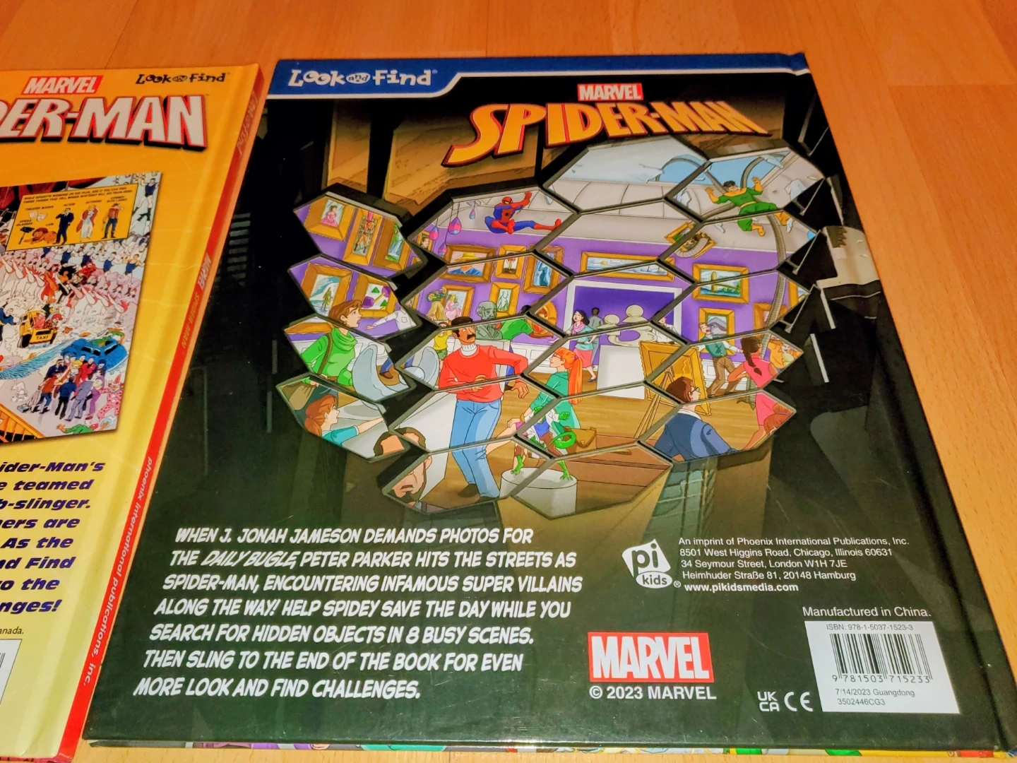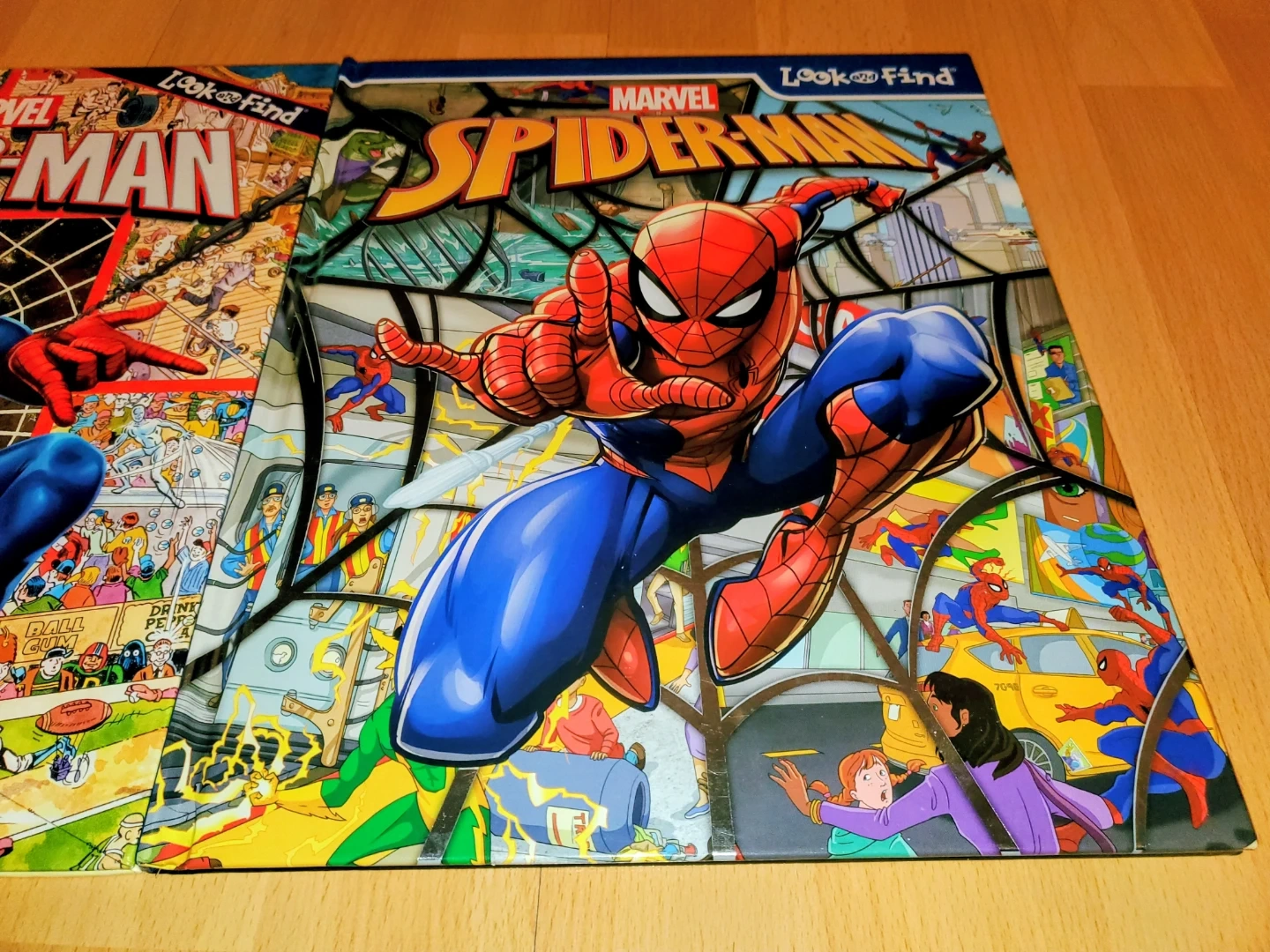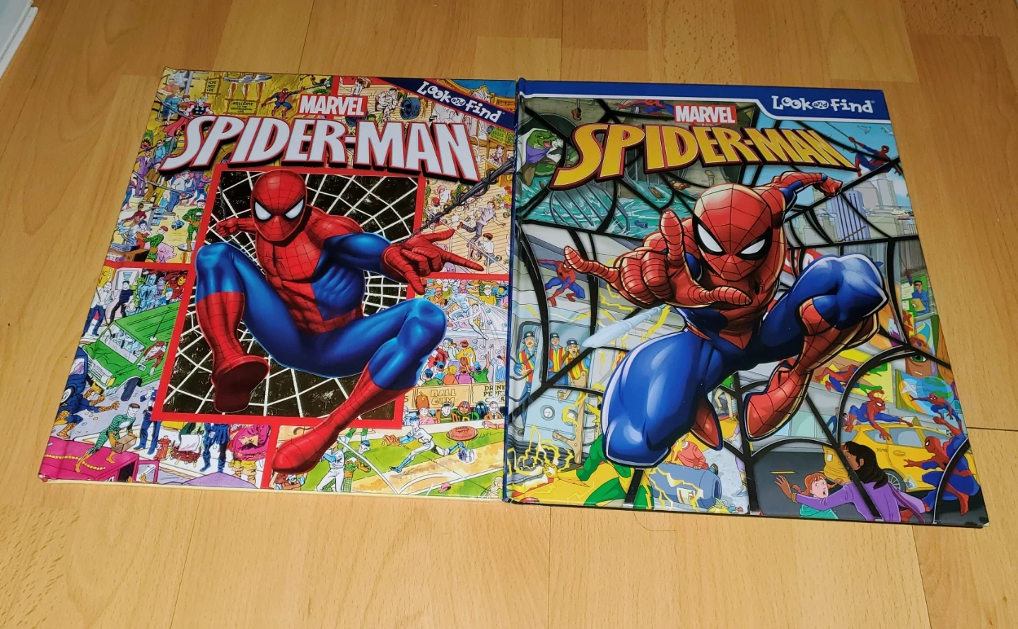 Two Marvel Spider-Man Look and Find books included. These books offer hidden object challenges across 8 busy scenes for each book. They're fun for kids who love puzzles and Spidey.