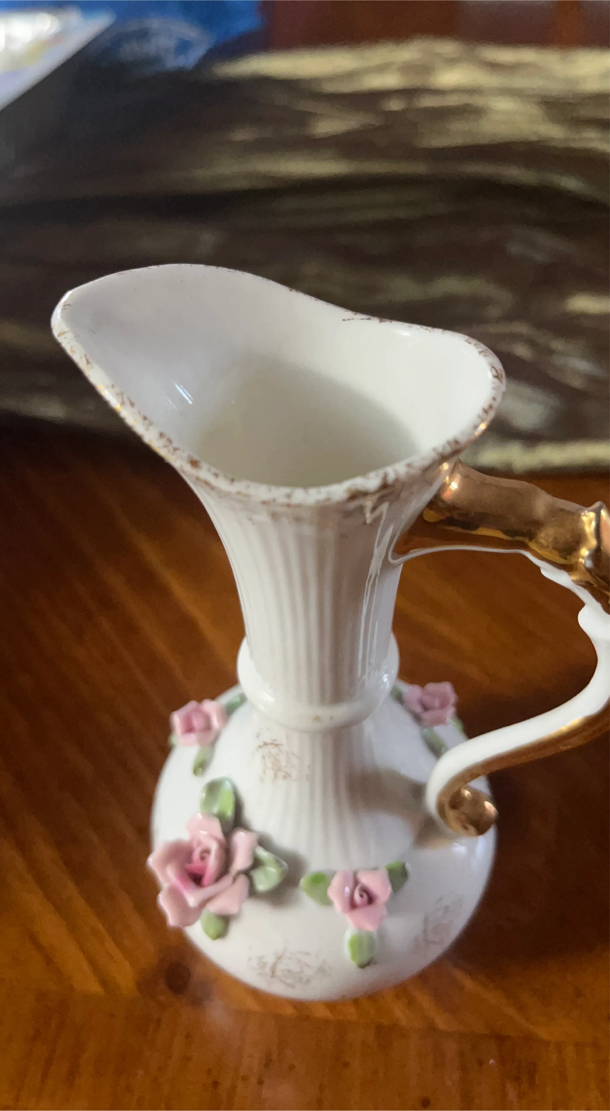 White Ceramic Pitcher with Pink Roses and Gold Trim