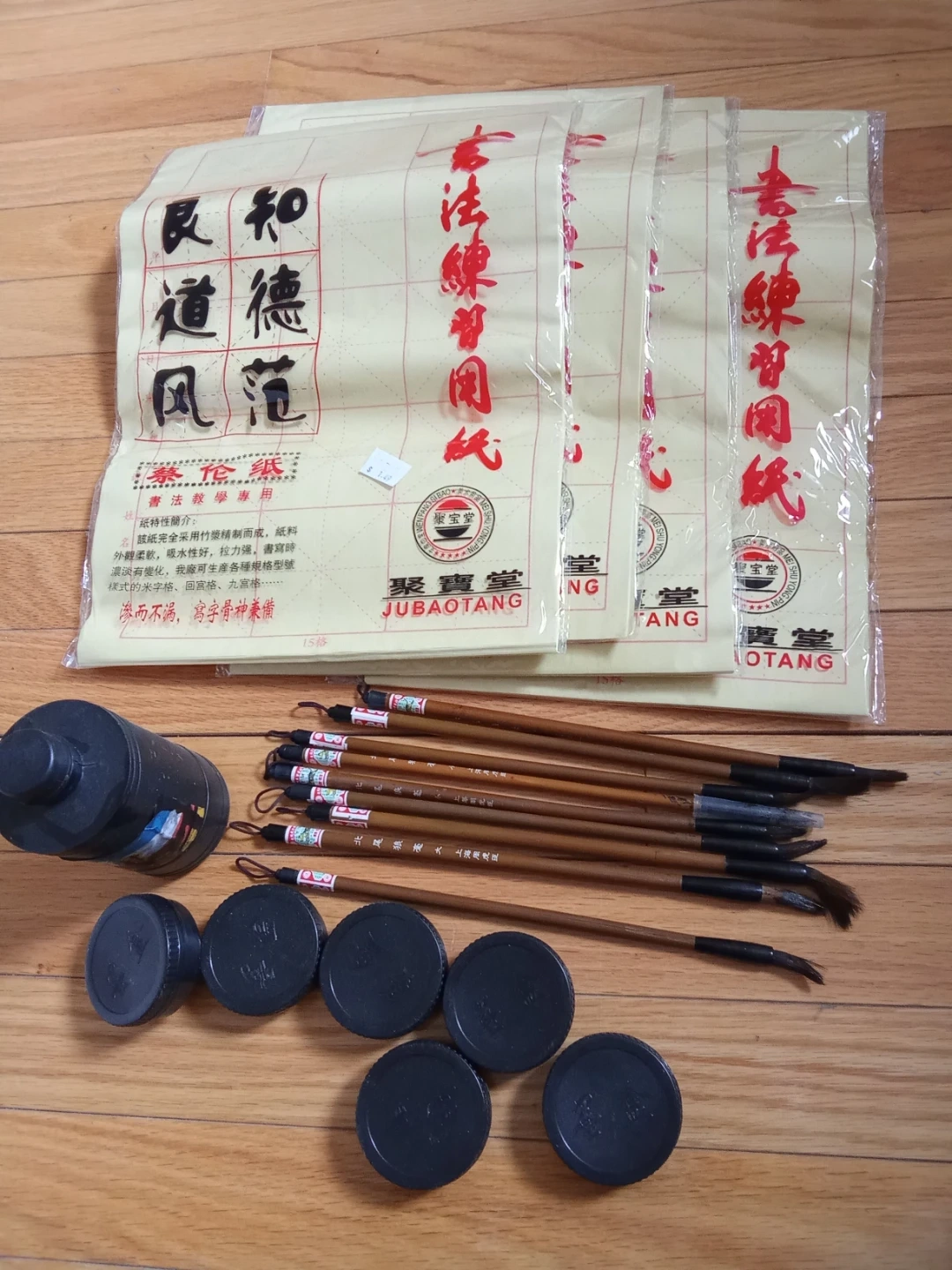 This set includes multiple calligraphy brushes, ink stones, and practice paper. It's suitable for beginners and those looking to practice Chinese calligraphy. The brushes appear to be made with natural bristles and bamboo handles.