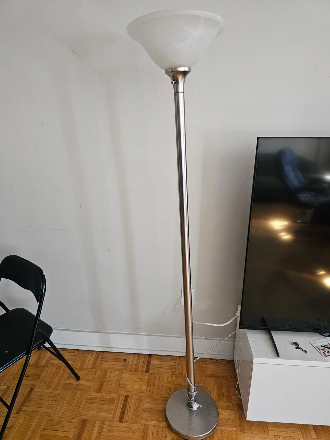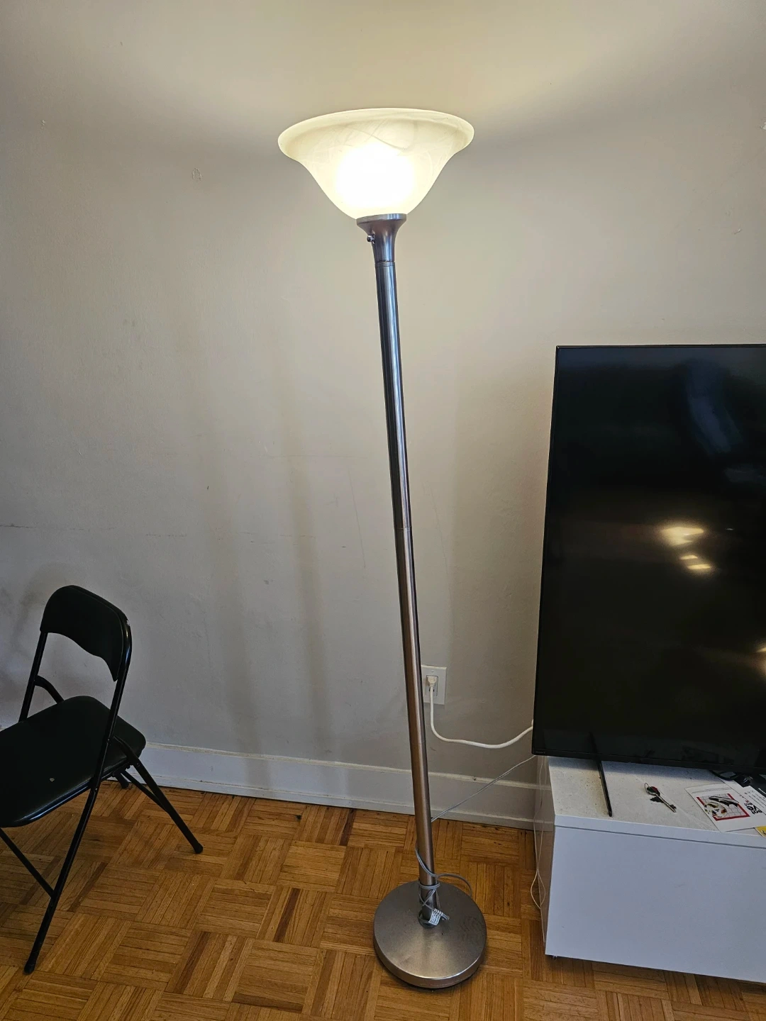 A torchiere floor lamp with a brushed nickel finish and a marble-effect glass shade. It's designed for accent lighting in living spaces. The base is circular and weighted for stability. Perfectly good working condition.