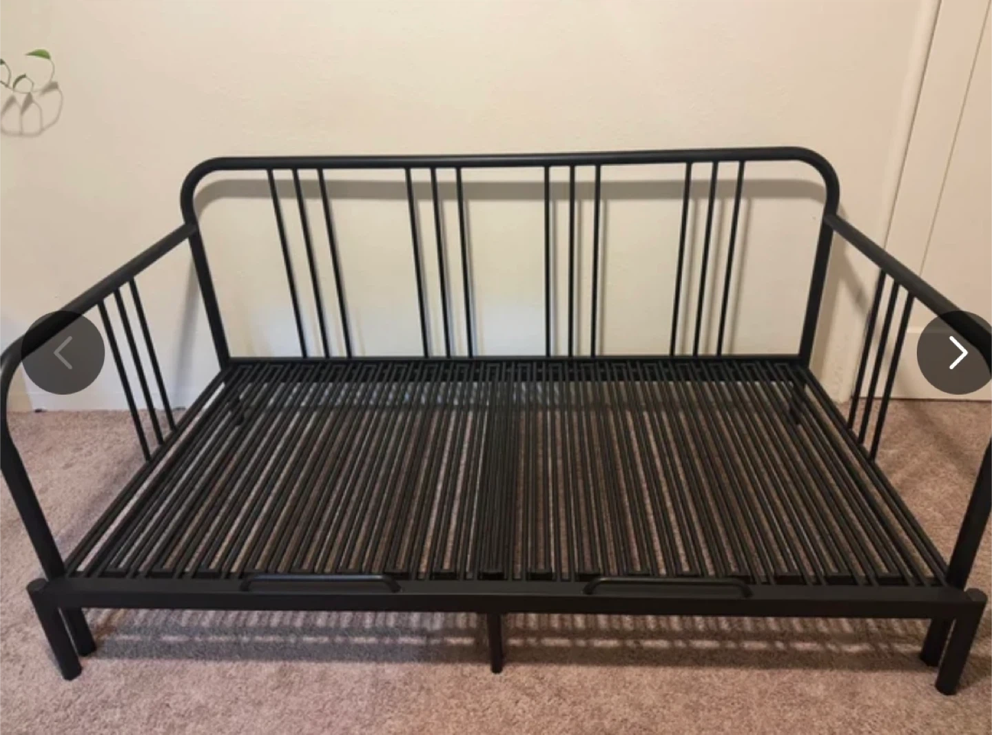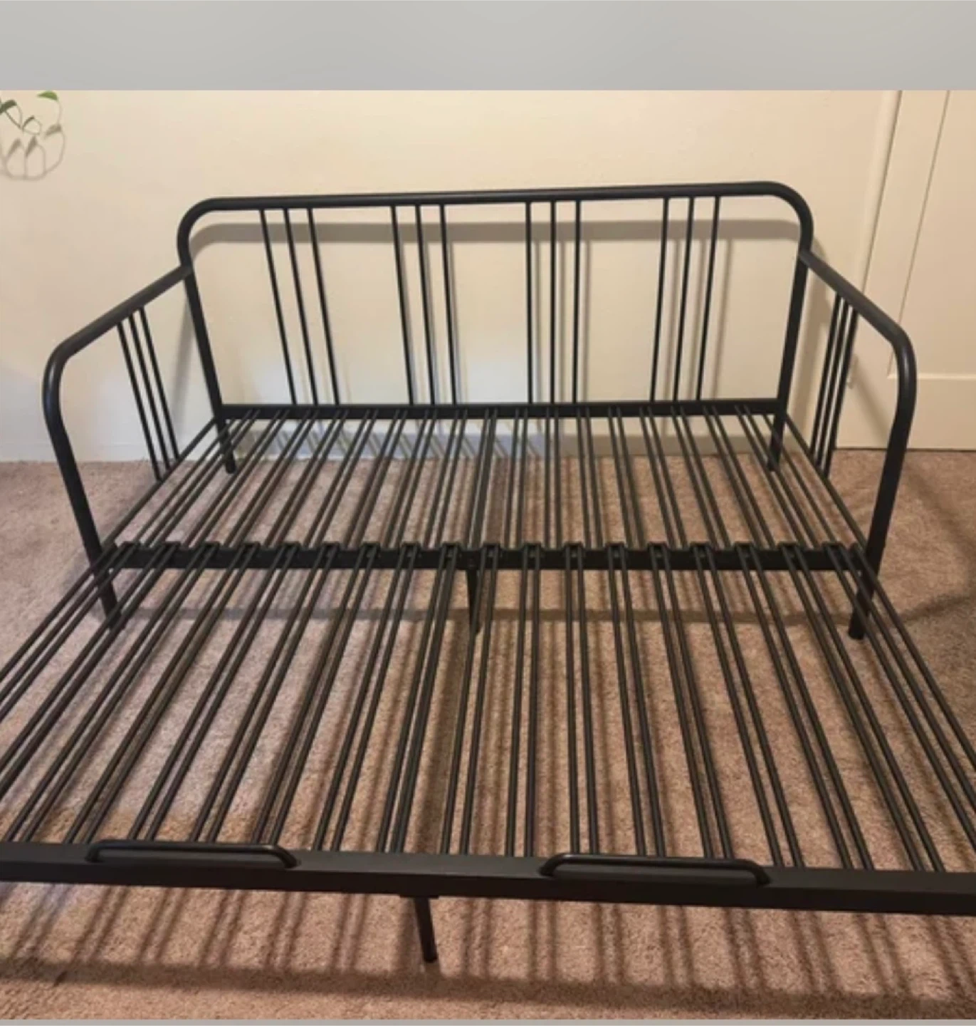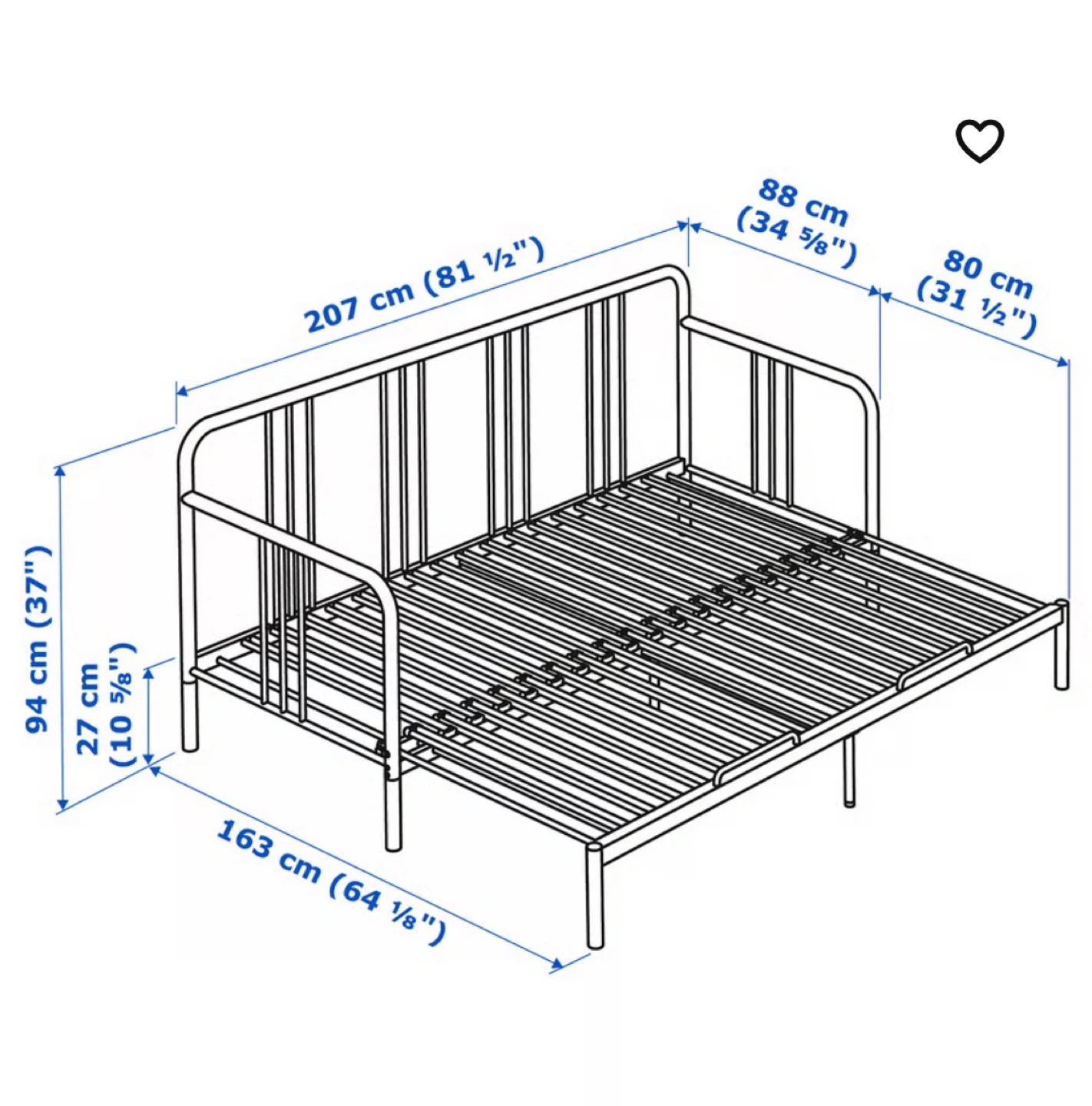 Black metal daybed frame. It's 207 cm (81 1/2") long. This frame converts to a sofa or a bed. It's great for small spaces!