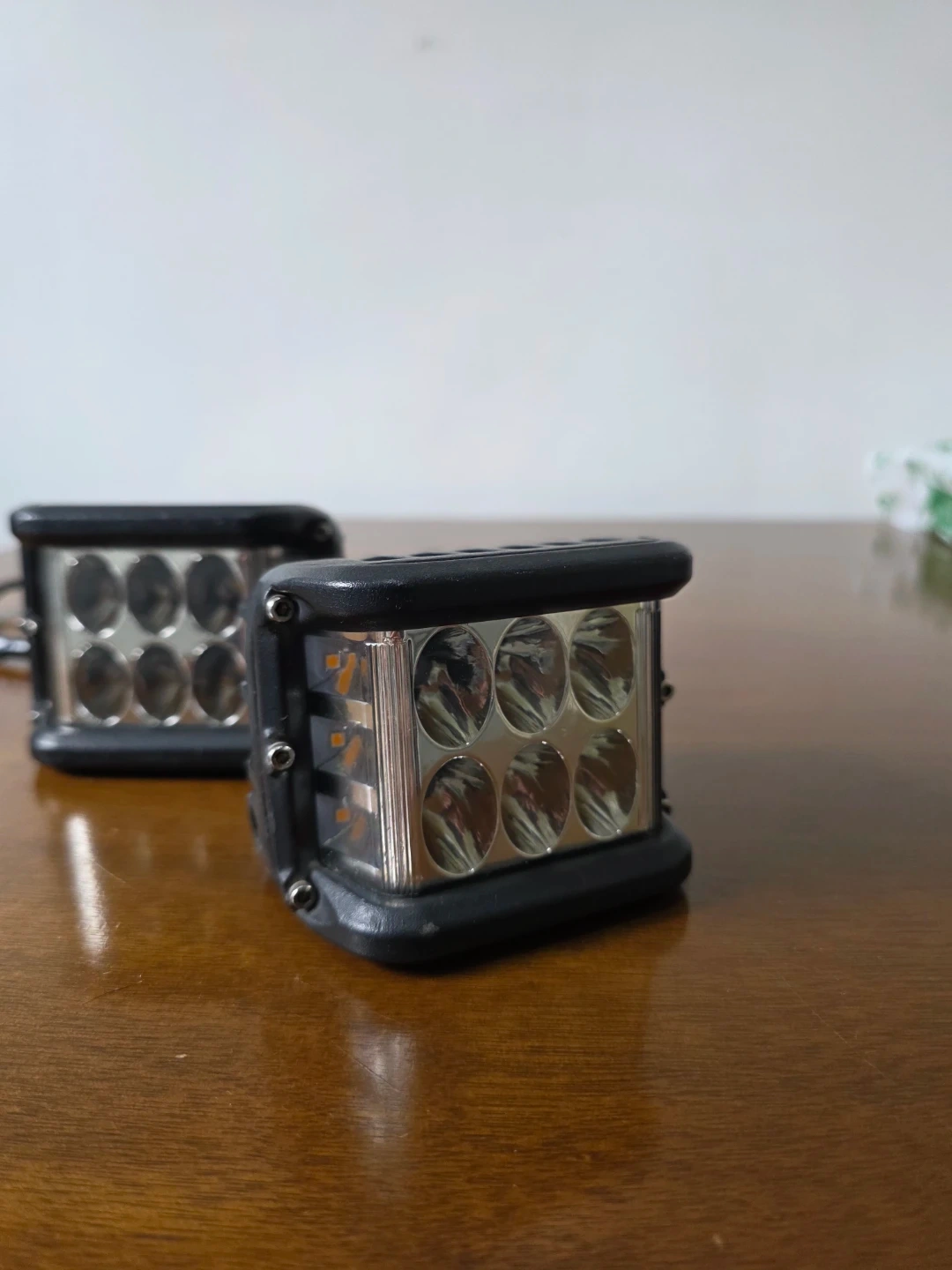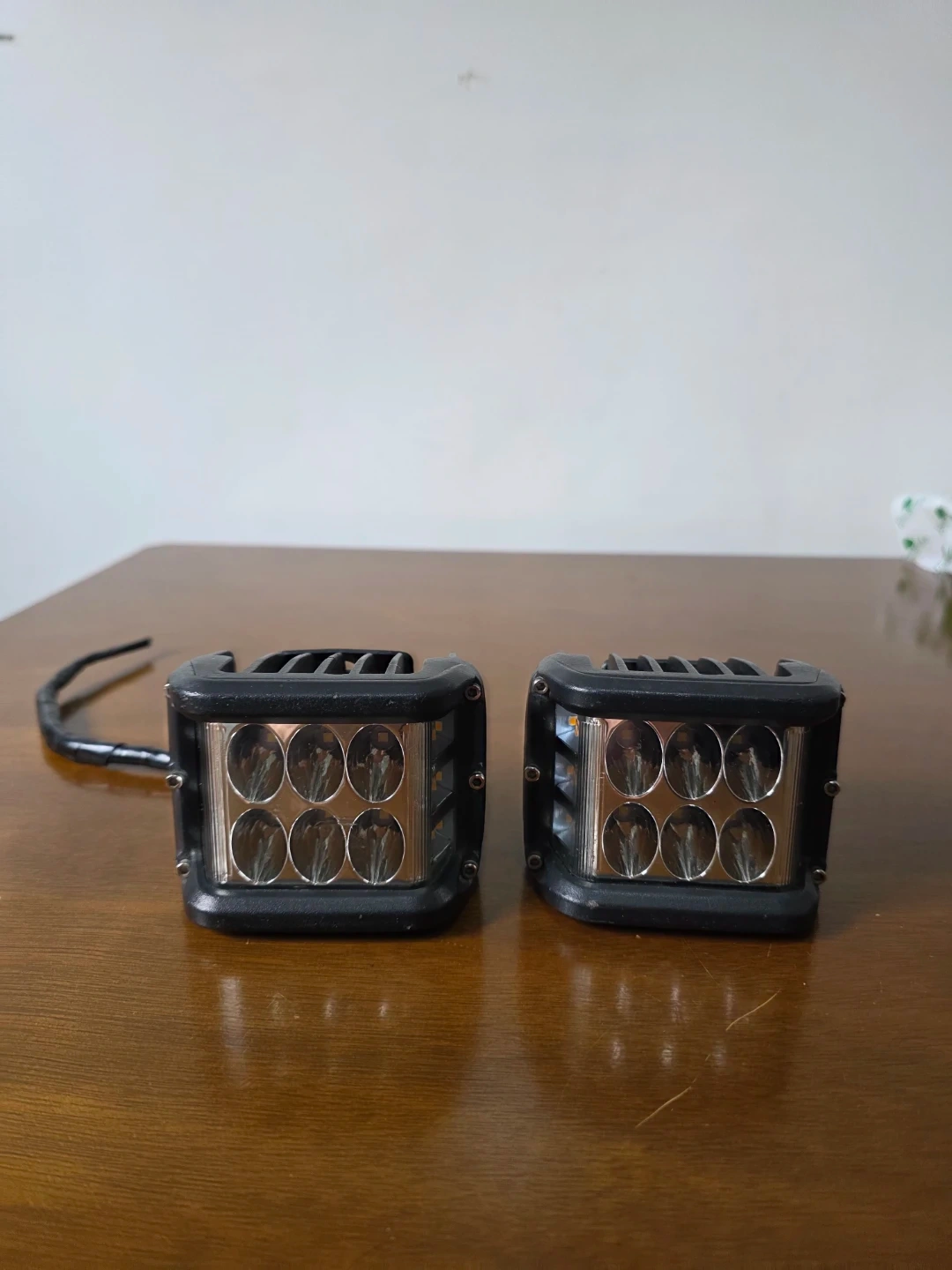 Set of two cube-shaped LED spotlights. These work lights are designed for off-road vehicles or utility purposes. They feature a durable black housing with multiple clear lenses.
