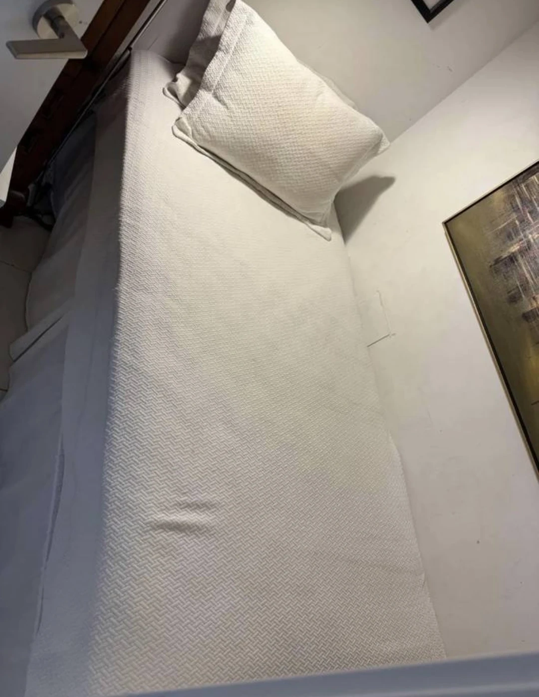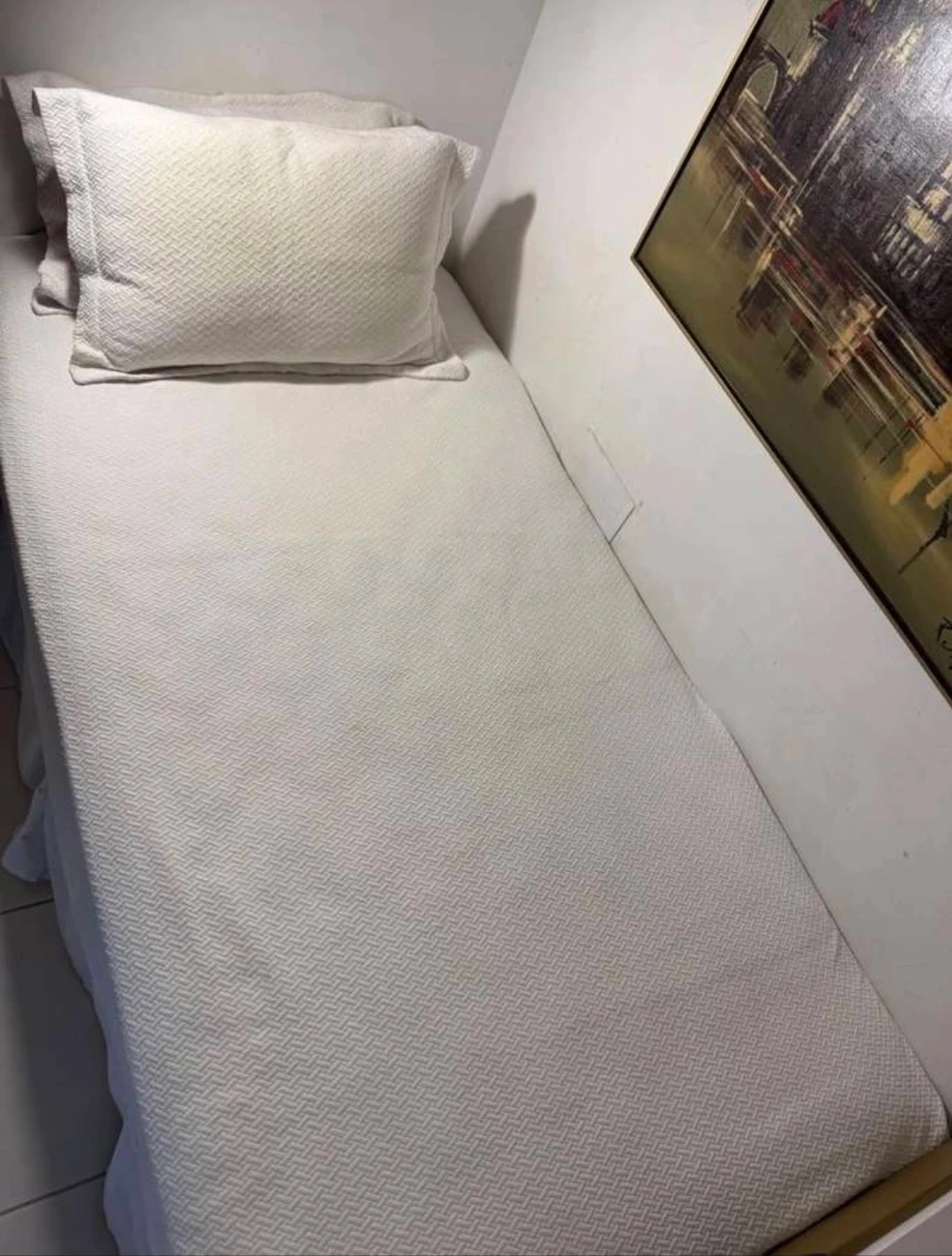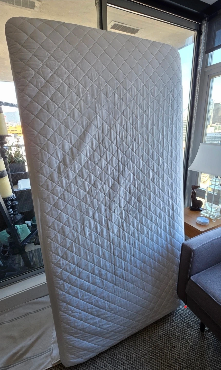 Single bed in good condition, including mattress, box spring, and iron bed base.