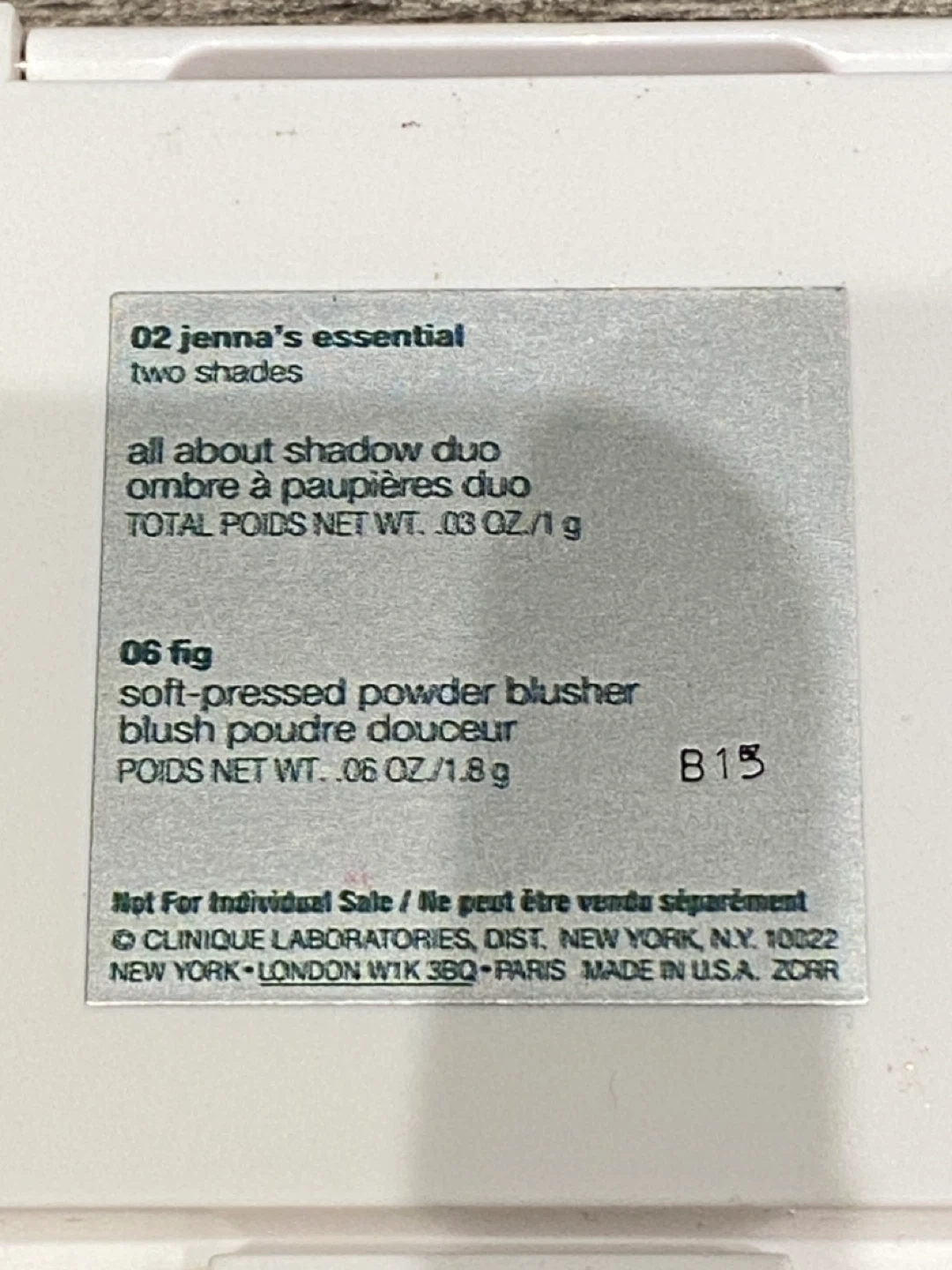 This is a Clinique All About Shadow Duo and Soft-Pressed Powder Blusher palette. It includes an eyeshadow duo and a blush in the shade '06 fig'. The total weight for the blush is .06 oz/1.8 g.