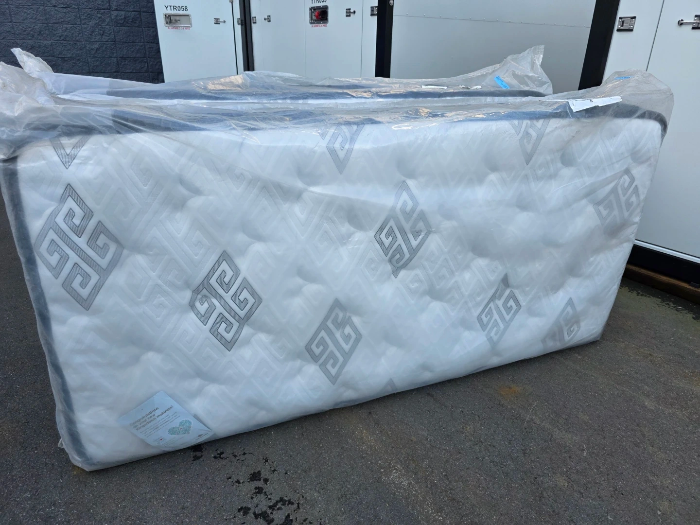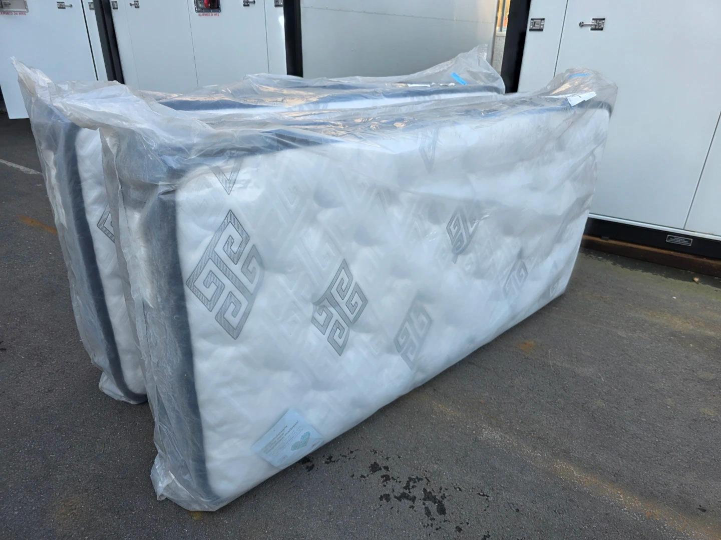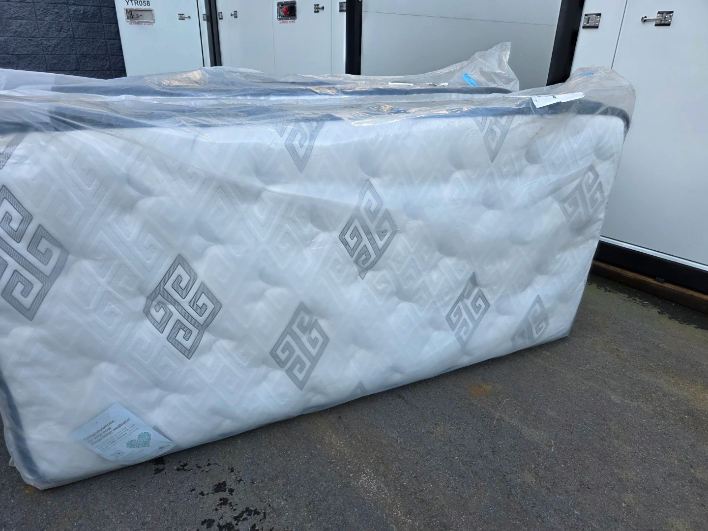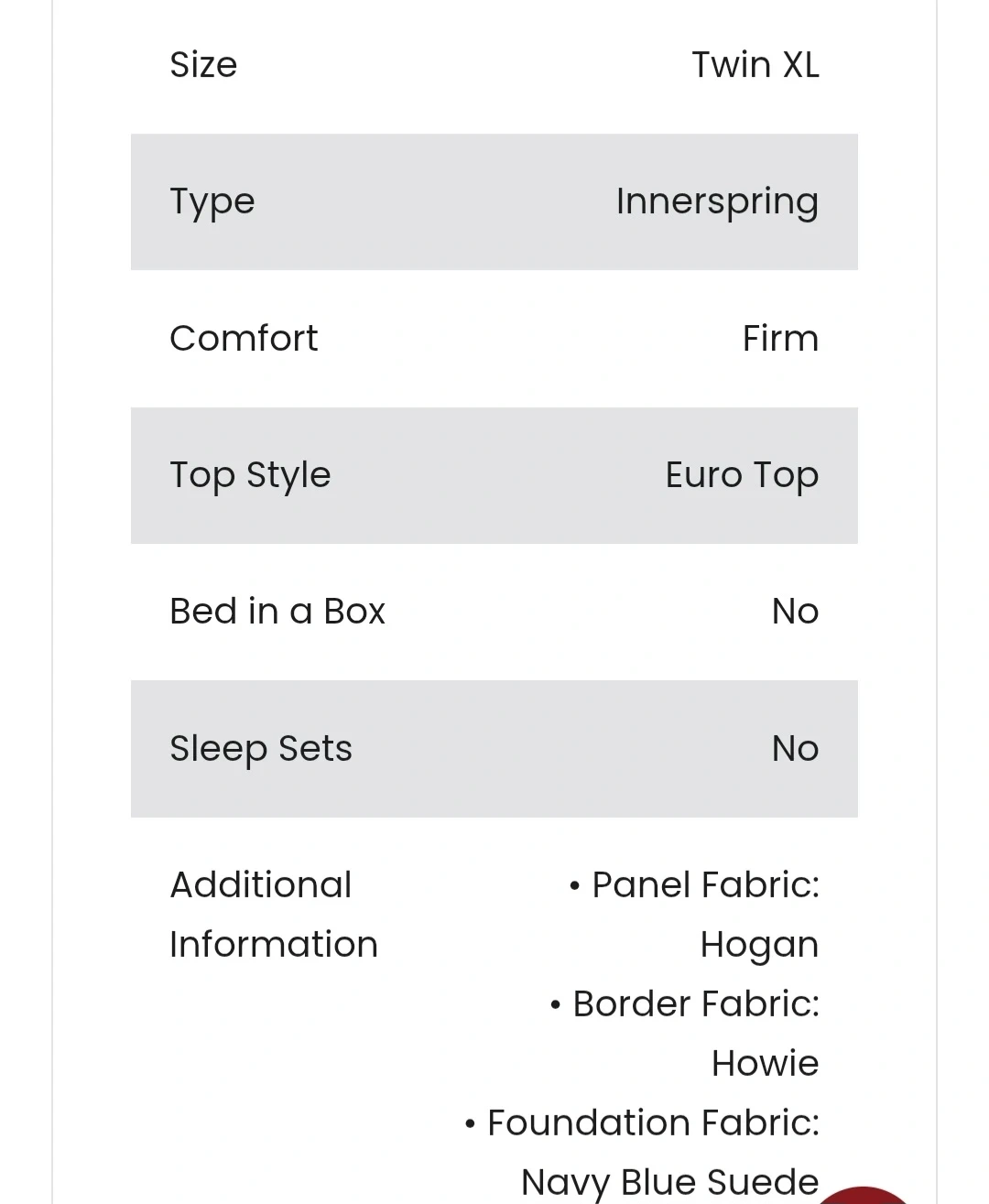 Firm innerspring mattress with a Euro Top. Panel fabric is Hogan, with Howie border fabric and a navy blue suede foundation. It's a Twin XL size mattress. Brand new.
