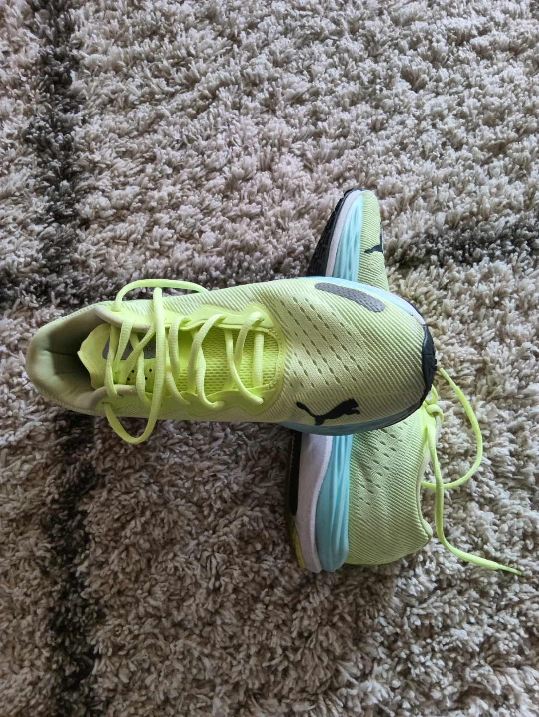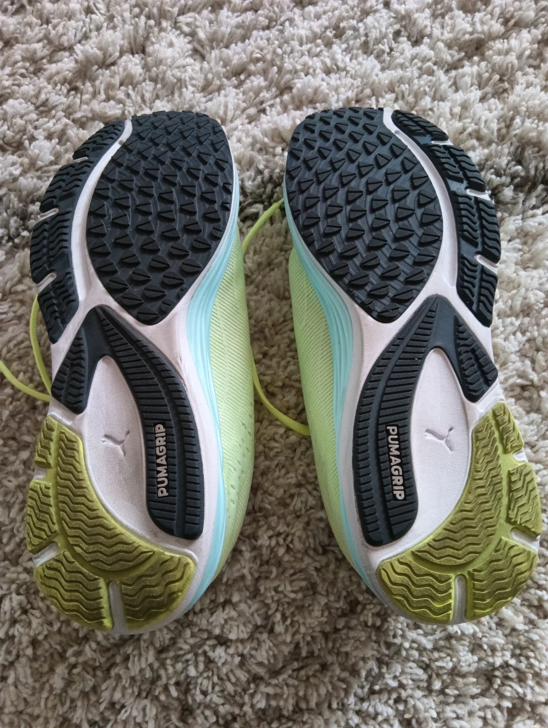 These Puma running shoes are a vibrant neon yellow. They feature a lightweight design with breathable mesh uppers. The soles have PumaGrip for excellent traction.