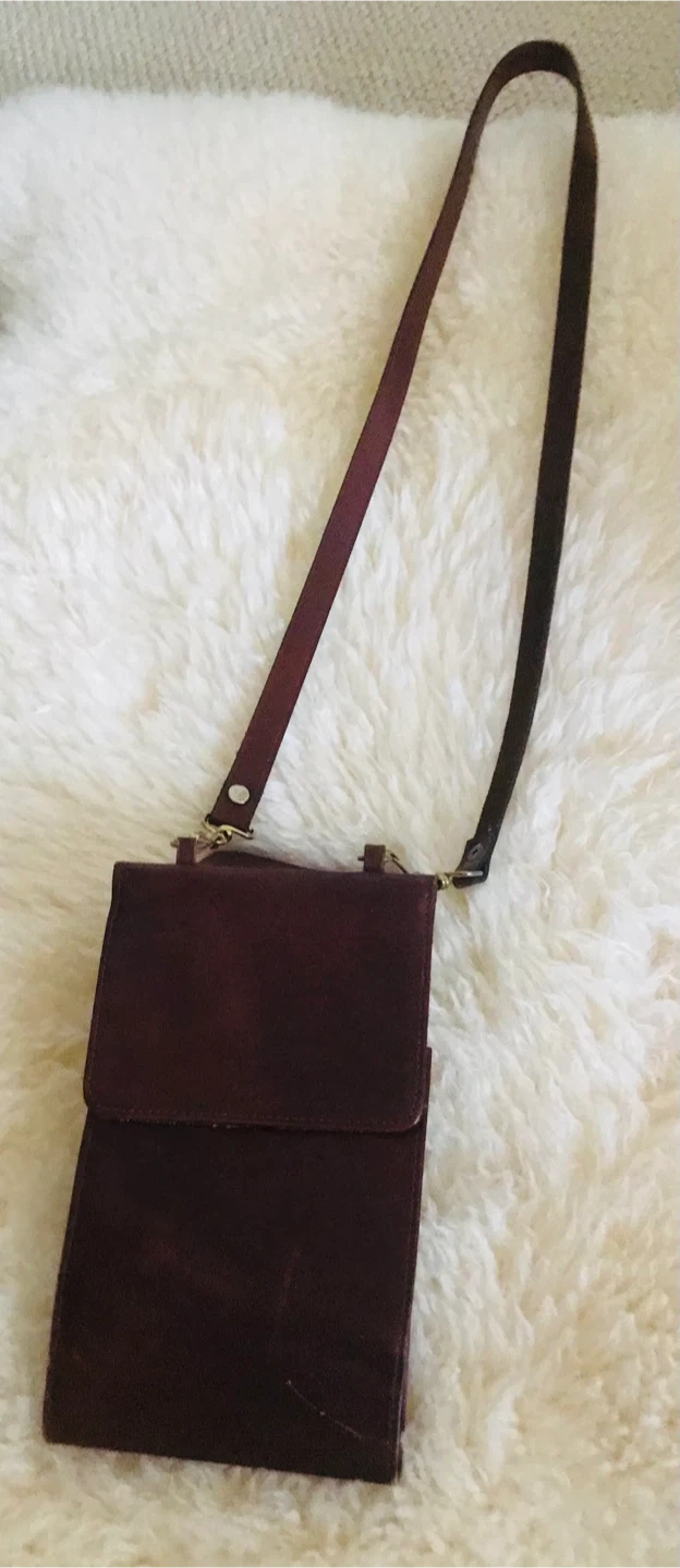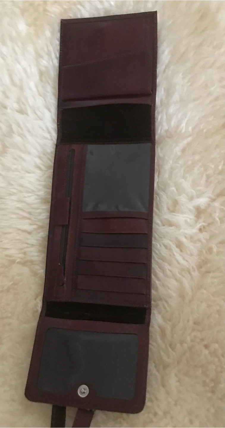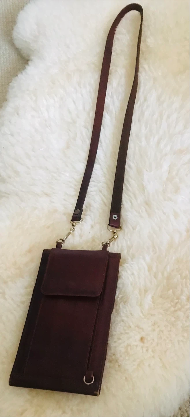 A trifold wallet made of brown leather, featuring multiple card slots and a zippered pocket. It has an adjustable strap for shoulder or crossbody wear. Perfect for keeping your essentials organized.