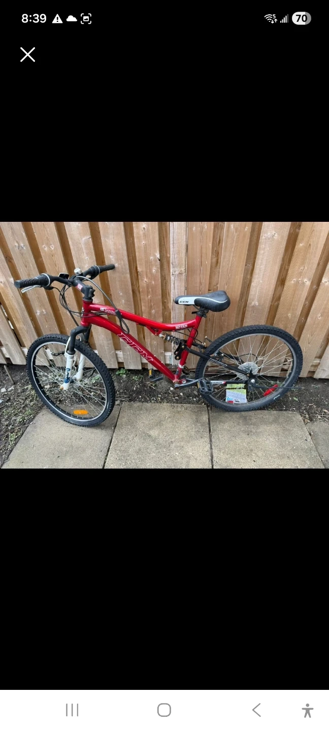 Red CCM full suspension mountain bike with front and rear shocks. It's a great ride for trails and paths. The bike is suitable for youth or smaller adults. Needs bike chain and front breaks.
