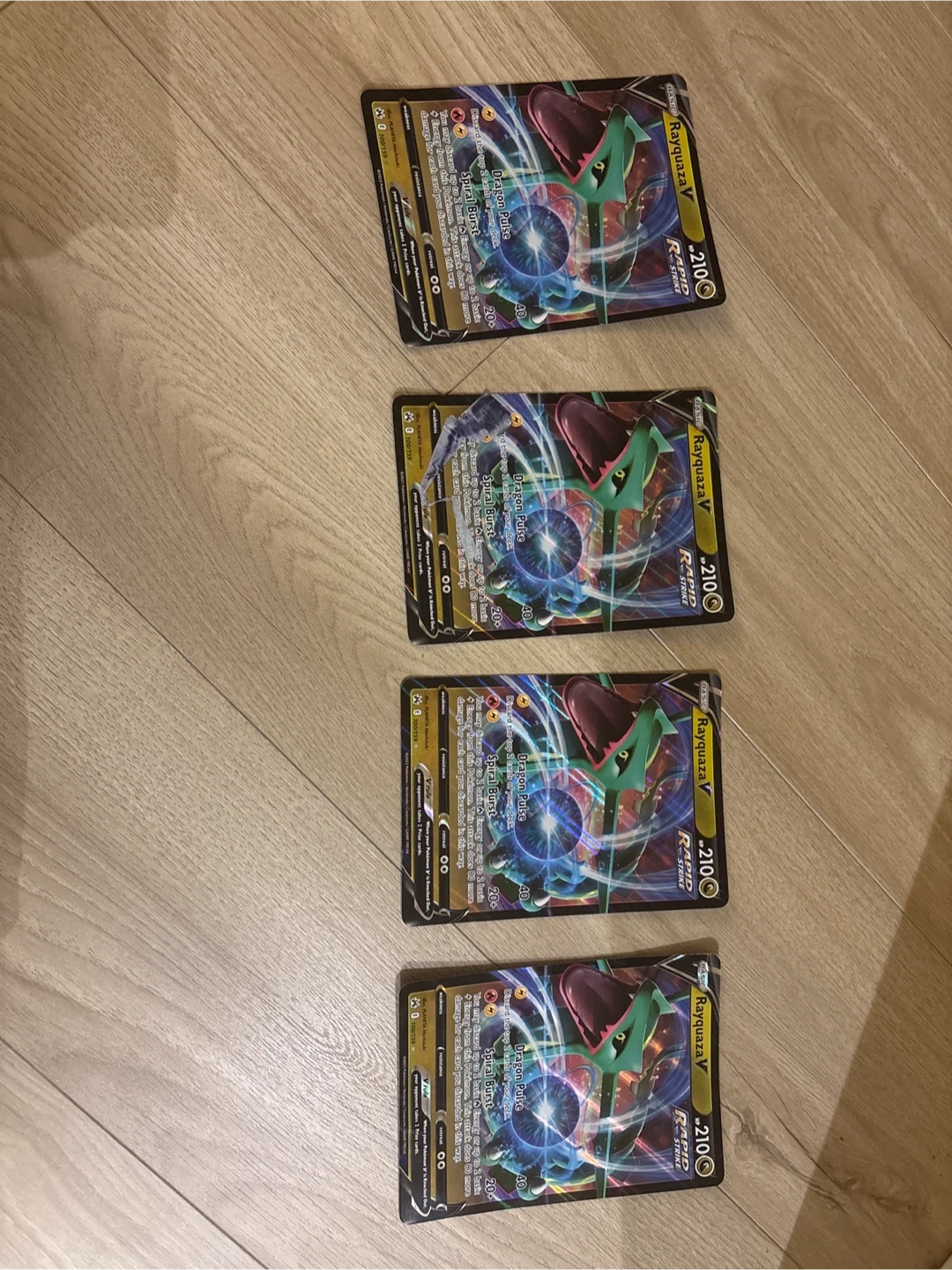 Four Pokemon TCG Rayquaza V cards included. These are the Rapid Strike style cards. They're great for collectors or players looking to build their deck. Adds value to any Pokemon card collection! And no delivery’s you have to come pick it up or we meet somewhere.