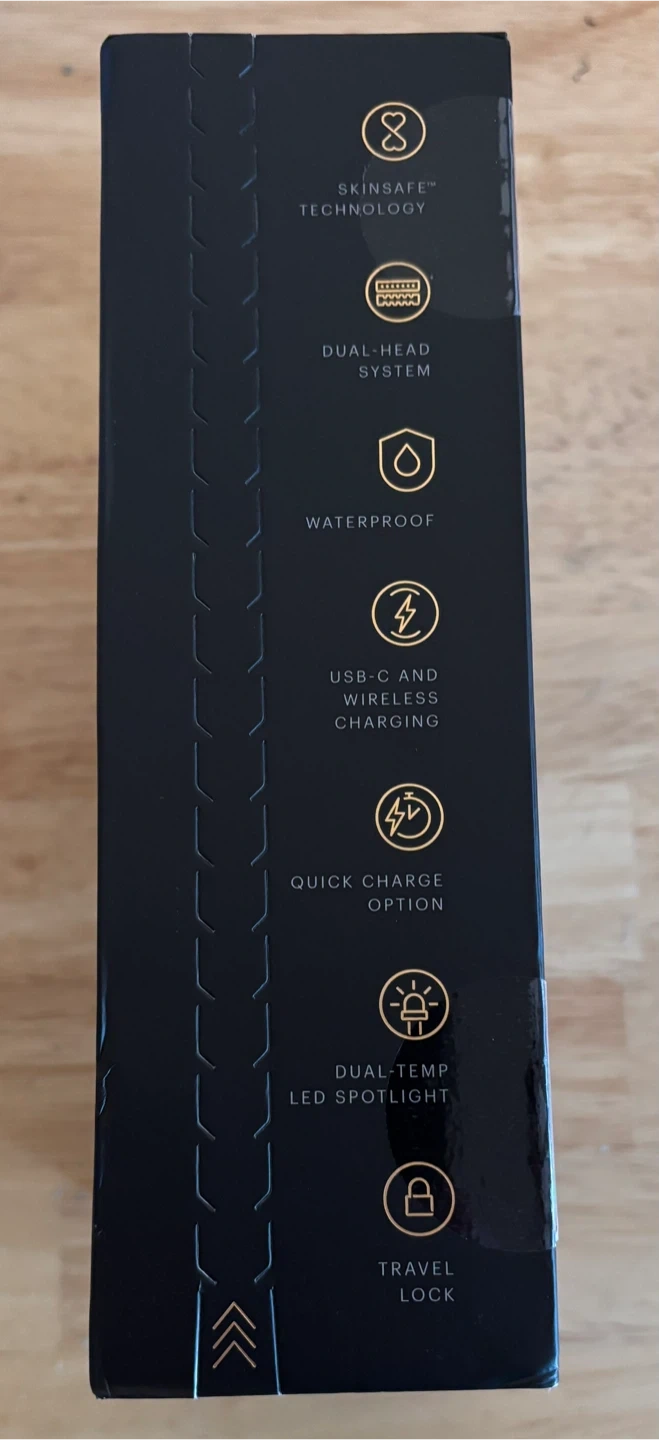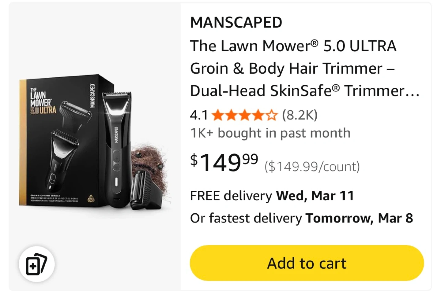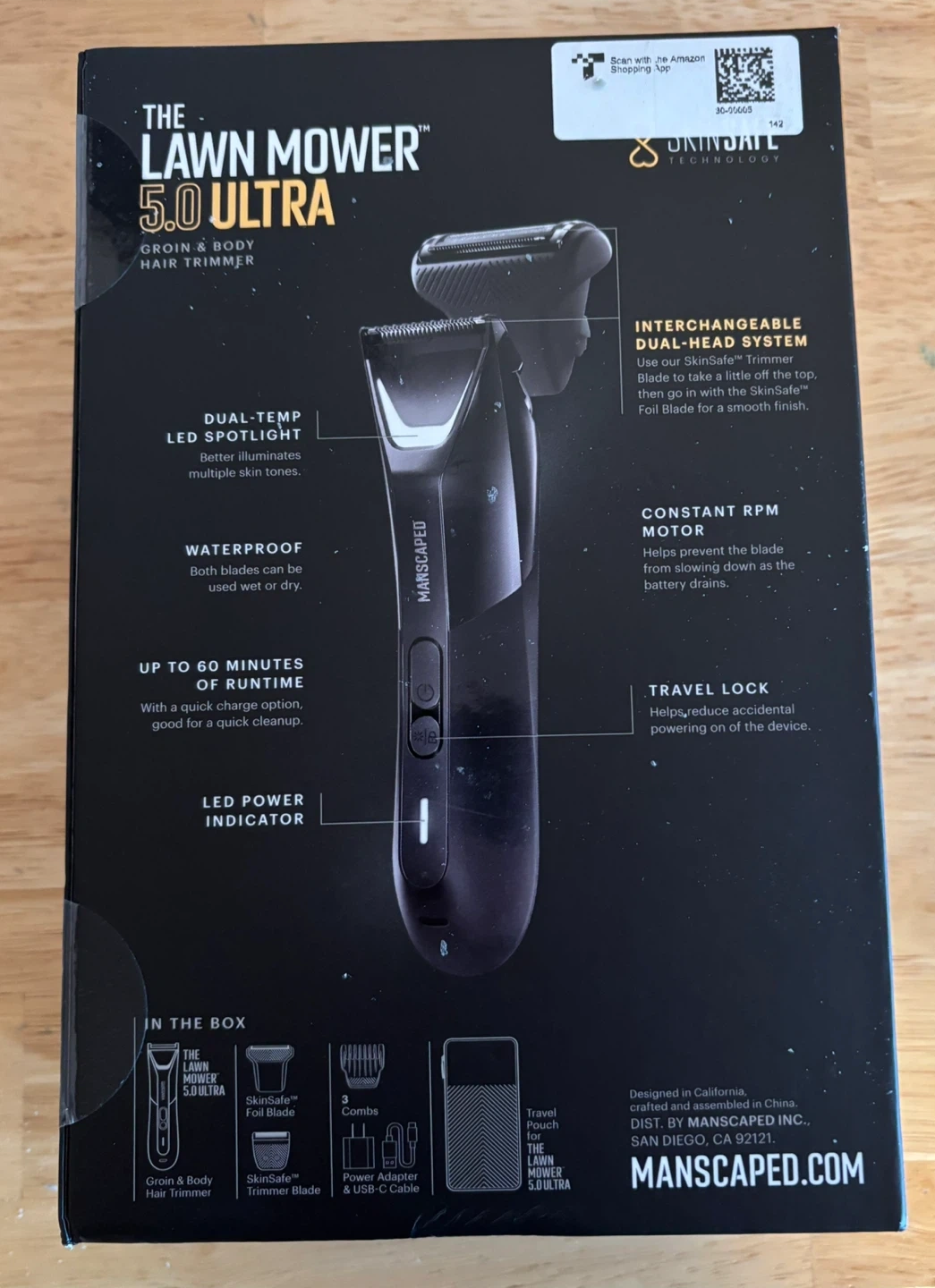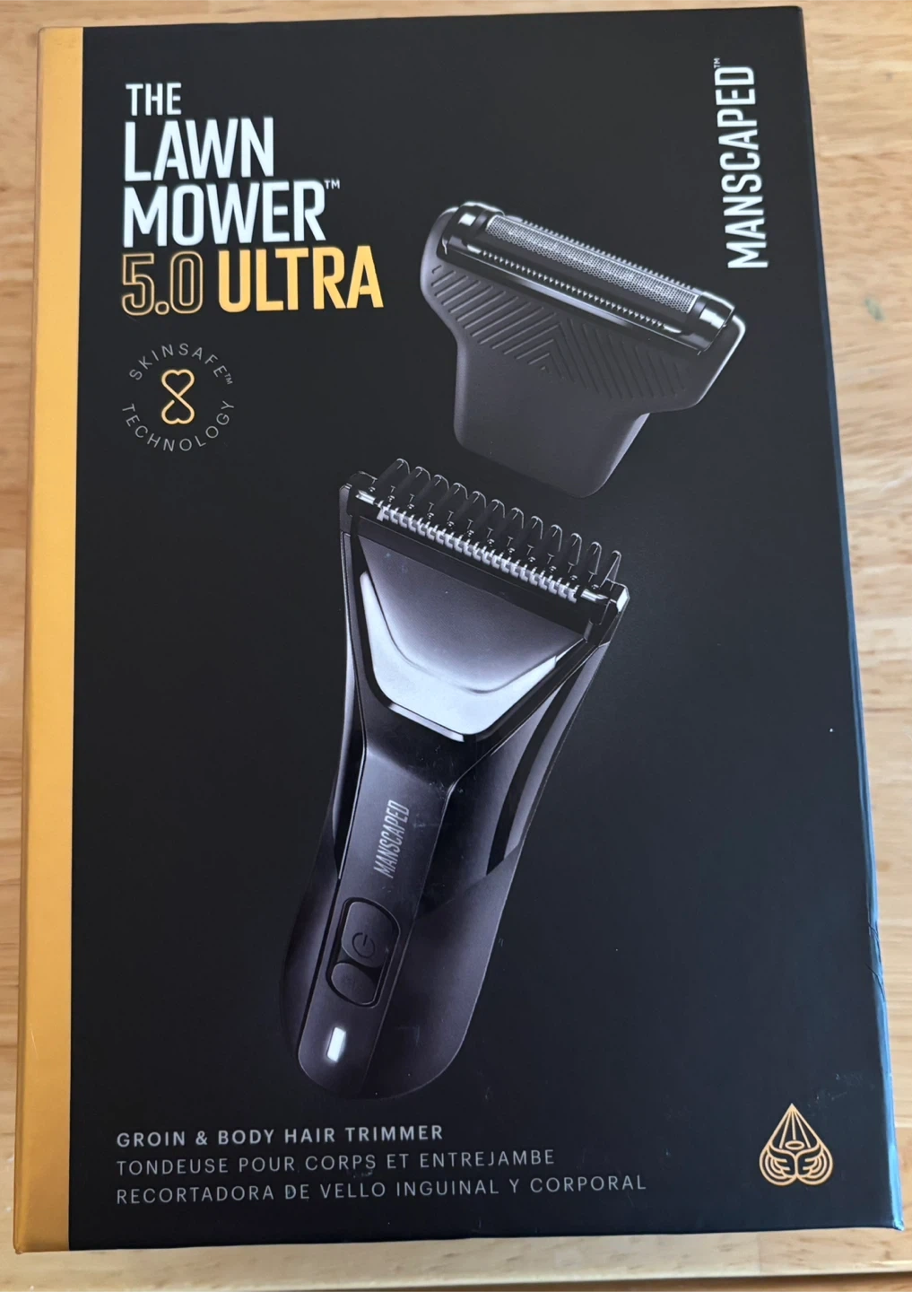 This is the MANSCAPED Lawn Mower 5.0 ULTRA, a groin and body hair trimmer. It features a dual-head system and is waterproof. It offers up to 60 minutes of runtime with a quick charge option.
