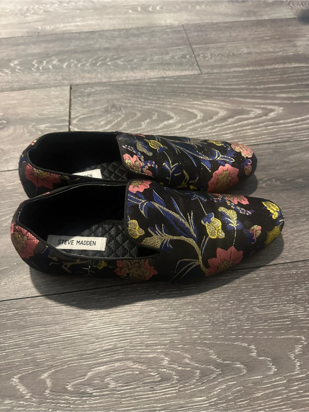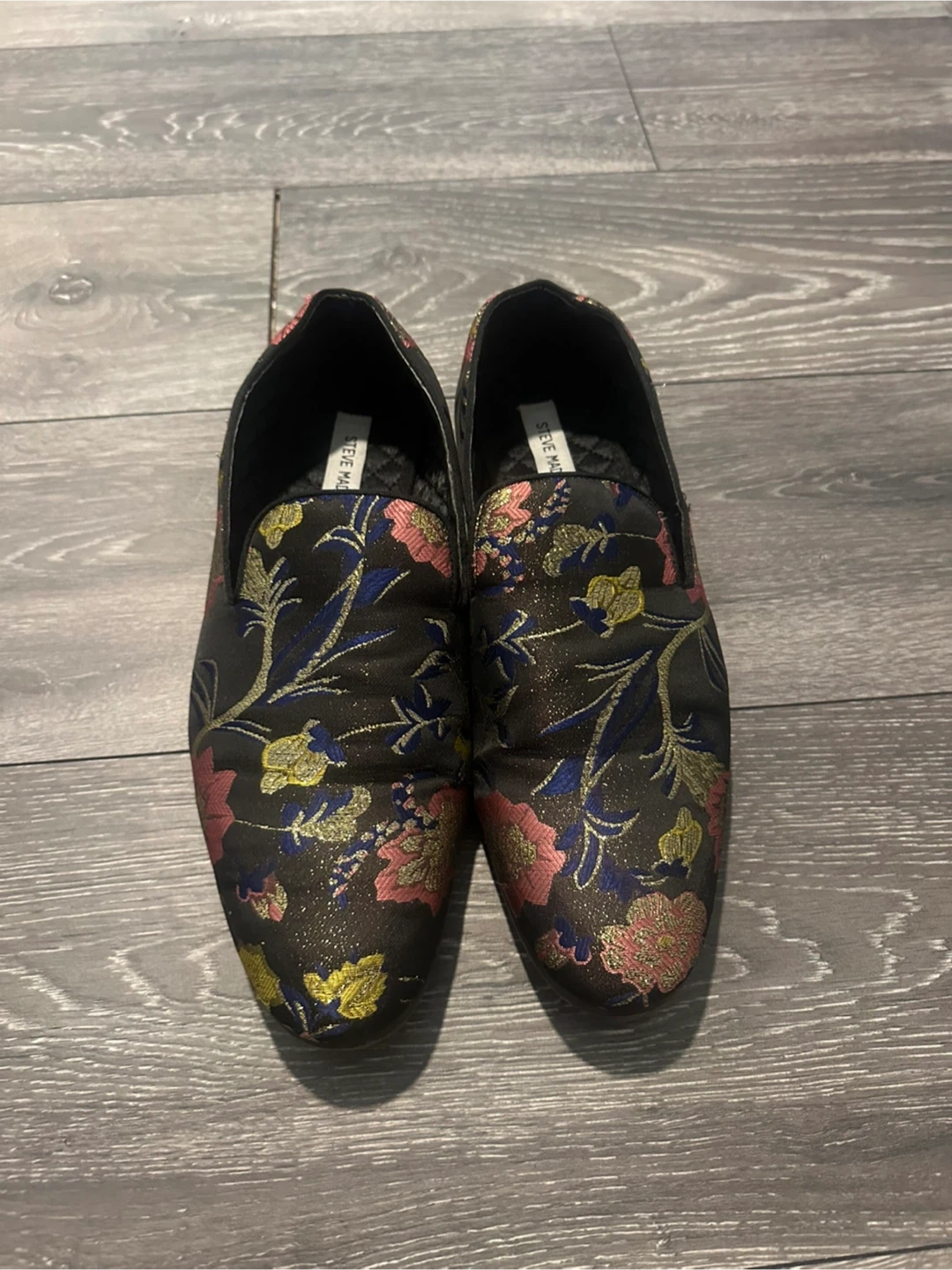 These Steve Madden loafers feature a vibrant floral brocade pattern. The shoes have a slip-on design with a cushioned interior. They're made with a textile upper and a synthetic sole.