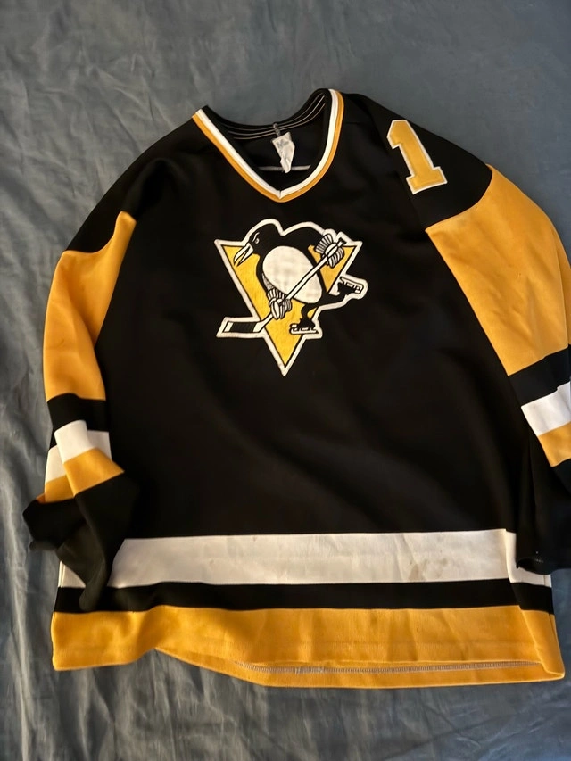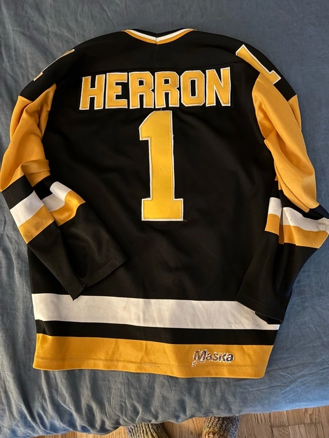 Get ready to hit the ice with this vintage Maska Pittsburgh Penguins hockey jersey, showcasing the name and number of former NHL Goaltender, Denis Herron! This unique piece of sports memorabilia is in well-used condition, perfect for die-hard fans or collectors looking to add a touch of nostalgia to their collection. If the ad is still up, then yes, it is available! Condition: Used - Good. Size: Large. Cash accepted: Yes. Payment: Cash accepted.