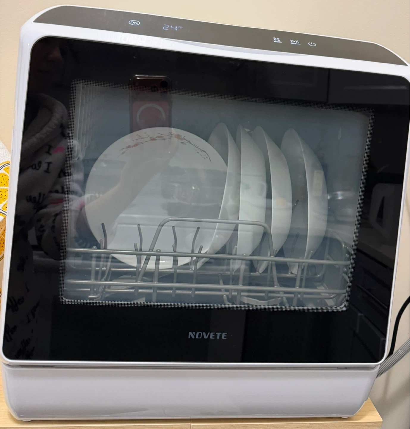 This NOVETE countertop dishwasher is perfect for small spaces. It's a compact unit designed to clean dishes efficiently. Capacity for plates, bowls, and cups.